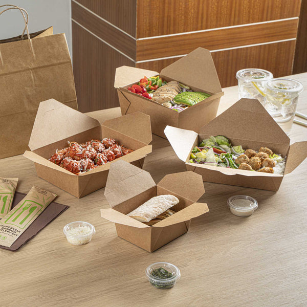 - Sturdy kraft paper material holds a variety of dishes without losing its shape