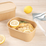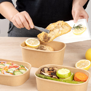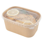Fill up our Bio Tek 34-ounce Oval Kraft Paper Serving Containers with your delicious meals. Featuring a PE lining, these take out containers are grease-resistant to keep saucy entrees and salads with dressings locked in. Pair these to go food containers with our compatible lids (SKU: RWA1054K and RWA1055C) to securely seal in side dishes and prevent messes during transport. Made from thick kraft paper, these disposable meal prep containers won't easily absorb heat from employees' or customers' hands, making them perfect for cold foods. These take out boxes are freezer-safe for storing prepped meals in your refrigerator. To save space in your storage area, these paper lunch boxes are conveniently stackable. For quick and effortless cleanup at your catered events, these paper food containers are recyclable. Containing up to 34 ounces, these take away containers measure 6.75 inches long by 4.5 inches wide and 3 inches tall. Sold in a 100 count box. Lids are available and sold separately.