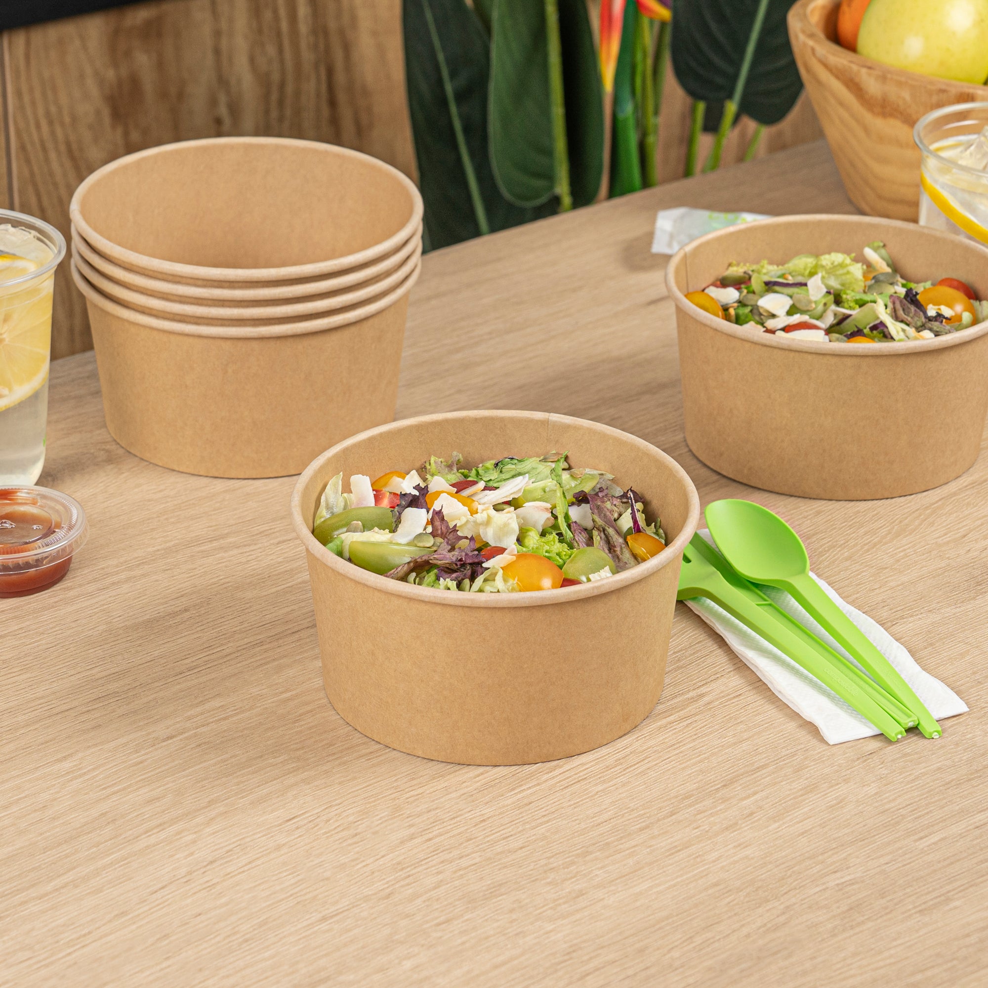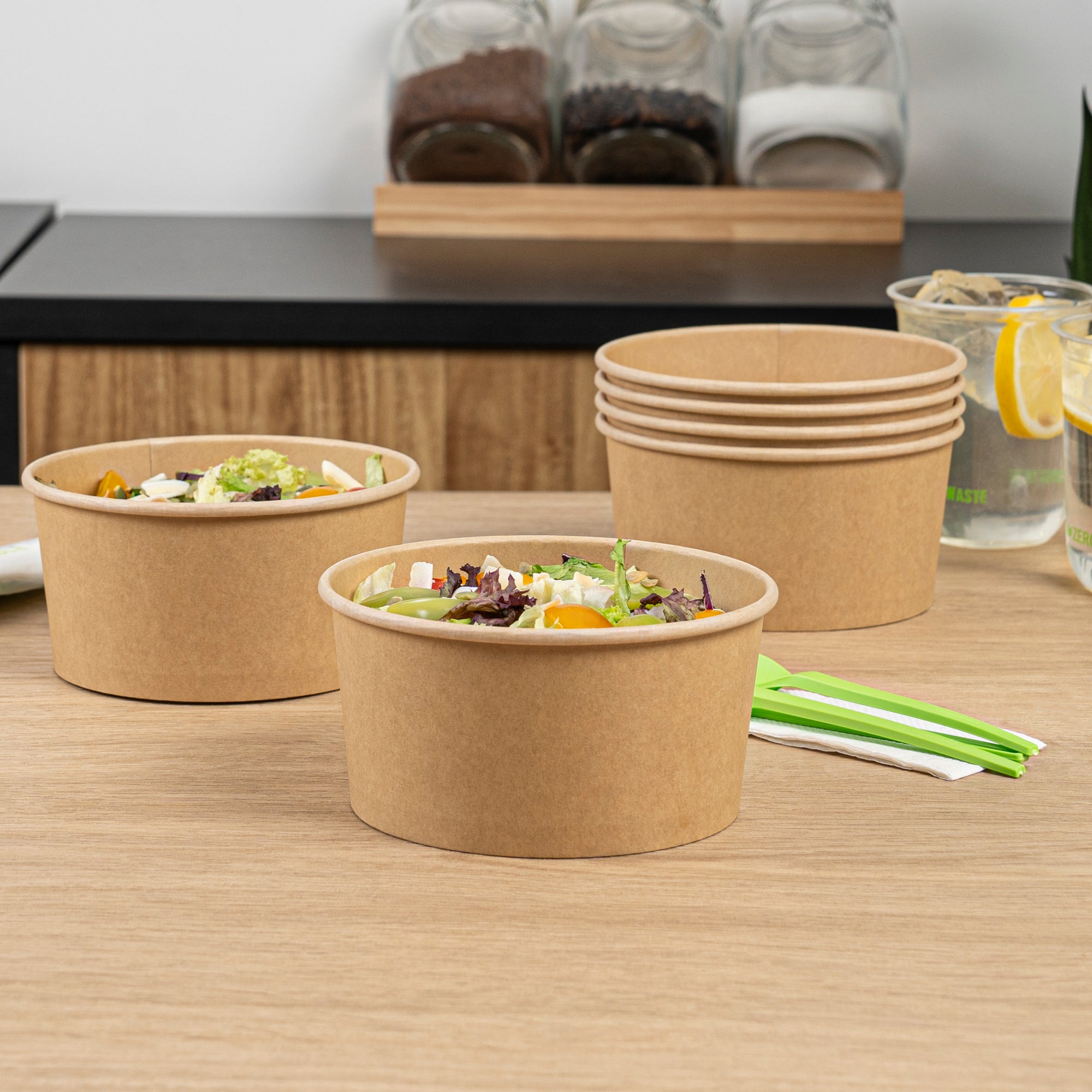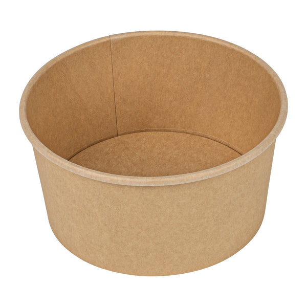 Pack you to go food orders with our Bio Tek 34-ounce Round Kraft Paper Take Out Containers. These takeaway containers pair perfectly with coordinating plastic lids (SKU: RWA1437C) to keep your culinary creations intact during transit. Featuring a grease-resistant design these take out boxes prevent sauces from soaking through and ensure a neat food presentation. These to go containers have a PP lining, making them microwave-safe and can withstand high temperatures up to 248F. Made from thick kraft paper, these carry out containers are suitable for holding various hot and cold food items. The rustic kraft finish of these take out food containers creates a charming look for your take out orders. These disposable food containers are recyclable and help minimize your carbon footprint, ideal for showcasing your eco-conscious practices to your patrons. To simplify your post-meal cleanup, these paper take out containers are disposable and can be easily discarded. Measuring 6 inches in diameter by 3 inches in height, these kraft paper containers can hold up to 34 ounces. Sold in a 200 count box. Lids are available and sold separately.
