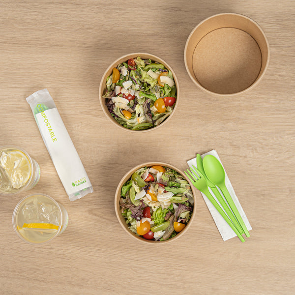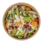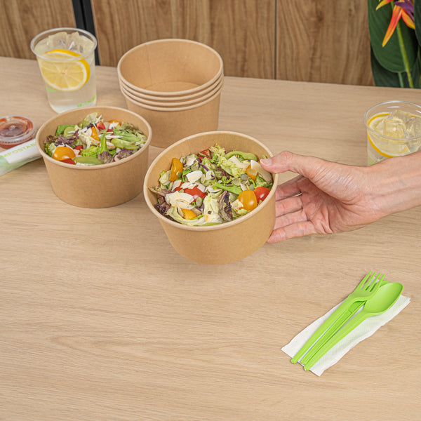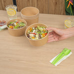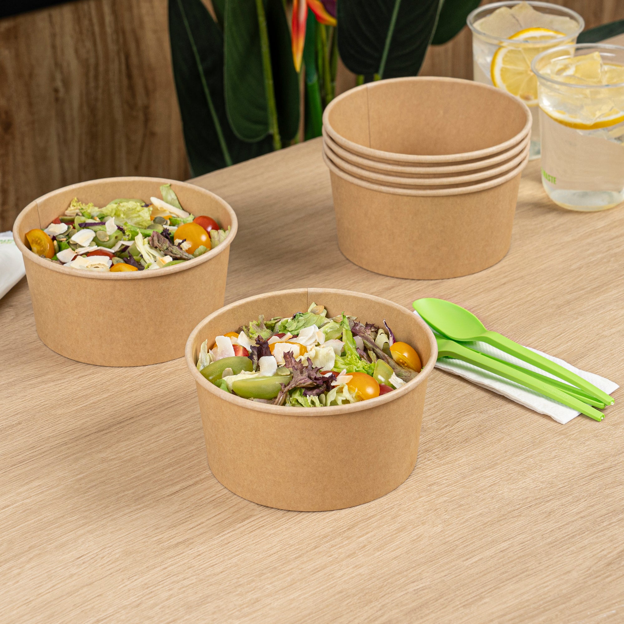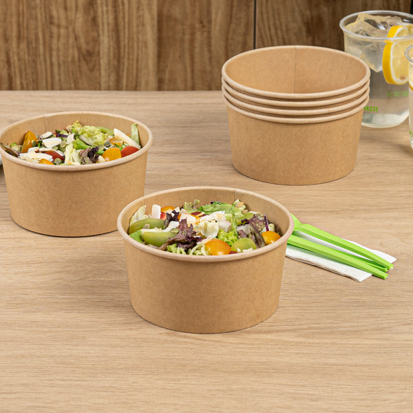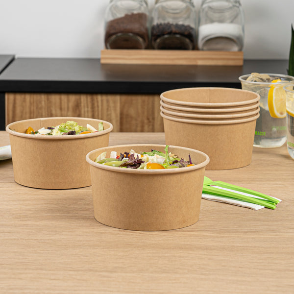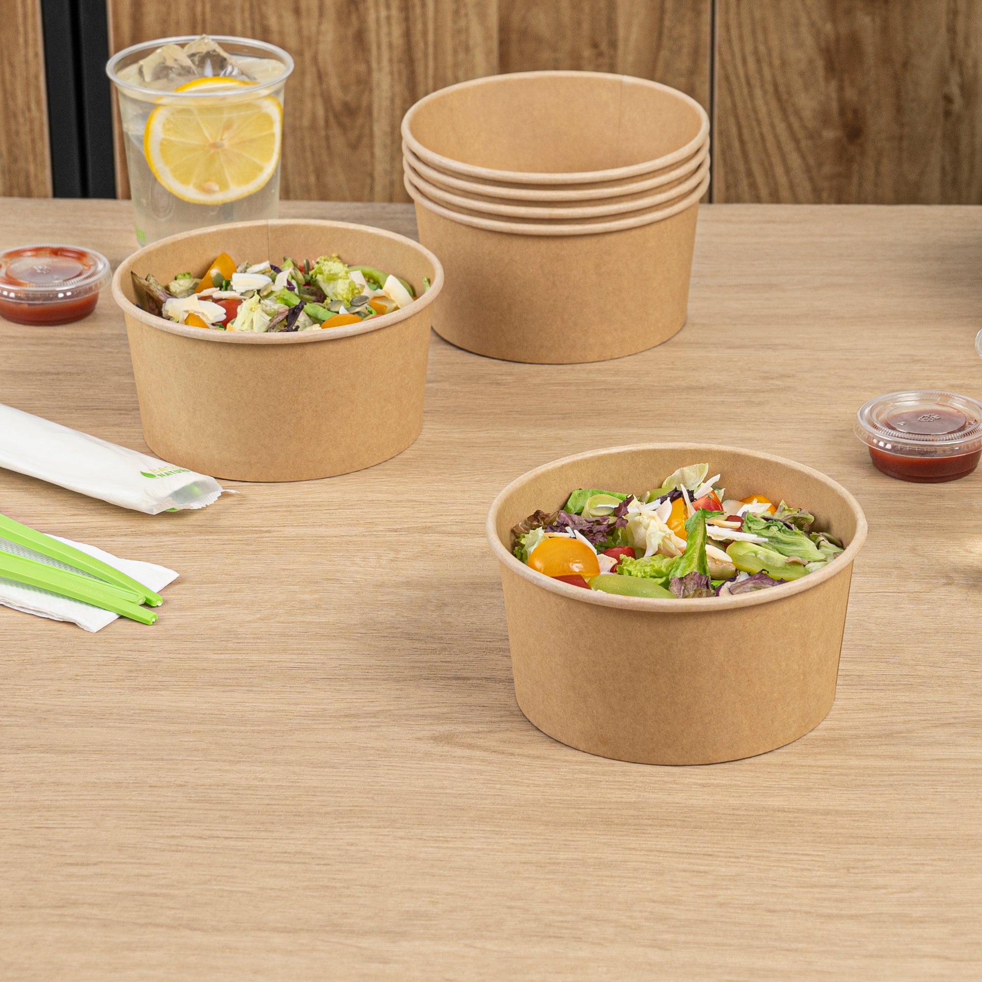 Pack you to go food orders with our Bio Tek 34-ounce Round Kraft Paper Take Out Containers. These takeaway containers pair perfectly with coordinating plastic lids (SKU: RWA1437C) to keep your culinary creations intact during transit. Featuring a grease-resistant design these take out boxes prevent sauces from soaking through and ensure a neat food presentation. These to go containers have a PP lining, making them microwave-safe and can withstand high temperatures up to 248F. Made from thick kraft paper, these carry out containers are suitable for holding various hot and cold food items. The rustic kraft finish of these take out food containers creates a charming look for your take out orders. These disposable food containers are recyclable and help minimize your carbon footprint, ideal for showcasing your eco-conscious practices to your patrons. To simplify your post-meal cleanup, these paper take out containers are disposable and can be easily discarded. Measuring 6 inches in diameter by 3 inches in height, these kraft paper containers can hold up to 34 ounces. Sold in a 200 count box. Lids are available and sold separately.