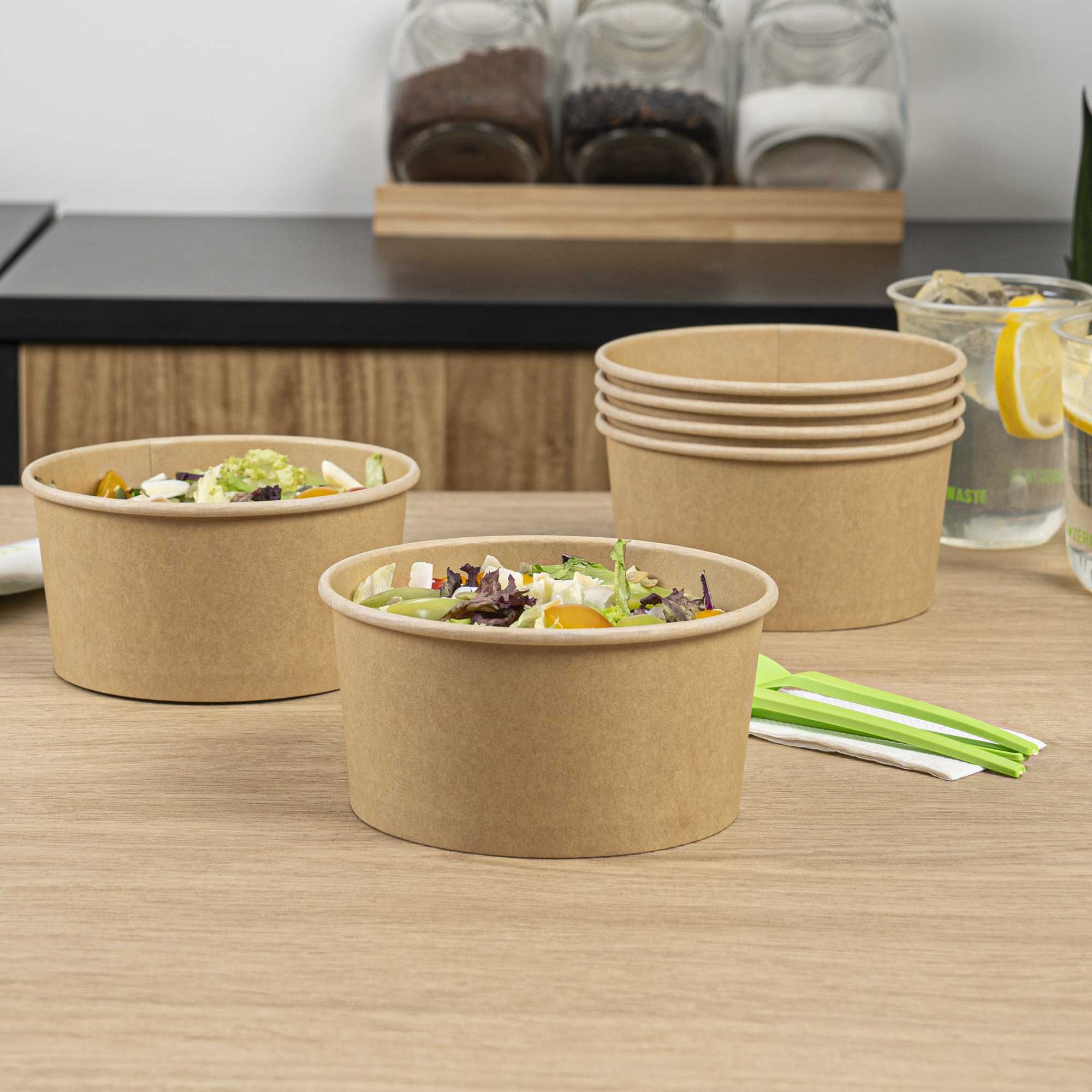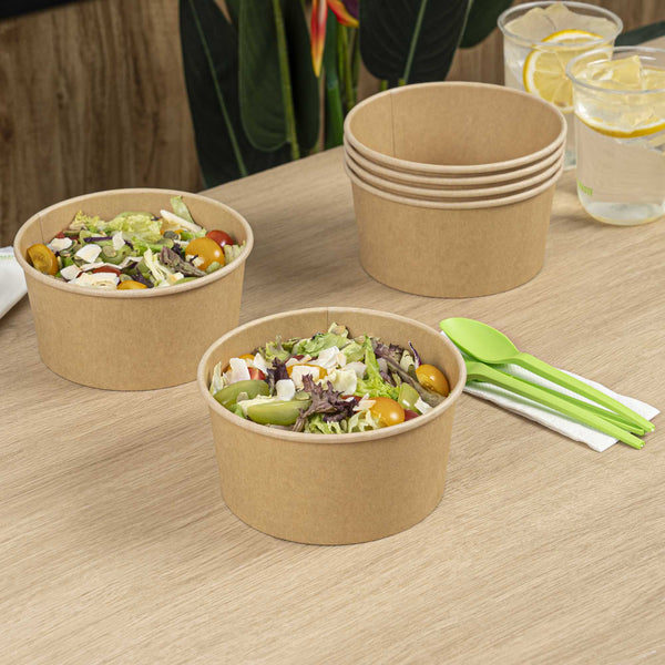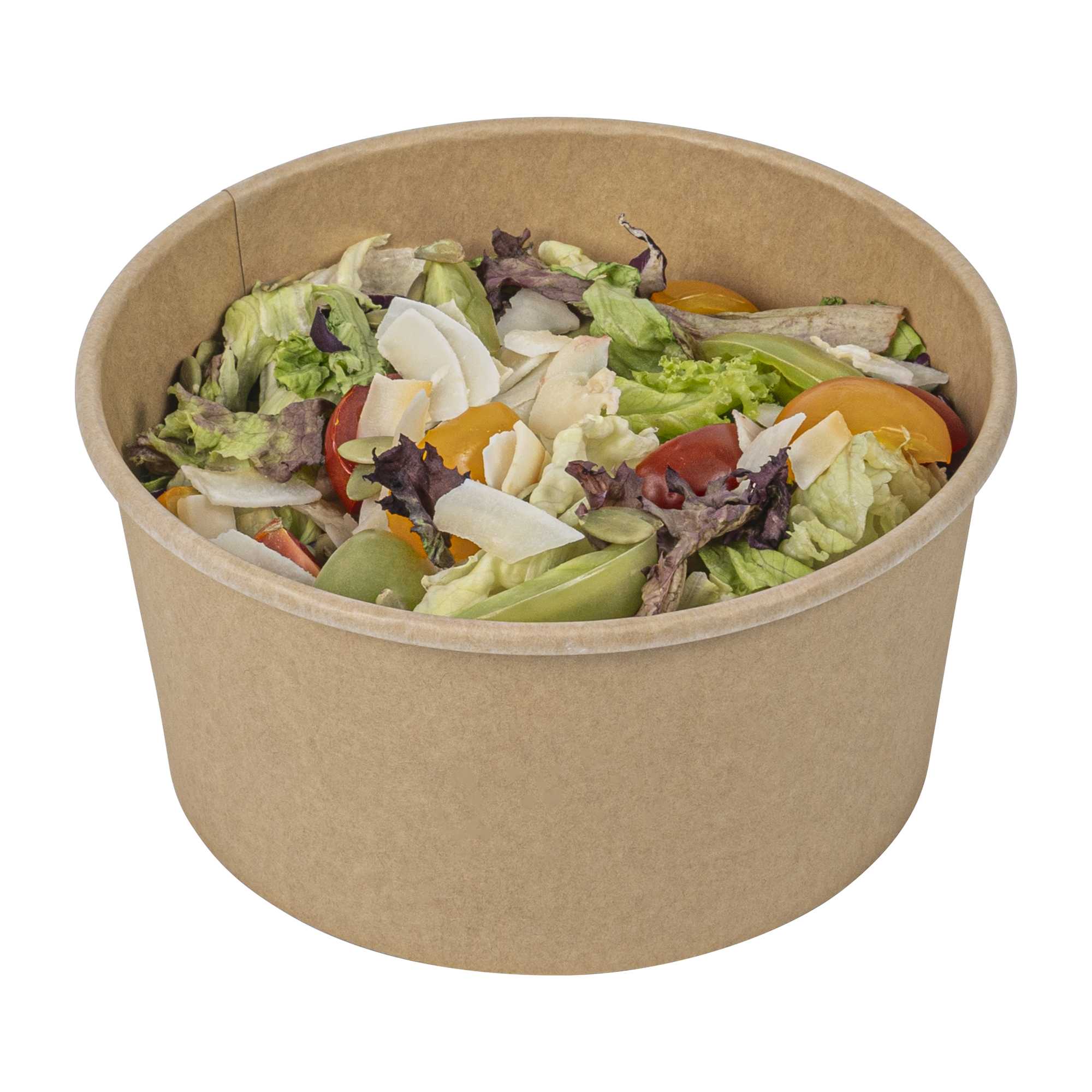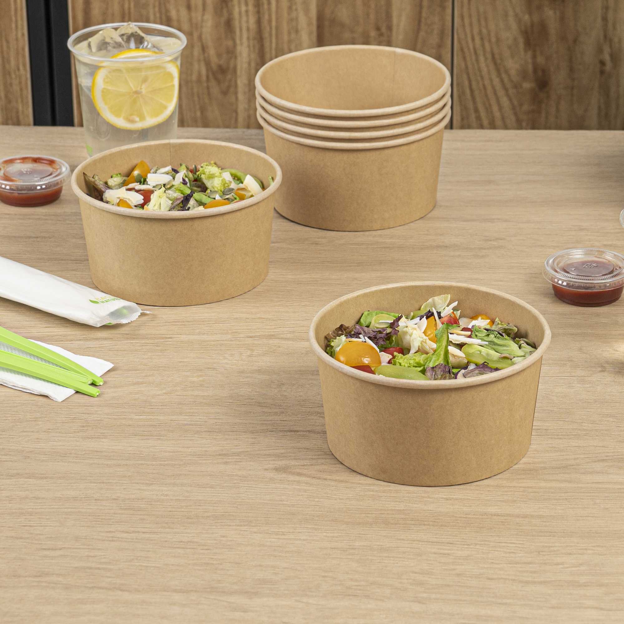 Pack you to go food orders with our Bio Tek 34-ounce Round Kraft Paper Take Out Containers. These takeaway containers pair perfectly with coordinating plastic lids (SKU: RWA1437C-50) to keep your culinary creations intact during transit. Featuring a grease-resistant design these take out boxes prevent sauces from soaking through and ensure a neat food presentation. These to go containers have a PP lining, making them microwave-safe and can withstand high temperatures up to 248F. Made from thick kraft paper, these carry out containers are suitable for holding various hot and cold food items. The rustic kraft finish of these take out food containers creates a charming look for your take out orders. These disposable food containers are recyclable and help minimize your carbon footprint, ideal for showcasing your eco-conscious practices to your patrons. To simplify your post-meal cleanup, these paper take out containers are disposable and can be easily discarded. Measuring 6 inches in diameter by 3 inches in height, these kraft paper containers can hold up to 34 ounces. Sold in a 50 count box. Lids are available and sold separately.