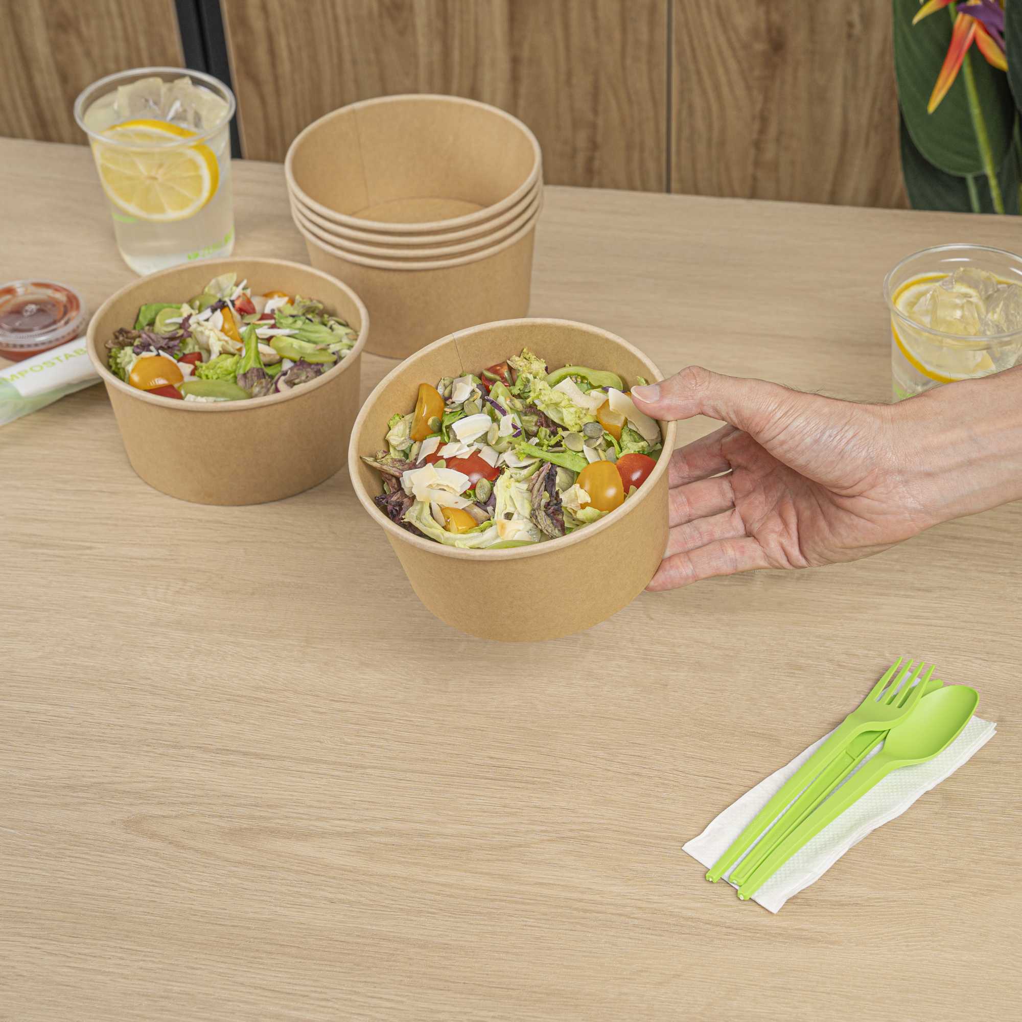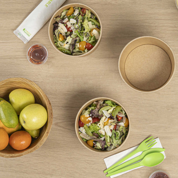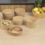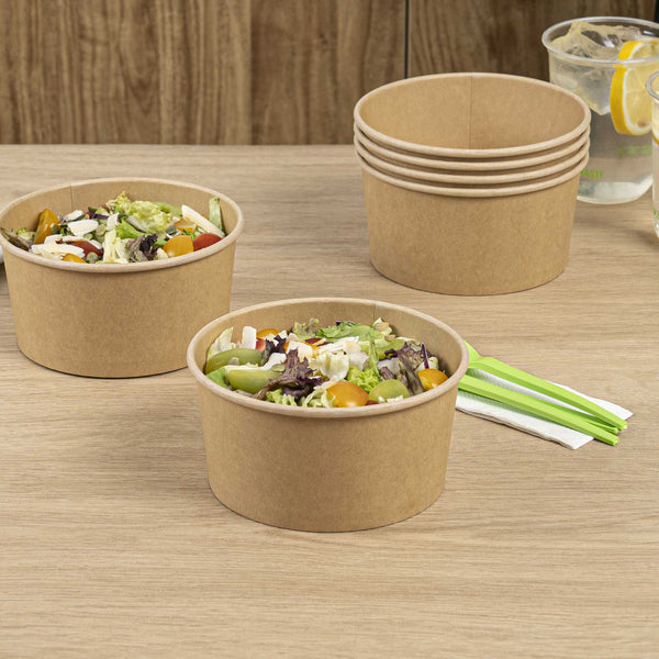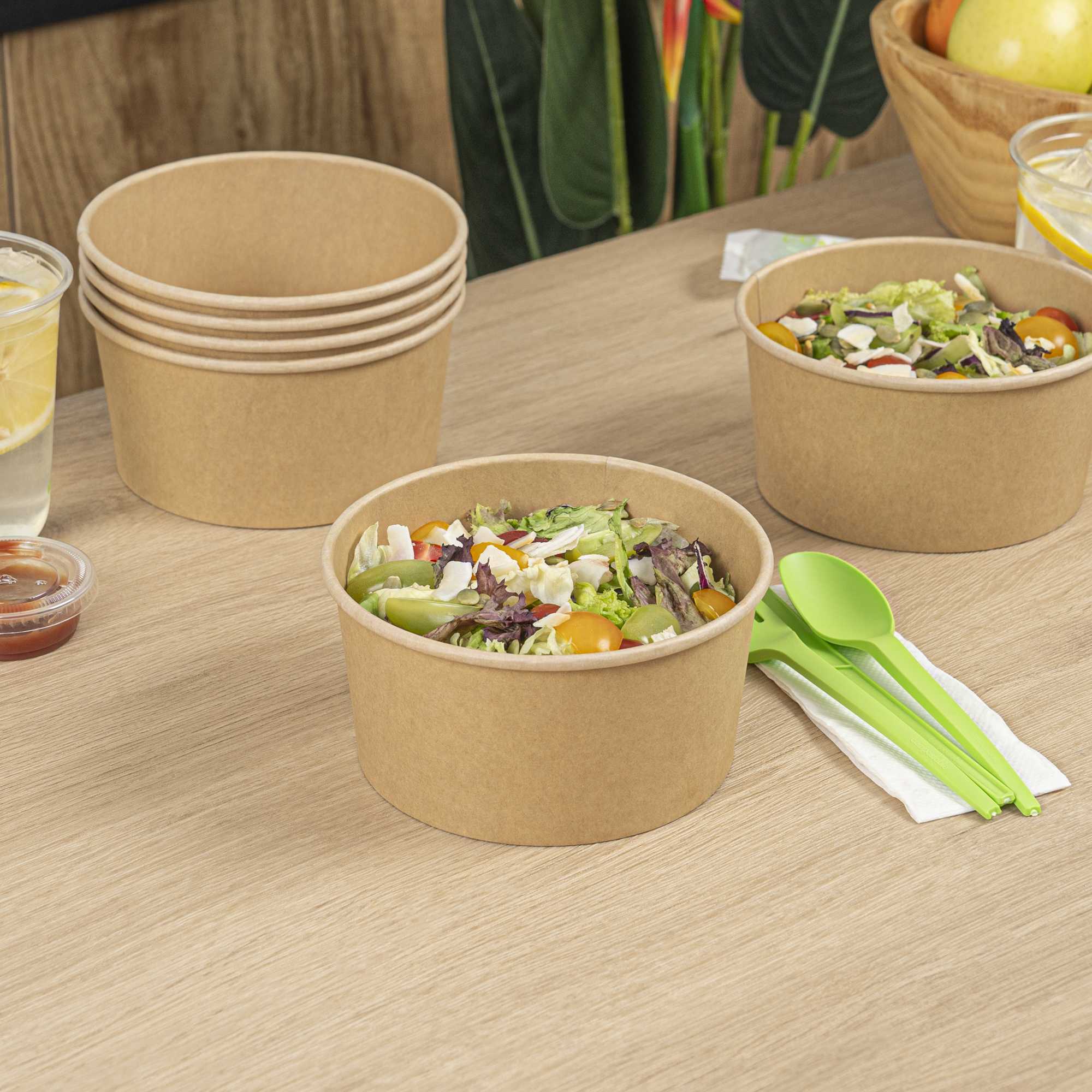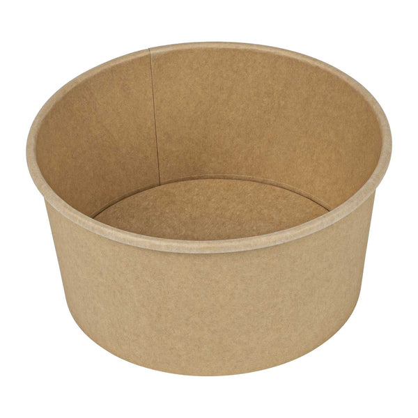 Pack you to go food orders with our Bio Tek 34-ounce Round Kraft Paper Take Out Containers. These takeaway containers pair perfectly with coordinating plastic lids (SKU: RWA1437C-50) to keep your culinary creations intact during transit. Featuring a grease-resistant design these take out boxes prevent sauces from soaking through and ensure a neat food presentation. These to go containers have a PP lining, making them microwave-safe and can withstand high temperatures up to 248F. Made from thick kraft paper, these carry out containers are suitable for holding various hot and cold food items. The rustic kraft finish of these take out food containers creates a charming look for your take out orders. These disposable food containers are recyclable and help minimize your carbon footprint, ideal for showcasing your eco-conscious practices to your patrons. To simplify your post-meal cleanup, these paper take out containers are disposable and can be easily discarded. Measuring 6 inches in diameter by 3 inches in height, these kraft paper containers can hold up to 34 ounces. Sold in a 50 count box. Lids are available and sold separately.
