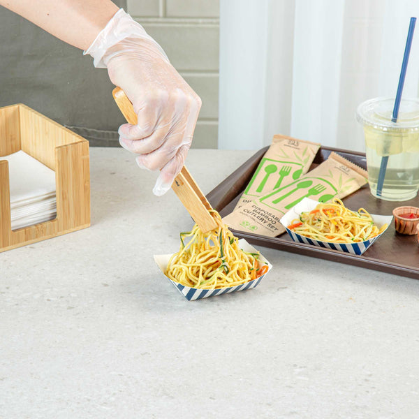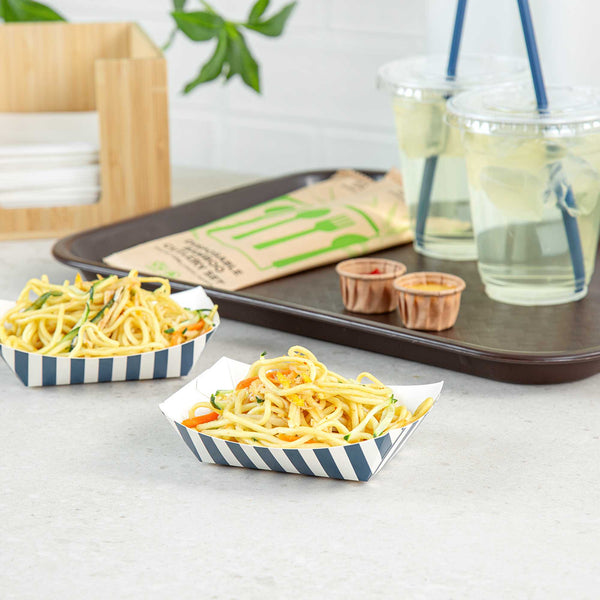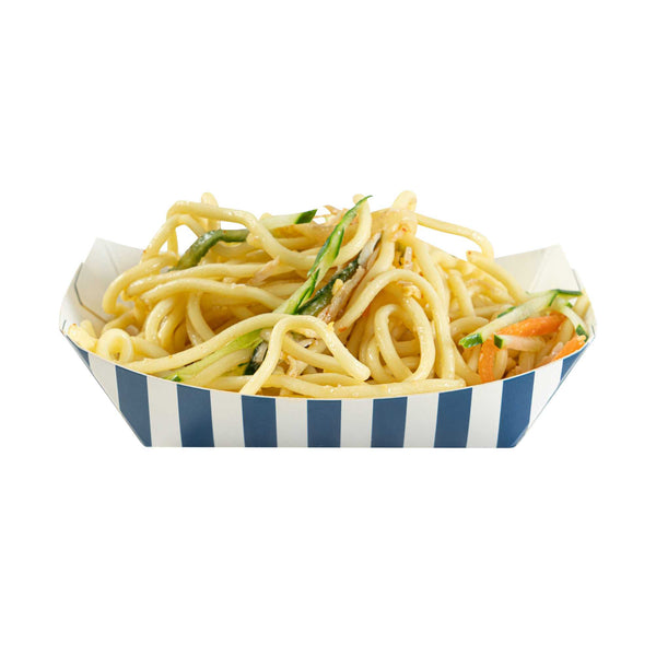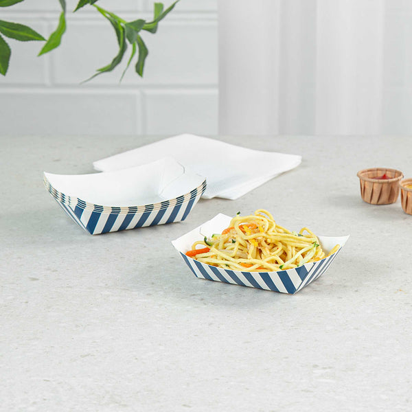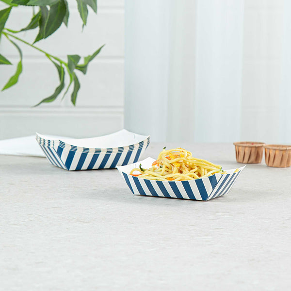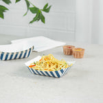 Discover the pinnacle of convenience with our Bio Tek 4-ounce Blue and White Stripe Paper #25 Food Tray / Boats. Crafted from premium, recyclable paper, these cardboard snack trays boast sturdy bases and robust walls, the ideal solution for mess-free indulgence on the move. Serve up delectable side dishes, finger foods, and appetizers with ease using these small paper food trays. After events, these disposable paper food boats facilitate effortless cleaning. Featuring a greaseproof lining, these small food boats conveniently dish out sweet potato fries at your food truck and present appetizers without any unsightly oil splotches. The trendy blue and white striped design enhances the charm, making them a hit at weddings, corporate events, cocktail gatherings, and catered functions. Measuring 3 inches long by 2 inches wide by 1 inch tall, these #25 paper food trays can hold up to 4 ounces. Sold in a 50 count box.