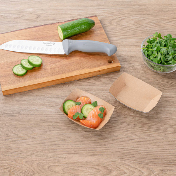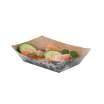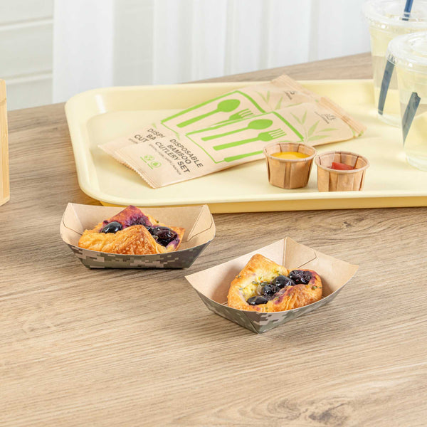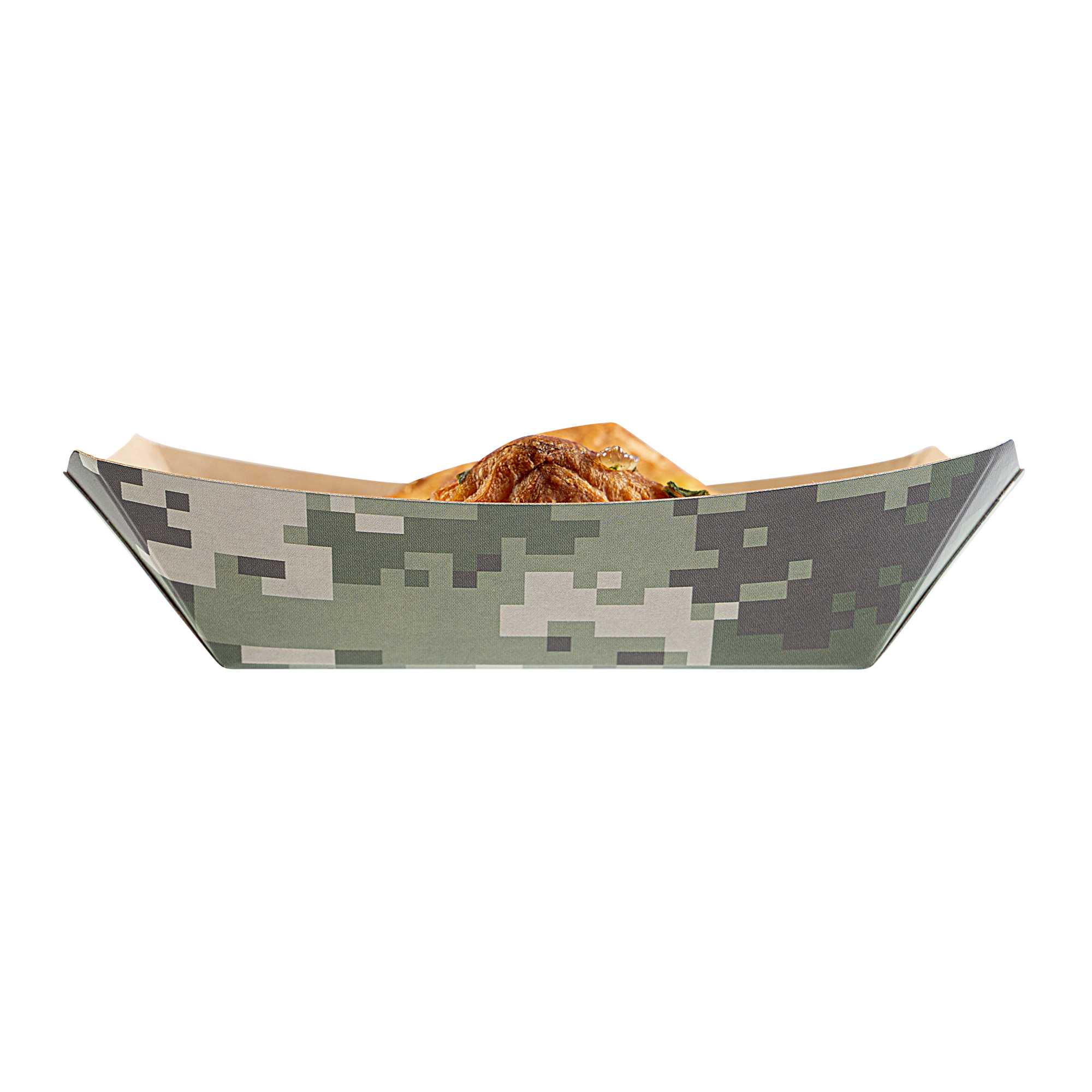 Embark on a journey of convenience with our Bio Tek 4-ounce Camouflage Paper #25 Food Tray / Boats. Crafted from premium greaseproof paper, these cardboard snack trays feature robust bases and sturdy walls, providing an effortless way to relish side dishes, finger foods, and appetizers while on the move. Employ these small paper food trays to effortlessly serve sweet potato fries at your food truck or showcase your restaurant's prized appetizers at tastings. These disposable paper food boats take the hassle out of post-event cleanup. The camouflage design of these premium paper boats adds a unique touch, ensuring their appeal at weddings, corporate luncheons, cocktail affairs, and other catered gatherings. Measuring 3 inches long by 2 inches wide by 1 inch tall, these #25 paper food trays hold up to 4 ounces. Sold in a 400 count box.