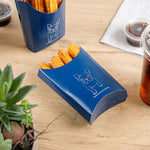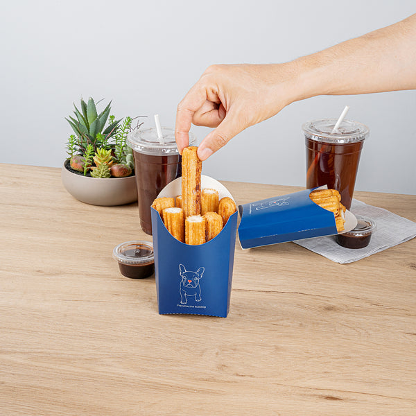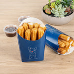 Organize your takeaway snacks without hassle using our Bio Tek Frenchie Paper Fry Cups / Snack Containers. Equipped with a greaseproof lining, these disposable fries containers prevent sauce and oil leakage, ensuring a clean and mess-free experience. Designed with a wide, angular rim, these fry portion cups simplify the scoping process. Constructed with superior paper material, they provide a comfortable, cool-to-touch exterior. These snack holders boast a stylish Frenchie design enhancing your presentation. Stacking is straightforward for efficient packaging, and they are recyclable, ensuring ease during disposal. Measuring 4.75 inches long by 3.5 inches wide by 5 inches tall, these cups have a 4-ounce capacity. Sold in a 100 count box.