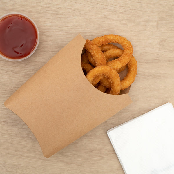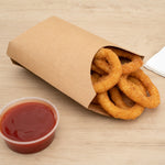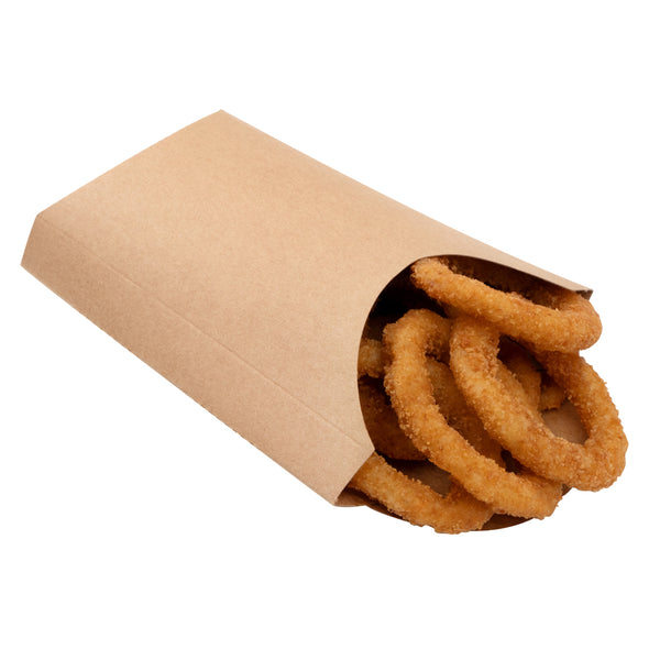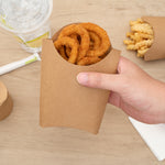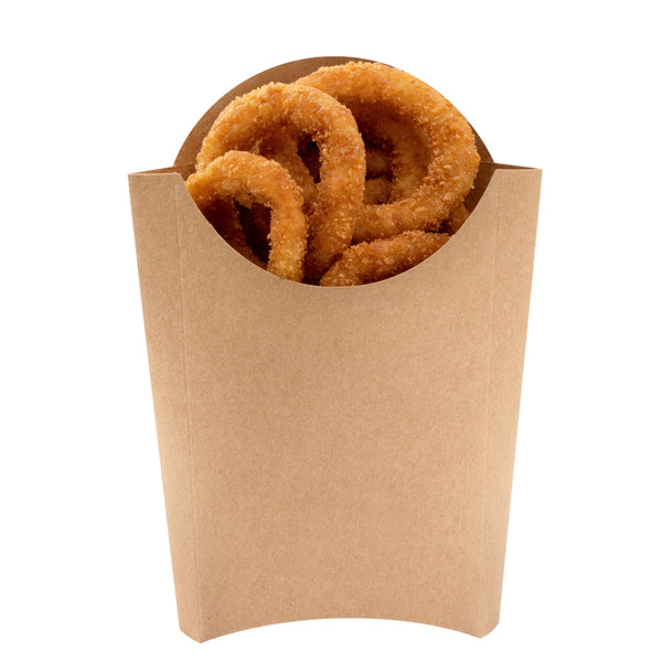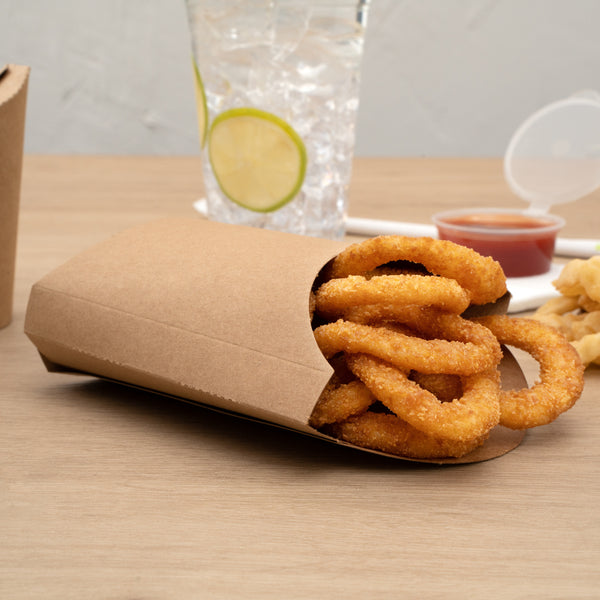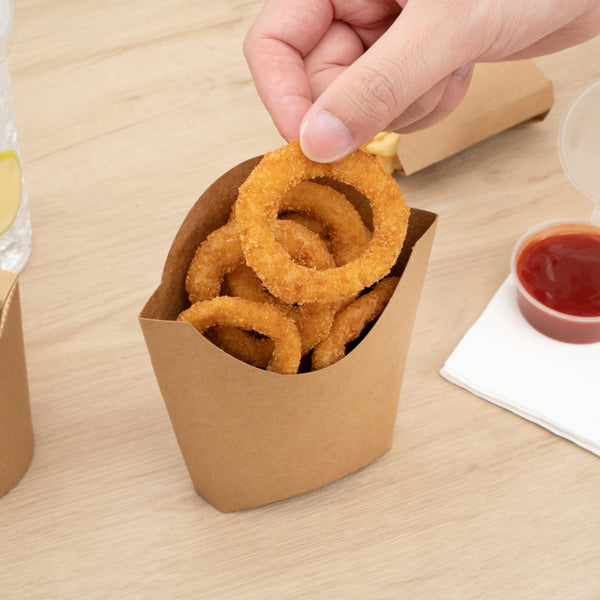 Effortlessly serve snacks with the Bio Tek Angled Rim Fry Cup. This kraft paper fry cup features a wide and angled rim, allowing you to easily scoop food and quickly serve guests, streamlining your operation. Made from premium paper, this paper snack container offers a strong and sturdy construction for secure snack transport, perfect for on-the-go dining experiences. It accommodates both hot and cold foods, making it an ideal french fry holder for foodservice professionals seeking versatility. With dimensions of 4.8 inches by 3.5 inches by 5.1 inches, the compact size ensures portion control, while the grease-resistant lining maintains a clean presentation. Enhance your foodservice efficiency with this eco-friendly and recyclable paper container. Each order includes 100 Bio Tek Angled Rim Fry Cup.