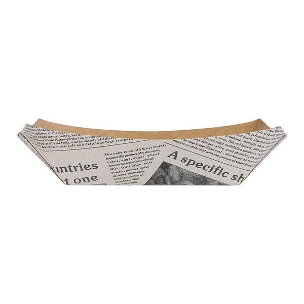 Elevate your catering game with our Bio Tek 4-ounce Newsprint Paper #25 Food Tray / Boats. Crafted from premium greaseproof paper, these cardboard snack trays feature sturdy bases and strong walls, ensuring a mess-free solution for enjoying side dishes, finger foods, and appetizers on the move. Utilize these small paper food trays to serve up sweet potato fries at your food truck or to present elegant portions of your signature appetizers. Make post-event cleaning a simple task with these disposable paper food boats. The rustic newsprint design adds an enchanting touch, making them an excellent choice for weddings, corporate luncheons, cocktail parties, and other catered events. Measuring 3 inches long by 2 inches wide by 1 inch tall, these #25 paper food trays hold up to 4 ounces. Sold in a 400 count box.