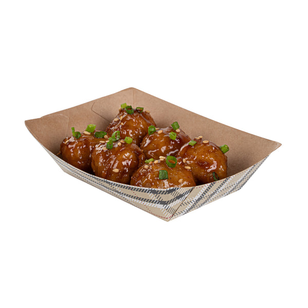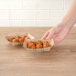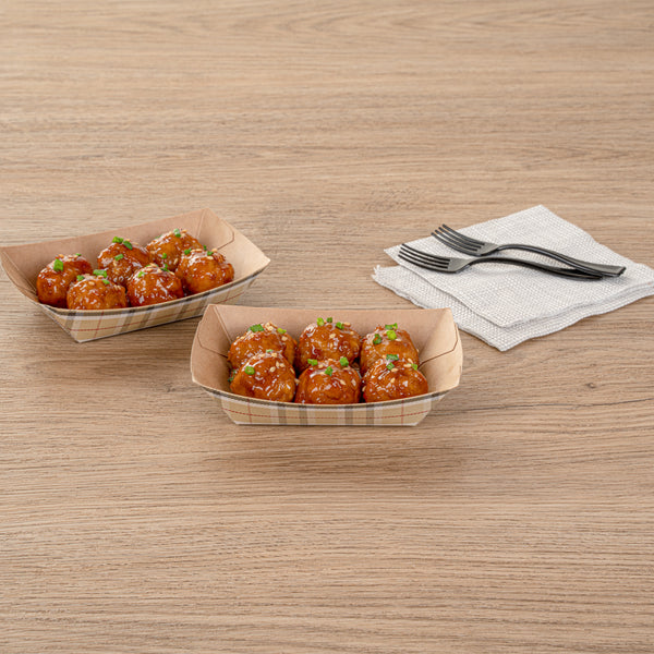 Elevate your catering prowess with our Bio Tek 4-ounce Plaid Paper #25 Food Tray / Boats. Crafted from premium greaseproof paper, these cardboard snack trays boast sturdy bases and resilient walls, ensuring a mess-free indulgence of side dishes, finger foods, and appetizers while on the move. Utilize these small paper food trays to serve up sweet potato fries at your food truck or to present elegant portions of your restaurant's most cherished appetizers at tastings. Cleaning up after events becomes a breeze with these disposable paper food boats. The rustic kraft brown paper design exudes charm, making them a splendid choice for weddings, corporate luncheons, cocktail receptions, and various catered functions. Measuring 3 inches long by 2 inches wide by 1 inch tall, these #25 paper food trays have a capacity of 4 ounces. Sold in a 400 count box