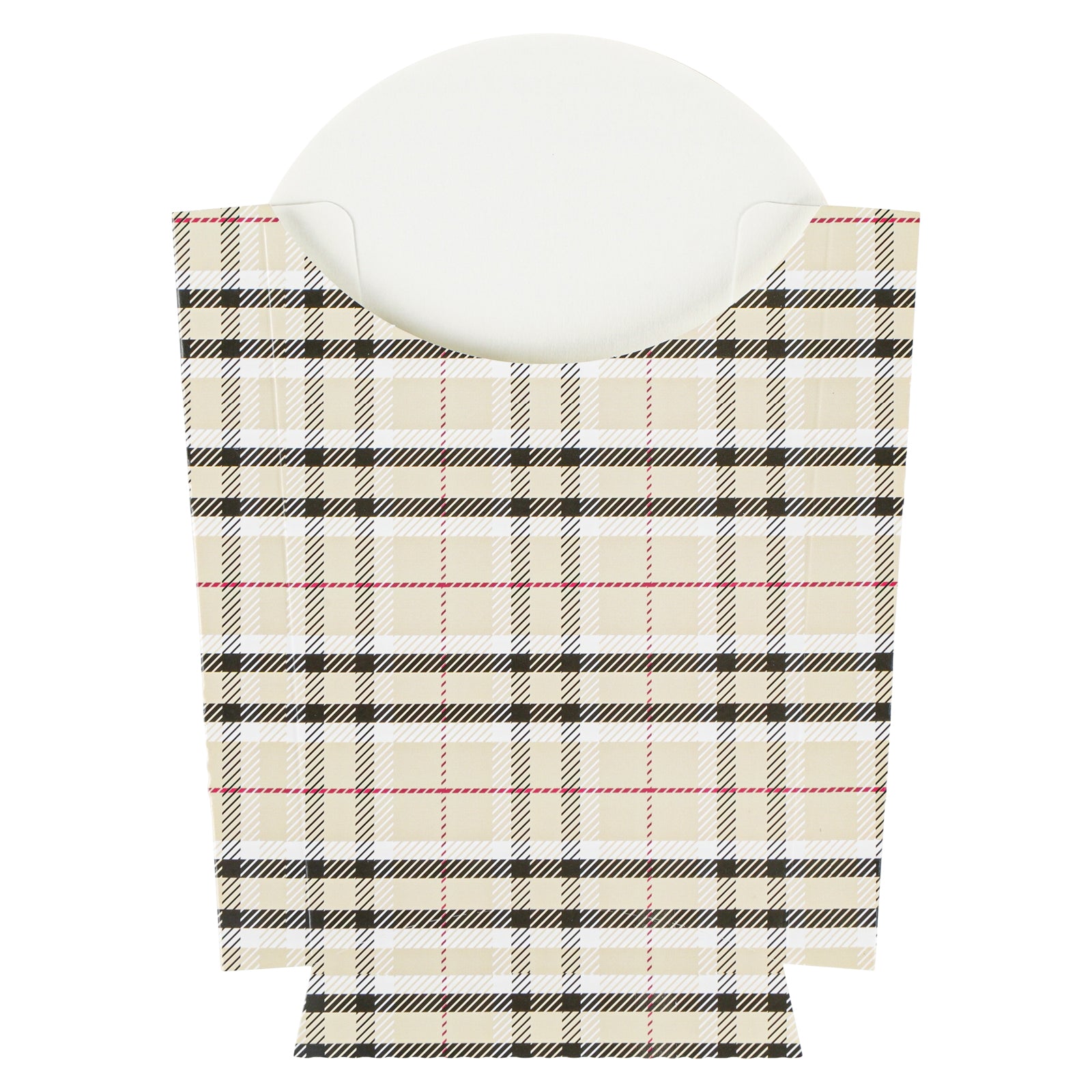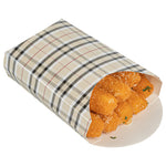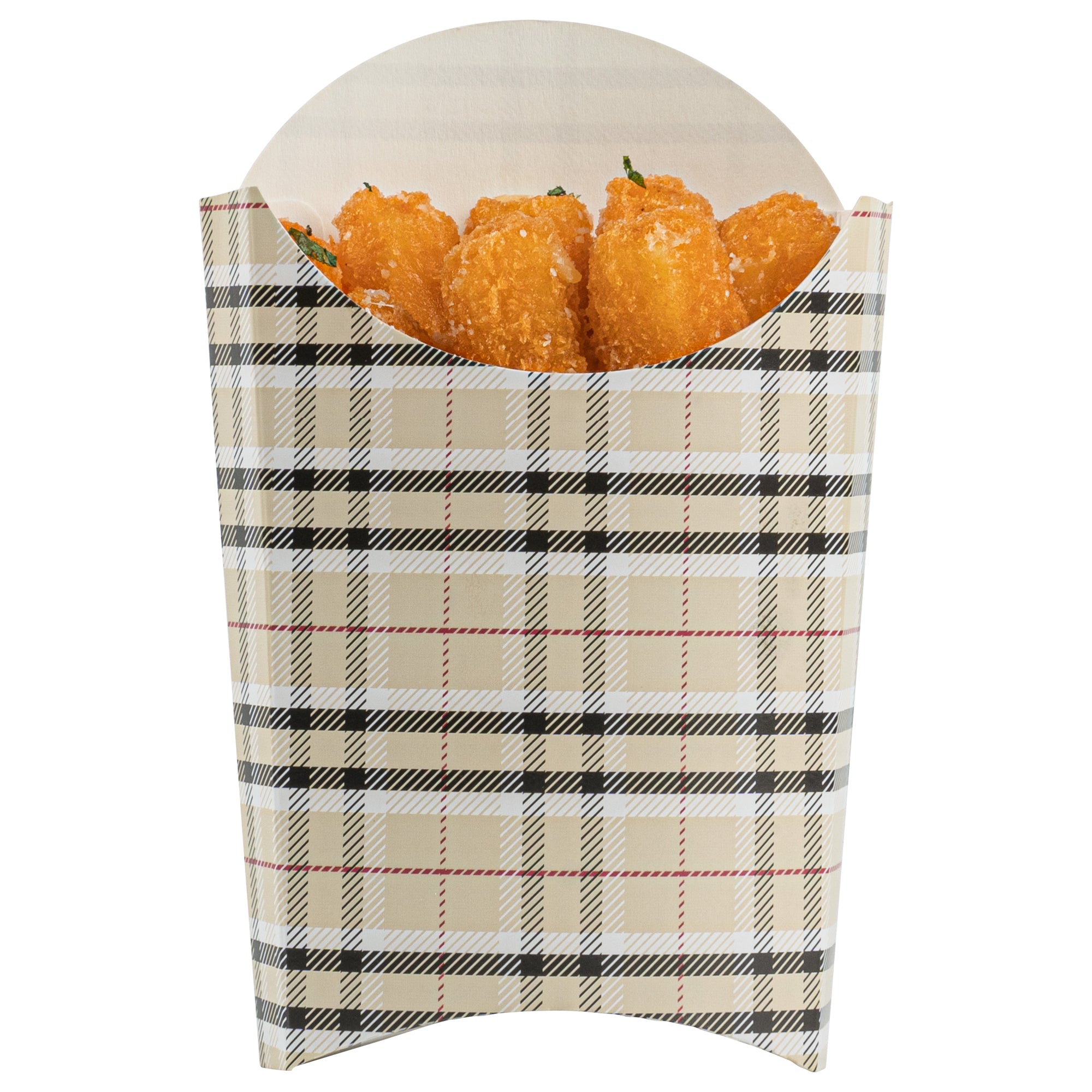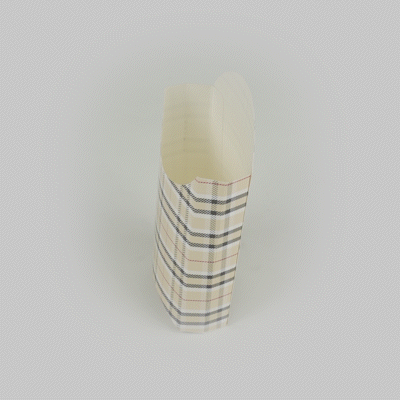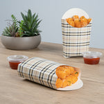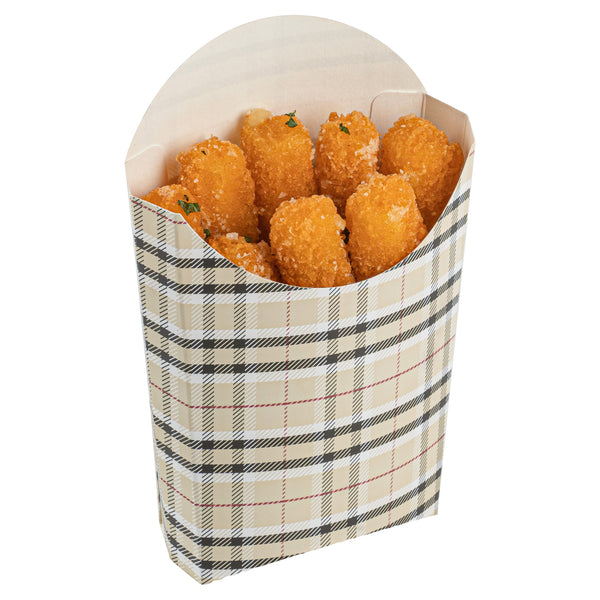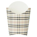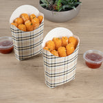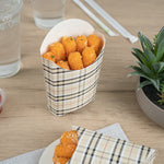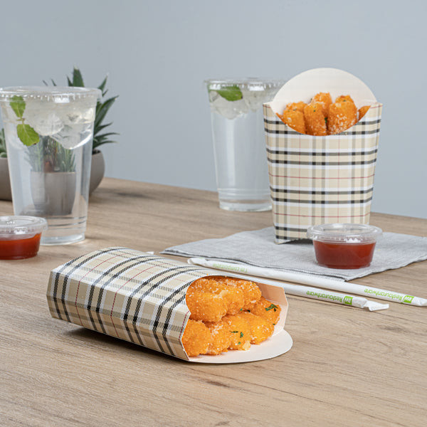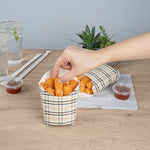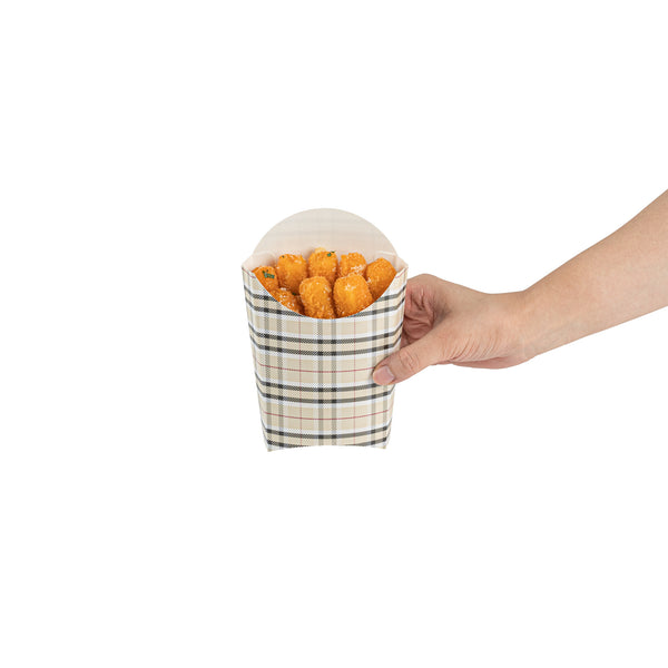 Take care of your on-the-go snack packaging comfortably with our Bio Tek Plaid Paper Fry Cups / Snack Containers. These disposable containers come with a greaseproof lining that effectively ensures no sauce or oil leaks. The expansive, skewed rim makes it breeze to scoop snacks. High-quality paper construction ensures the durability of these fry cups, and also protects hands from warm contents. The trendy plaid design enhances your snack packaging and brings a modern look. Stacking these cups for packaging is hassle-free, and they are disposable for quick clean-up. Each 4-ounce cup measures 4.75 inches in length by 3.5 inches in width by 5 inches in height. Sold in a 100 count box.
