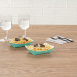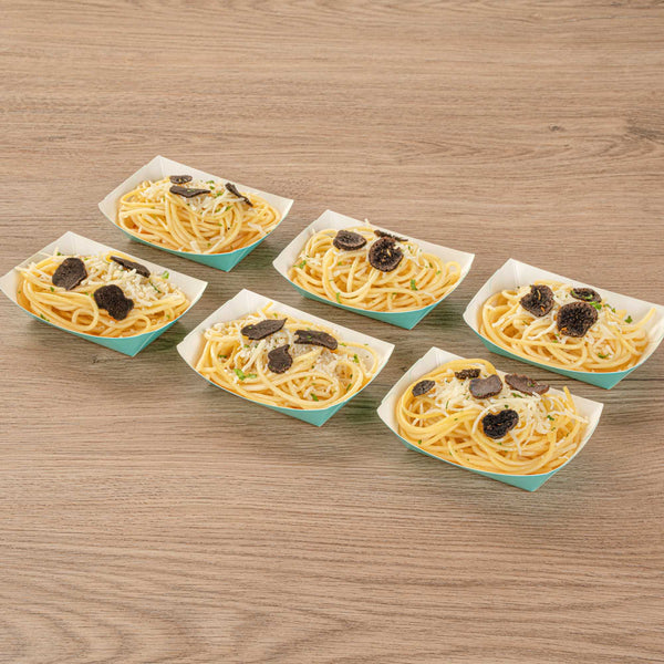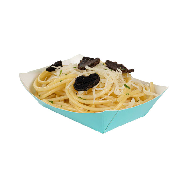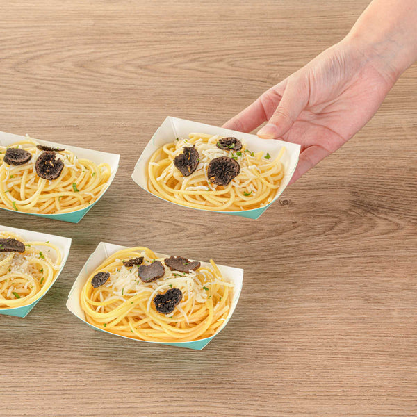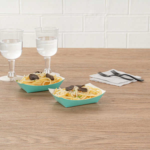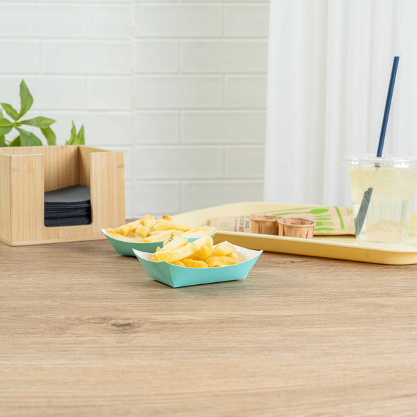 Revolutionize your catering experience with our Bio Tek 4-ounce Turquoise Paper #25 Food Tray / Boats. Manufactured from premium-quality paper, these cardboard snack trays are built with sturdy bases and resilient walls, ensuring an immaculate way to relish side dishes, finger foods, and appetizers while on the move. Utilize these greaseproof paper food trays to easily serve sweet potato fries at your food truck or to present exquisite portions of your trademark appetizers. The elegant turquoise finish adds an enchanting twist, making them a superb choice for weddings, corporate luncheons, cocktail receptions, and other catered occasions. Simplify the task of cleaning up after events with these disposable paper food boats. These small food boats measure 3 inches long by 2 inches wide by 1 inch tall, and these #25 paper food trays hold up to 4 ounces. Sold in a 400 count box.