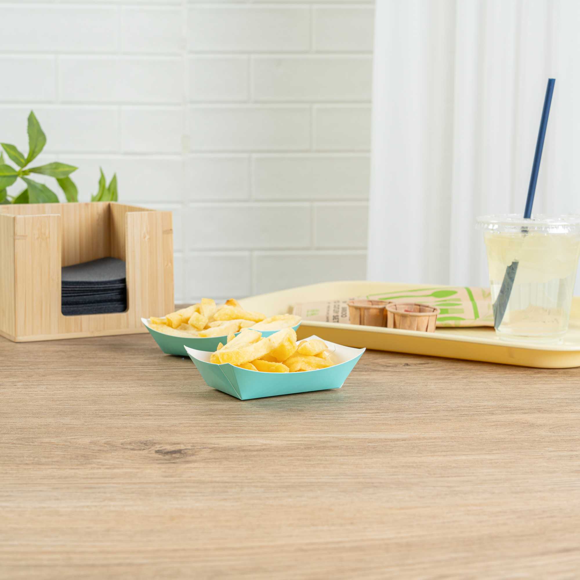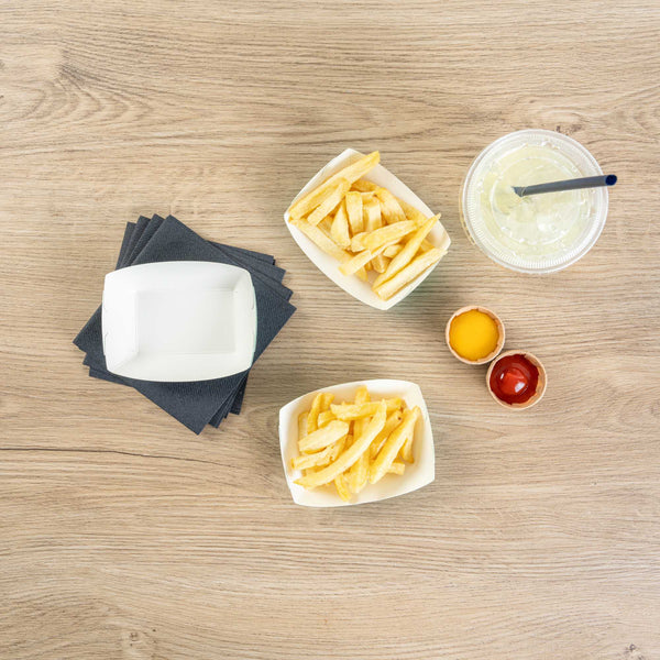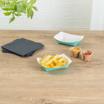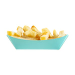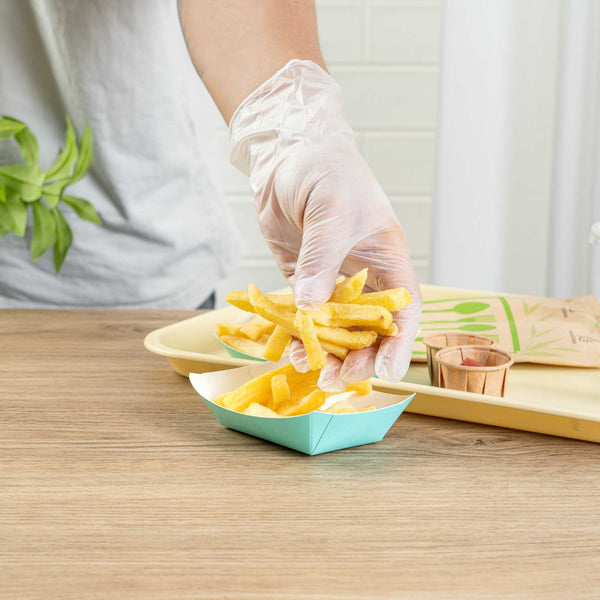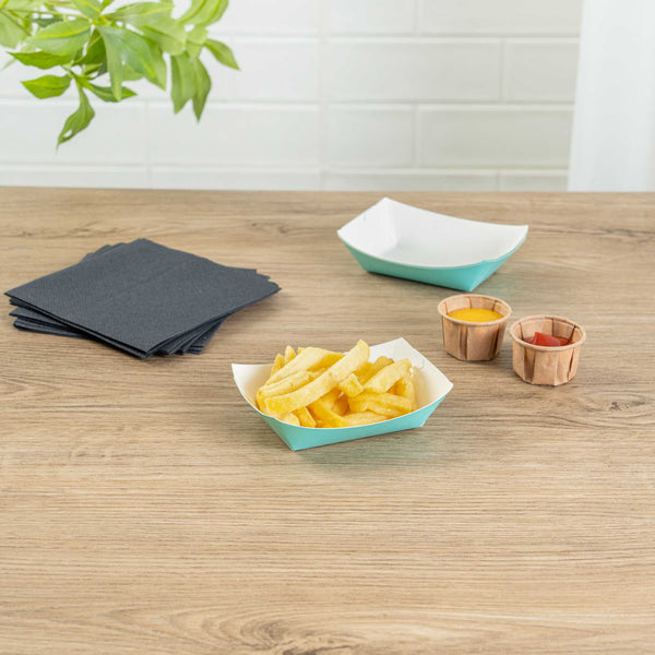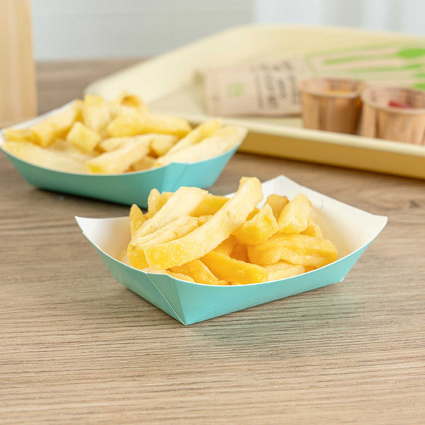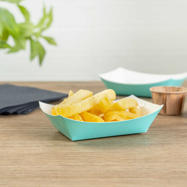 Revolutionize your catering experience with our Bio Tek 4-ounce Turquoise Paper #25 Food Tray / Boats. Manufactured from premium-quality paper, these cardboard snack trays are built with sturdy bases and resilient walls, ensuring an immaculate way to relish side dishes, finger foods, and appetizers while on the move. Utilize these greaseproof paper food trays to easily serve sweet potato fries at your food truck or to present exquisite portions of your trademark appetizers. The elegant turquoise finish adds an enchanting twist, making them a superb choice for weddings, corporate luncheons, cocktail receptions, and other catered occasions. Simplify the task of cleaning up after events with these disposable paper food boats. These small food boats measure 3 inches long by 2 inches wide by 1 inch tall, and these #25 paper food trays hold up to 4 ounces. Sold in a 50 count box.