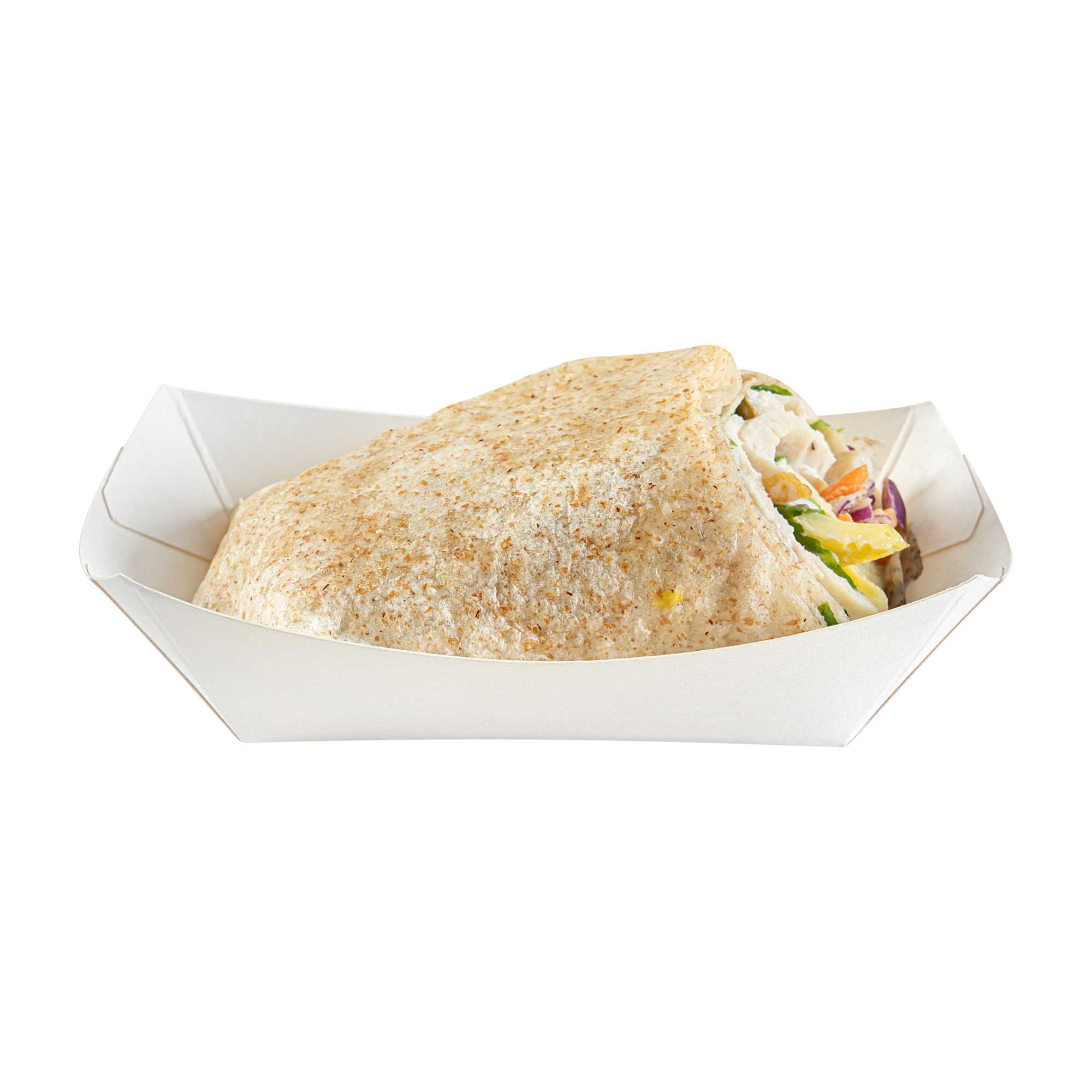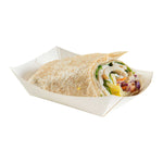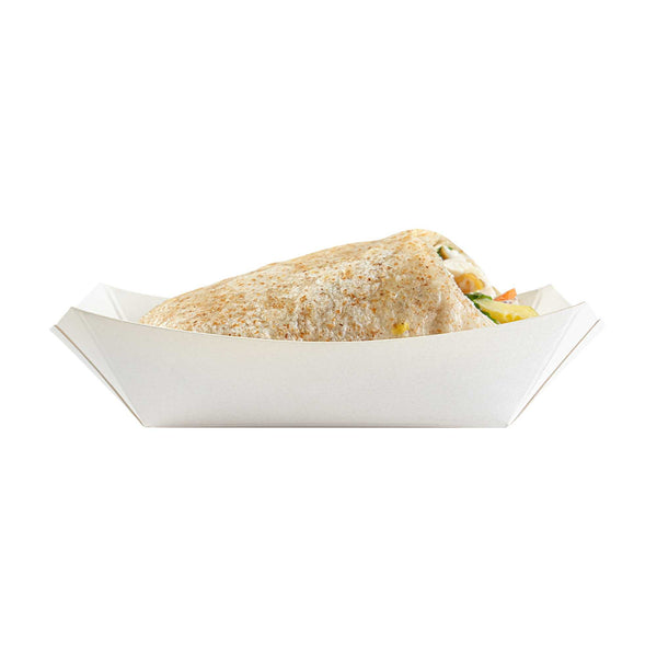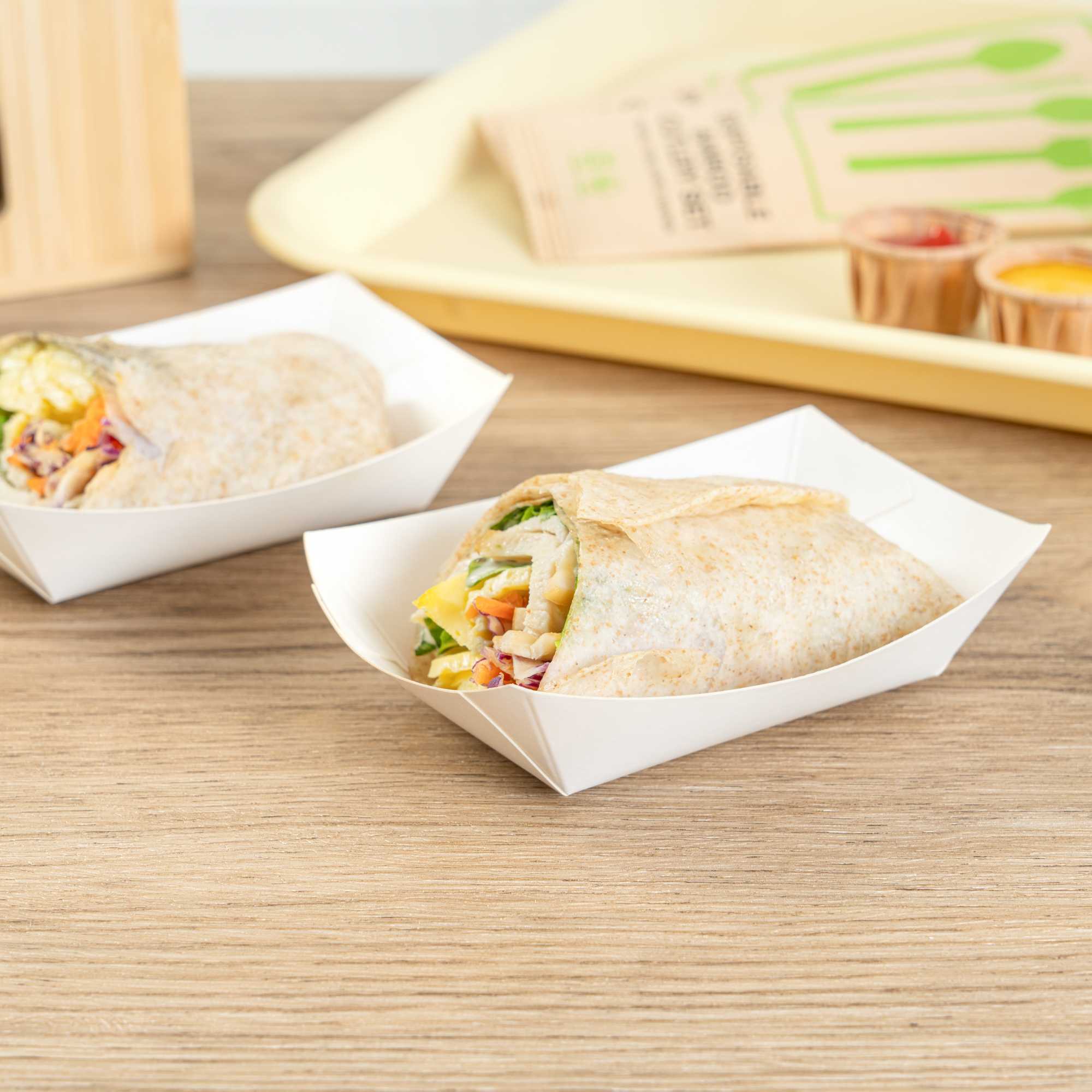 These paper food boat trays have an ultra-portable design to easily serve meals. Ideal for food trucks, family parties, and catering companies!