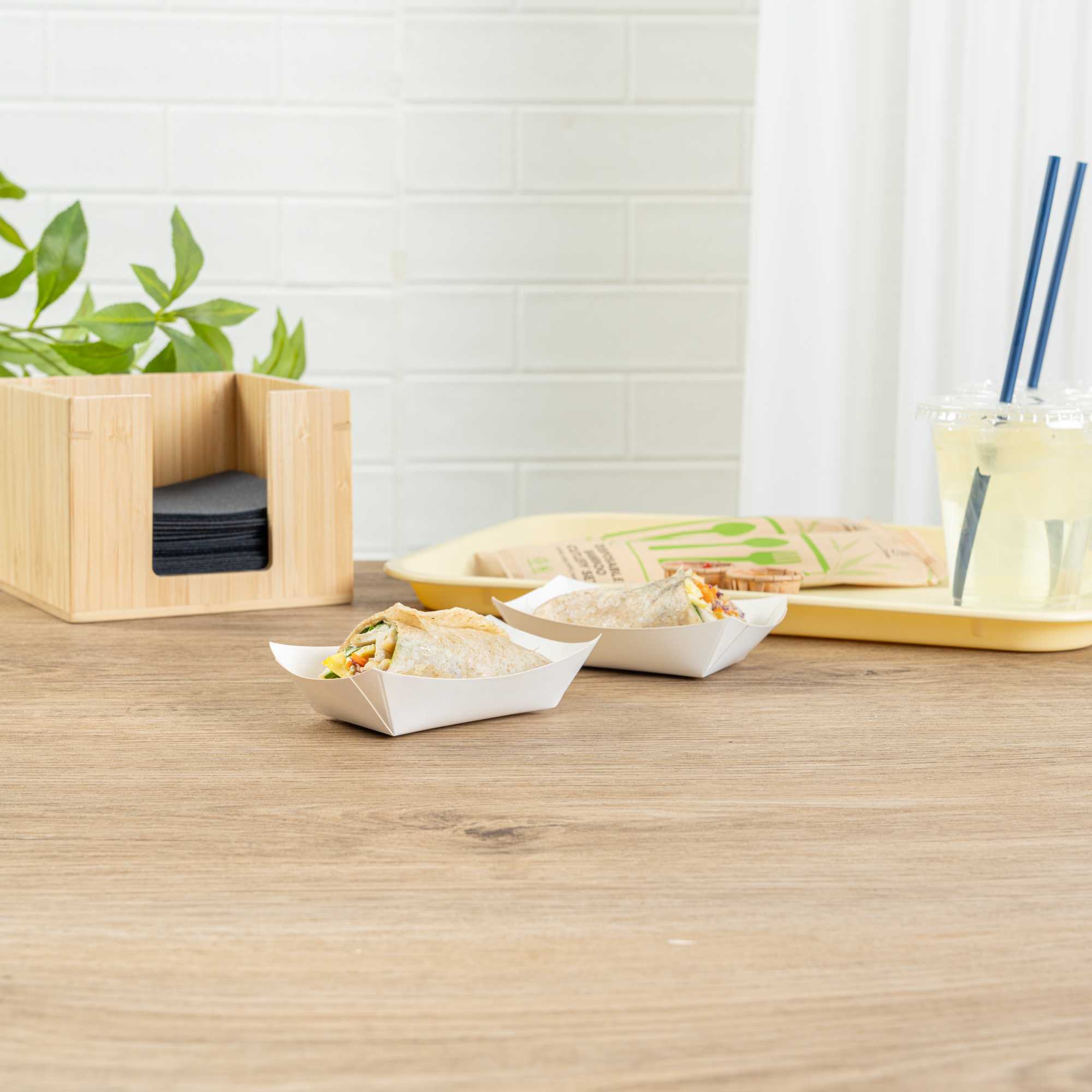 For a simple cleaning process for establishments and guests, these paper food boats are sustainably disposable. Reduce your impact on the environment!
