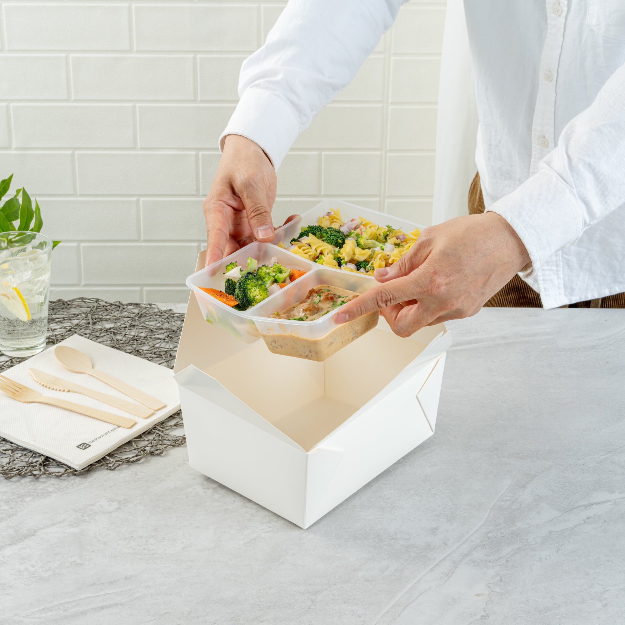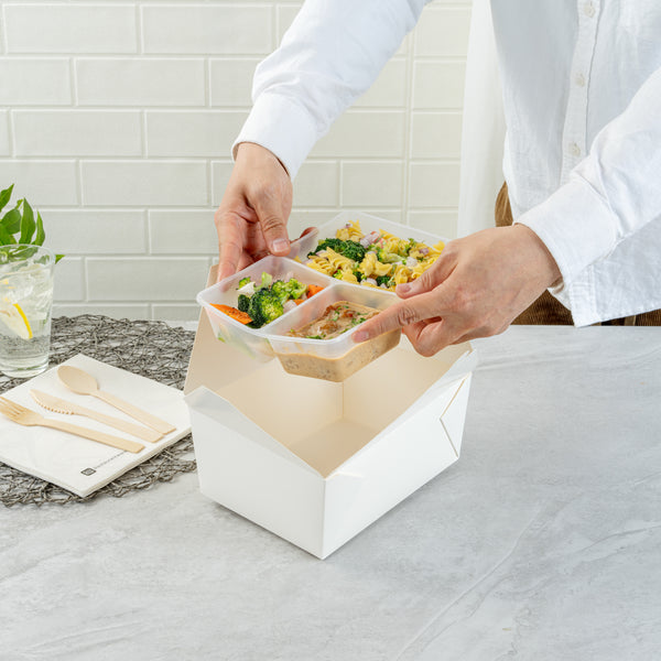 Our Bio Tek 40-ounce White Plastic 3-Compartment Insert Trays are an excellent solution for organizing meals in style. These plastic insert trays seamlessly fit into our collection of compatible BioTek Take Out Containers, ensuring compatibility across a range of options. Crafted from flexible polypropylene, these divider trays are versatile for both hot and cold foods. Designed with three compartments, this tray insert is great for holding tacos and other foods alongside their sides. Suitable for microwave use and leak-resistant, these portion trays help to avoid spills and messes, making them indispensable for takeout restaurants, cafes, food trucks, and ghost kitchens. Each tray offers a generous 40-ounce capacity, measuring 8 inches in length by 6 inches in width by 1.8 inches in height. Sold in a 50 count box.