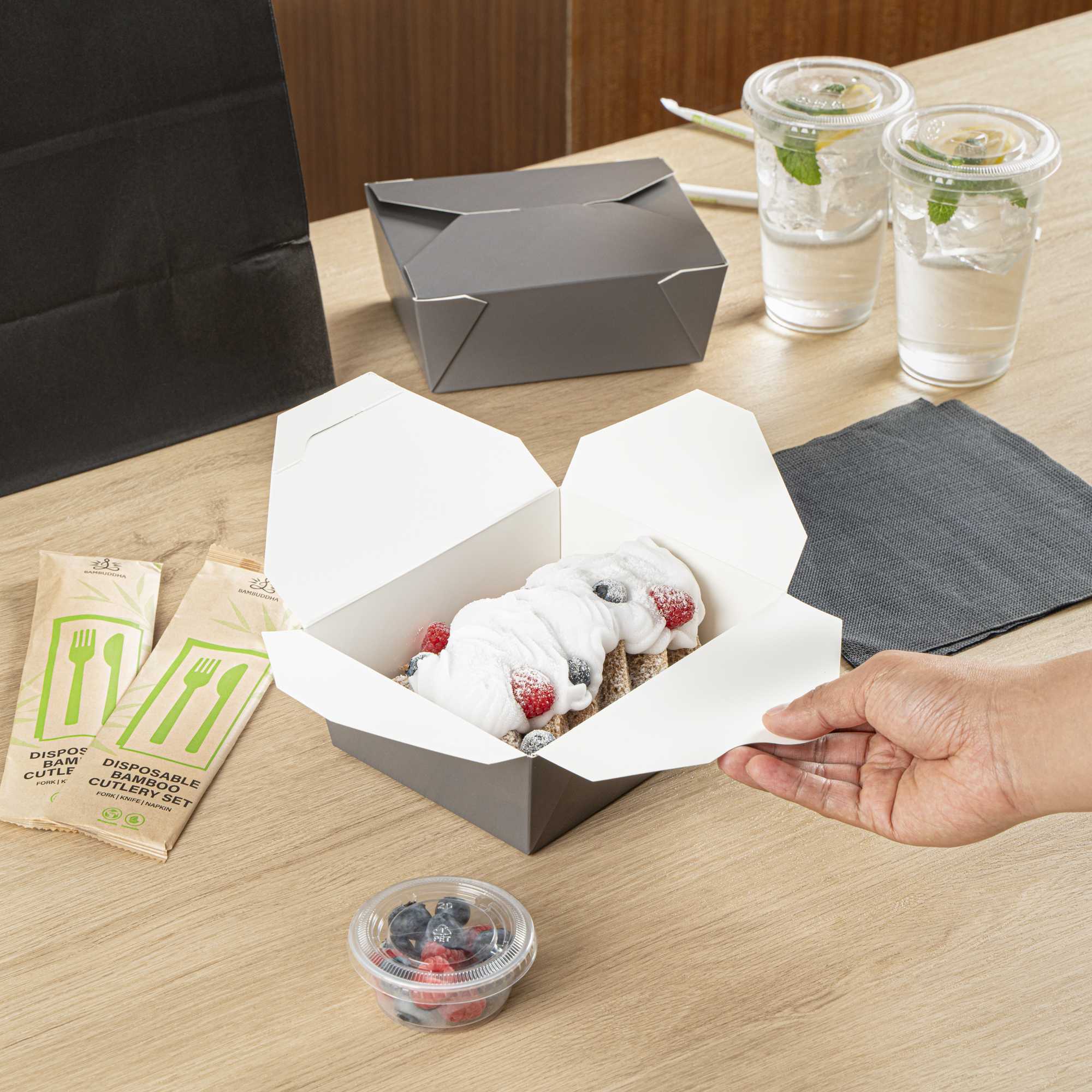 No matter the size of your dish, our disposable food boxes are available in different capacities to accommodate any meal. Choose from our soup, noodle, salad, or rectangle containers to easily pack and take food anywhere.