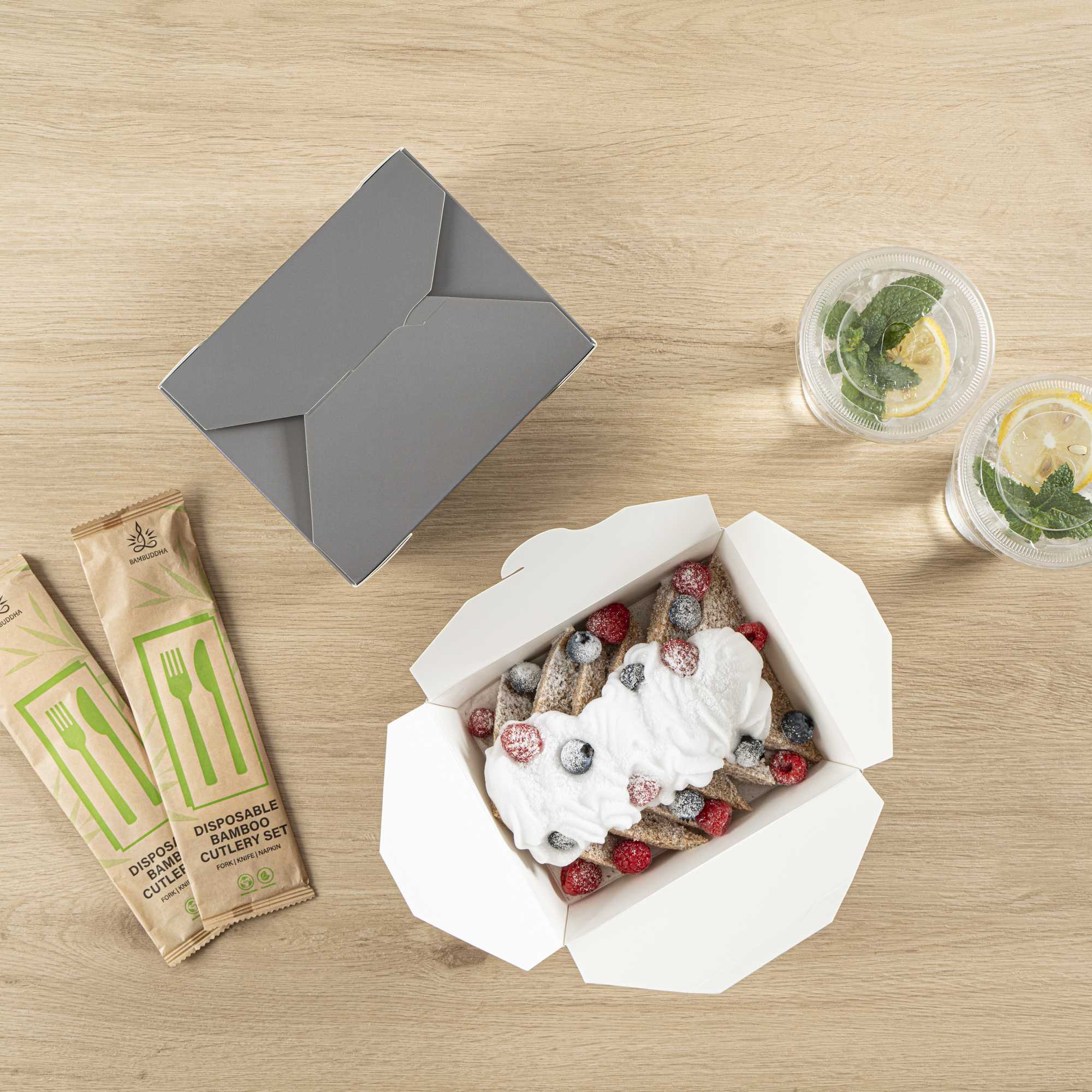 No matter the size of your dish, our disposable food boxes are available in different capacities to accommodate any meal. Choose from our soup, noodle, salad, or rectangle containers to easily pack and take food anywhere.