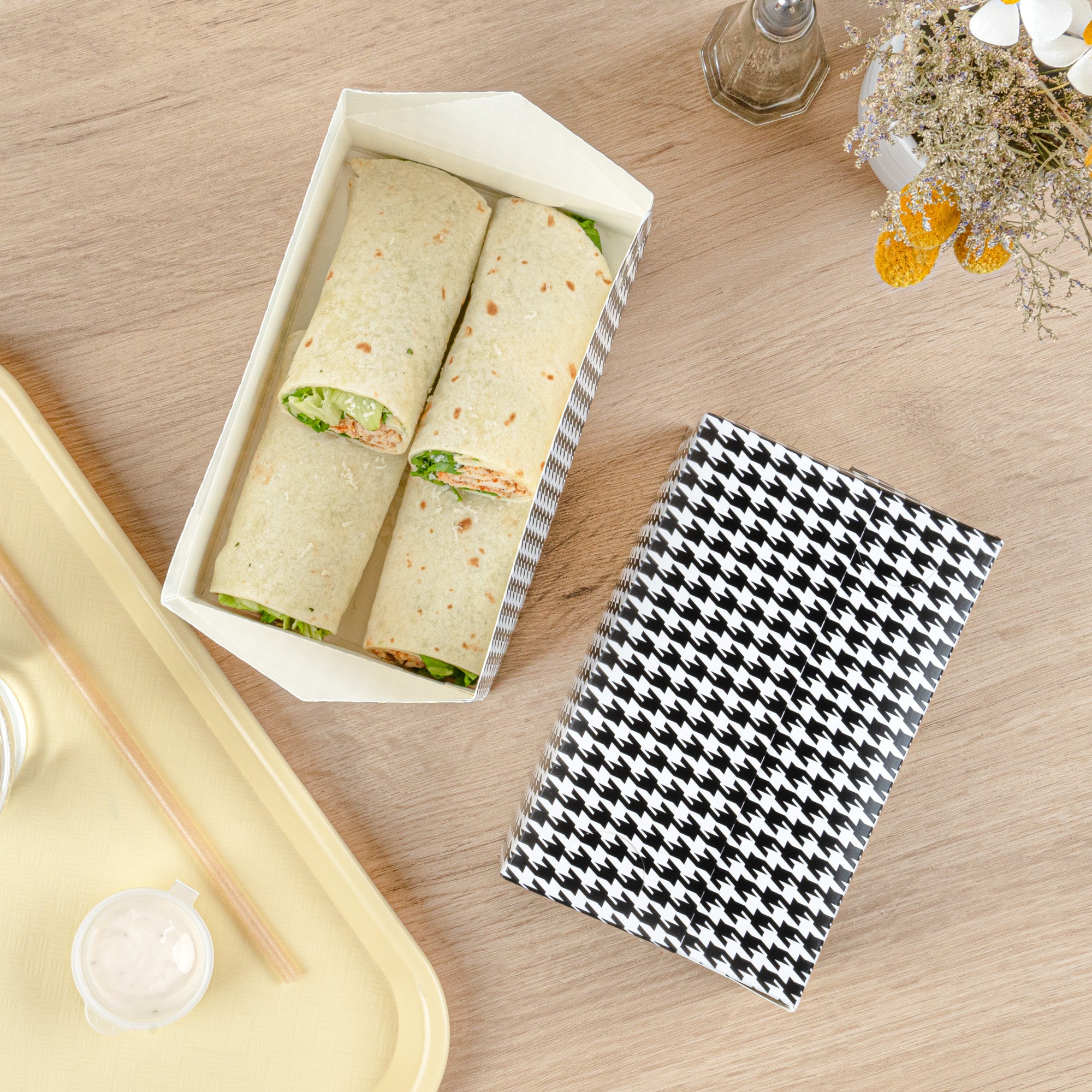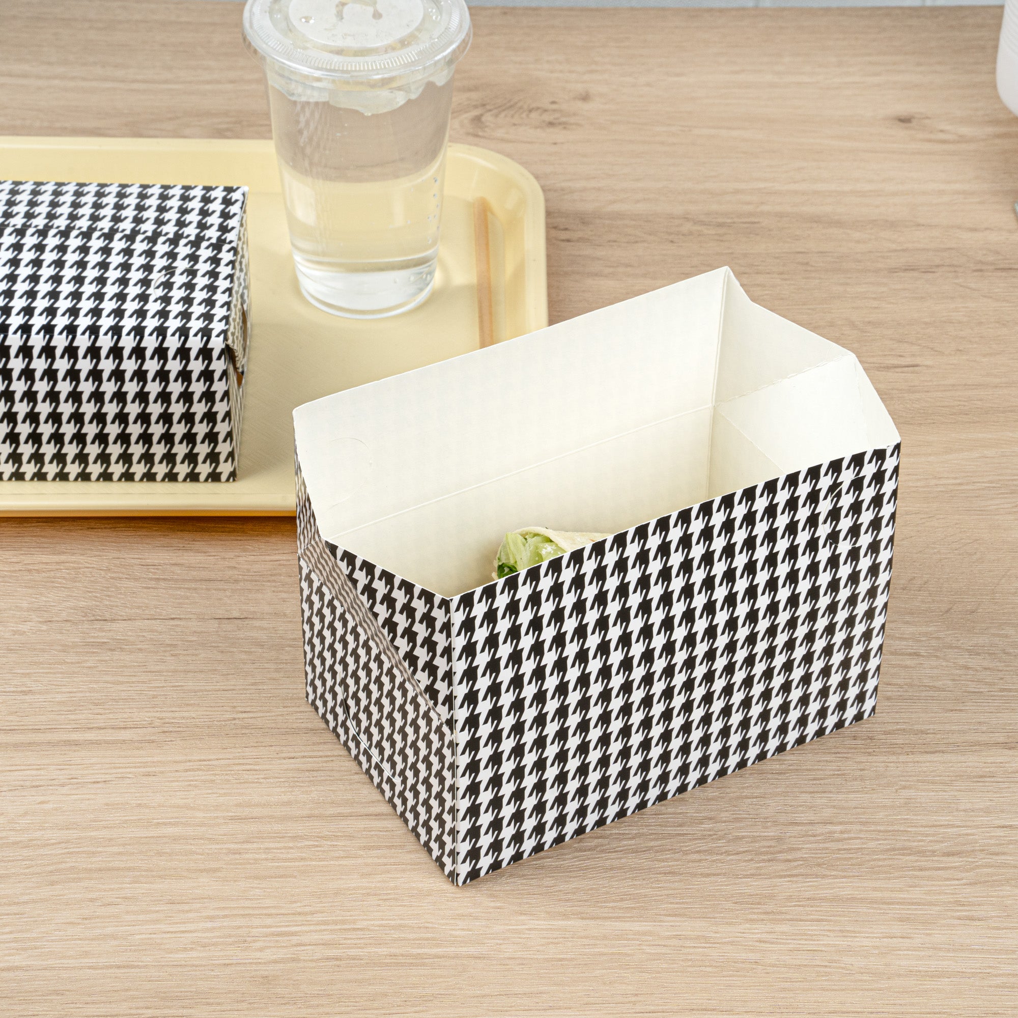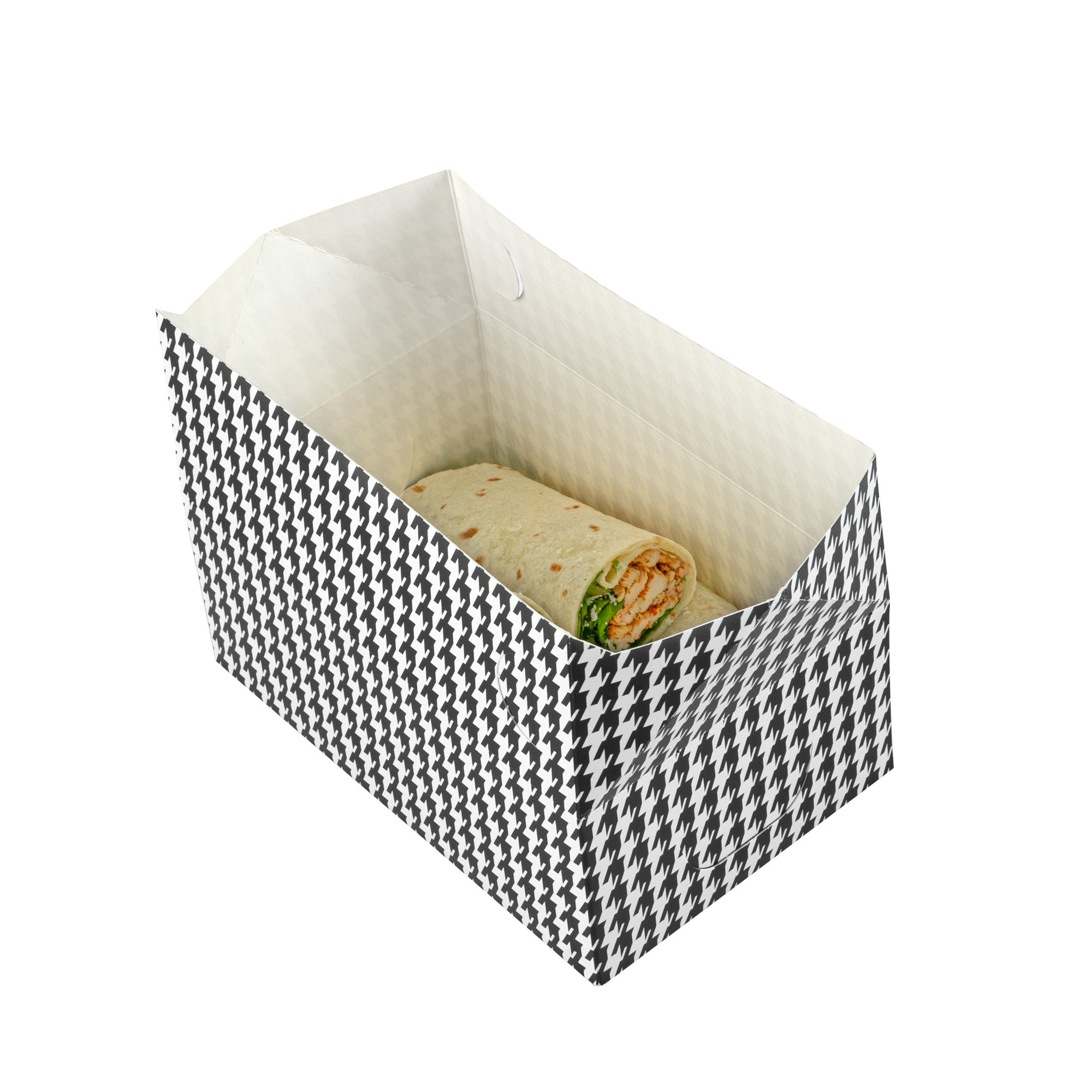 Ensure secure meal transport with spill-resistant takeout solutions. Bio Tek Black Paper Spill-Resistant Takeout Lunch Box features a fast top closure that ensures spill-free food transport, making it the ideal takeout lunch box for restaurants focused on efficient service. With a generous 47-ounce capacity, this paper takeout box accommodates a variety of meal sizes, perfect for businesses offering sizable portions. The greaseproof lining maintains the freshness of fried foods, ensuring customers enjoy crisp dishes with every order. Made from recyclable paper, it supports eco-friendly dining operations, appealing to environmentally conscious consumers and reducing waste. Its stylish black houndstooth pattern elevates your brand presentation, turning ordinary packaging into a visual delight. Whether used as a food delivery container or for grab-and-go services, it provides reliable support with its sturdy 7-inch by 4.5-inch by 2.8-inch dimensions. Elevate your takeout service today with this eco-friendly option. Each order includes 100 Bio Tek Black Paper Spill-Resistant Takeout Lunch Box.
