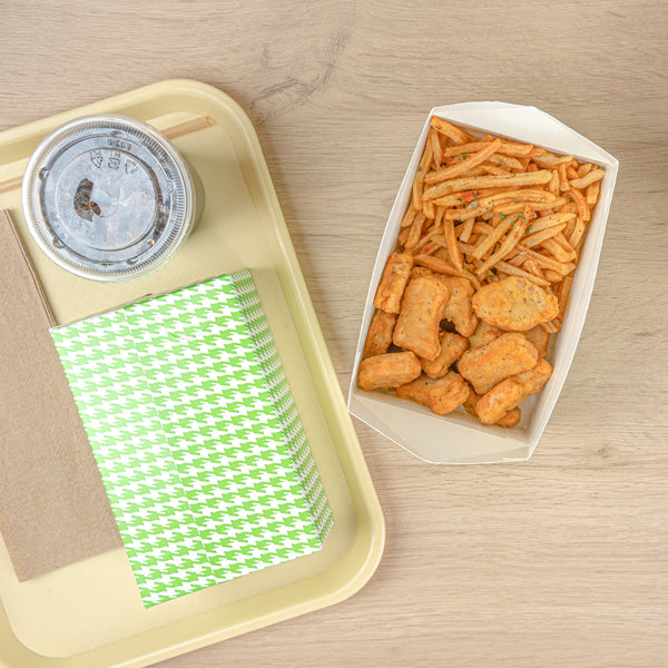 Streamline your foodservice with eco-friendly packaging solutions. The Bio Tek Green Paper Disposable Take Out Box features a fast top closure that ensures secure, spill-resistant food transportation, perfect for busy restaurants and cafes. With a generous 47-ounce capacity, this greaseproof food box accommodates large meals or combo offerings, making it ideal for various menu items. The greaseproof lining effectively maintains food freshness by preventing oil leakages, while the recyclable paper construction minimizes waste and supports sustainability efforts. Measuring 7 inches in length, this durable paper food box is freezer-safe and suitable for both hot and cold foods, providing versatile use for catering services and food trucks. Choose this stylish green houndstooth box to enhance your brand presentation and attract environmentally conscious consumers. Each order includes 400 Bio Tek Green Paper Disposable Take Out Boxes.