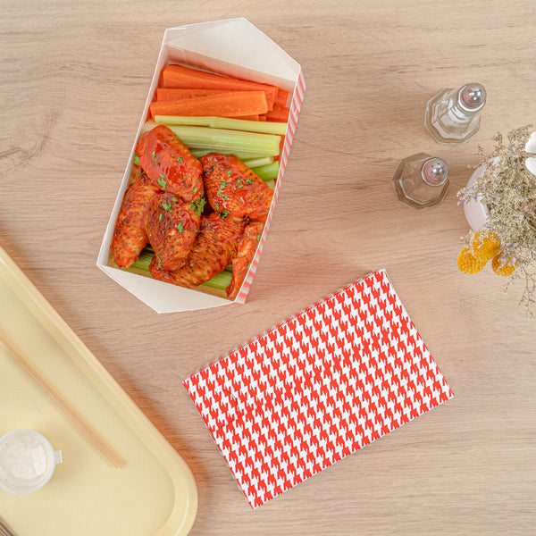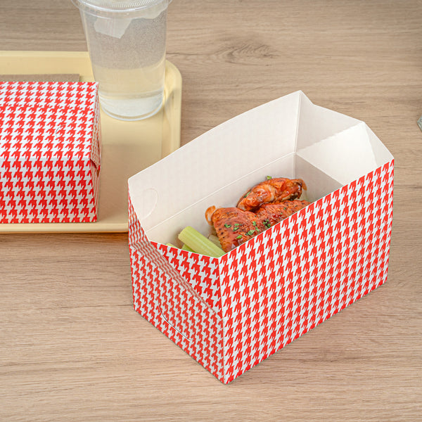 Ensure spill-free transport with our Bio Tek Spill-Resistant Paper Takeout Box. This paper takeout box boasts a fast top closure, guaranteeing a secure seal that enhances operational efficiency during peak service hours. The spill-resistant takeout container's greaseproof lining prevents oil leakages, ensuring your delicious meals arrive fresh and intact. With a robust rectangular food container design measuring 7 inches by 4.5 inches by 2.75 inches, it's perfect for packing generous portions, making it suitable for both hot and cold dishes. Constructed from eco-friendly, recyclable paper, this container supports sustainability by minimizing waste. Whether you're serving fried chicken or catering an event, this takeout solution combines functionality and style, impressing customers with its attractive red houndstooth pattern. Experience the dual benefits of practicality and presentation in your foodservice operations. Each order includes 100 Bio Tek Spill-Resistant Paper Takeout Boxes.