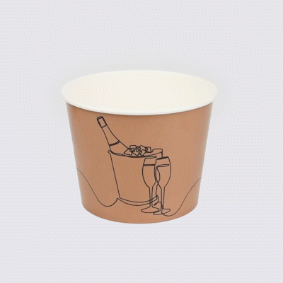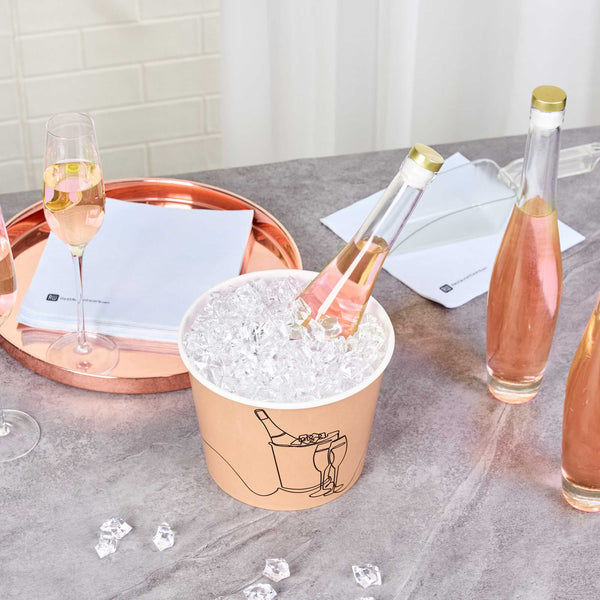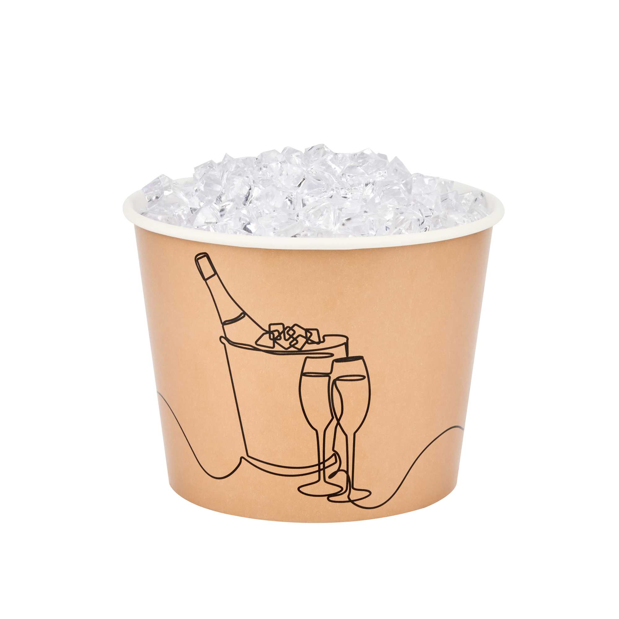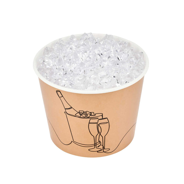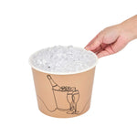Ensure seamless service with dependable ice storage with our Bio Tek 5 lb Kraft Disposable Paper Ice Bucket. This wide-mouth, kraft-colored bucket features a double liner that expertly maintains ice, making it an ideal disposable ice bucket for extended service times. Constructed from sturdy, double-sided poly-coated paper, this hotel room ice bucket is both hot food friendly and cold food friendly, providing versatile use. The insulated design, measuring 7.5 inches by 7.5 inches by 5.75 inches, is freezer-friendly, making it perfect for pre-prepared chilled items, ensuring it meets various foodservice needs. Its kraft color and printed design complement rustic themes, enhancing the visual appeal of catering events or outdoor gatherings. Elevate your service with this dependable insulated ice bucket, designed to keep contents at their ideal temperature. Sold in a 100 count box.