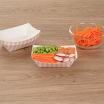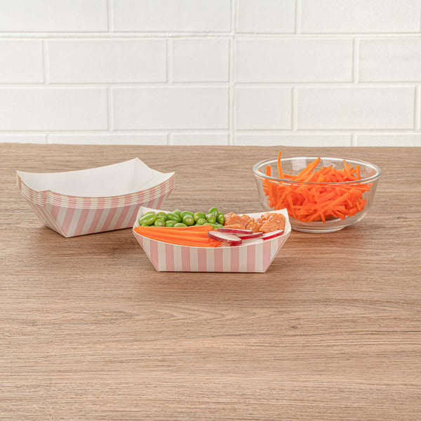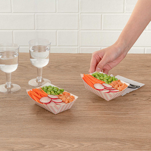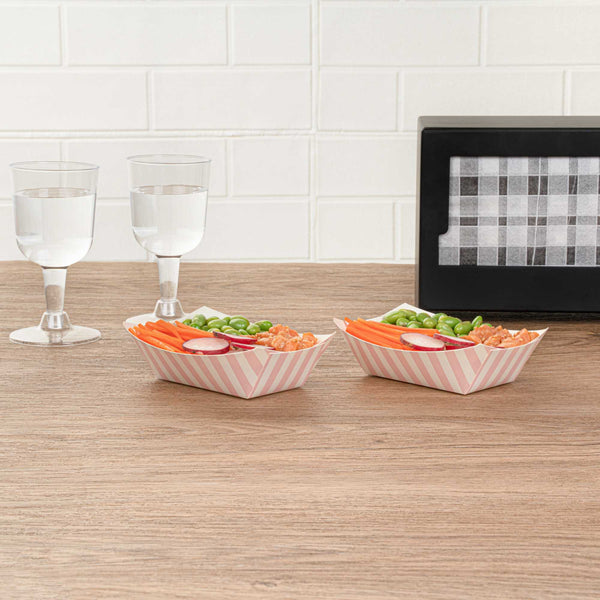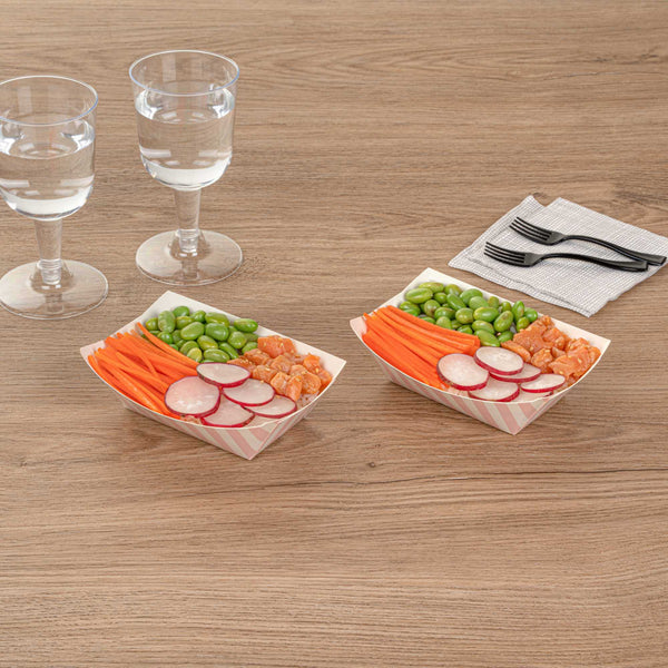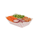 Elevate your catering game with our Bio Tek 6-ounce Pink and White Stripe Paper #40 Food Tray / Boats. Made from premium greaseproof paper, these cardboard snack trays feature sturdy bases and robust walls, ensuring a mess-free solution for enjoying side dishes, finger foods, and appetizers while on the move. Utilize these small paper food trays to serve up sweet potato fries at your food truck or to present elegant portions of your signature appetizers. These disposable food boats are designed for effortless event cleanup. These disposable paper food boats take the stress out of cleaning up after events. The trendy pink and white striped design adds an enchanting touch, making them a superb choice for weddings, corporate luncheons, cocktail gatherings, and various catered occasions. These small food boats measure 3.25 inches long by 2 inches wide by 1.5 inches tall, and these #40 paper food trays hold up to 6 ounces. Sold in a 400 count box.