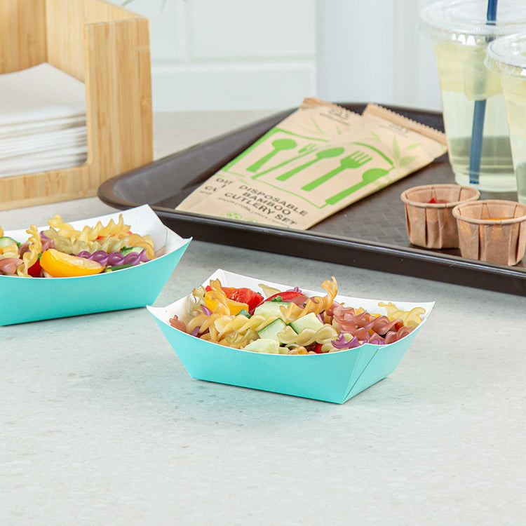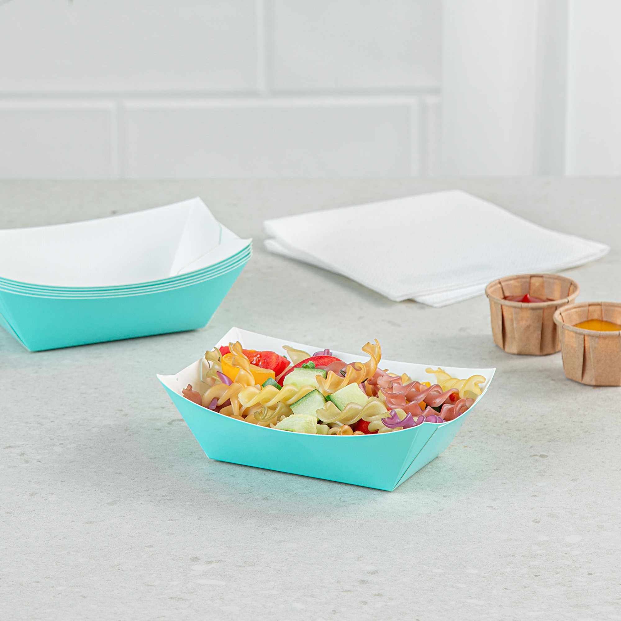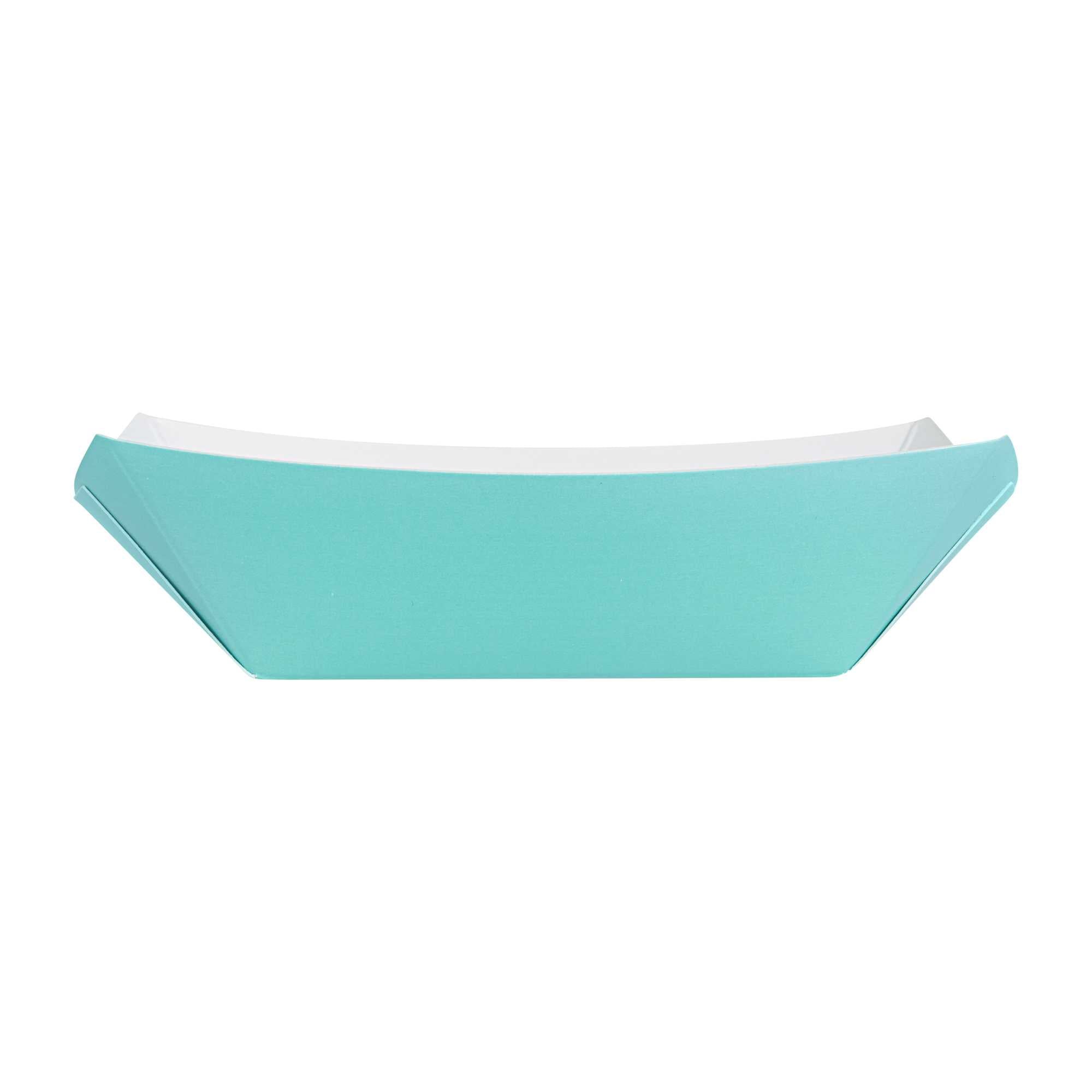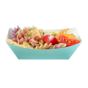 Elevate your catering experience with our Bio Tek 6-ounce Turquoise Paper #40 Food Tray / Boats. Crafted from premium greaseproof paper, these cardboard snack trays feature sturdy bases and robust walls, ensuring a mess-free solution for enjoying side dishes, finger foods, and appetizers on the move. Utilize these small paper food trays to serve up sweet potato fries at your food truck or to present elegant portions of your signature appetizers. These disposable food boats are tailored for easy event cleanup. The attractive turquoise finish adds an enchanting touch, making them a superb choice for weddings, corporate luncheons, cocktail gatherings, and various catered occasions. These small food boats measure 3.25 inches long by 2 inches wide by 1.5 inches tall, and these #40 paper food trays hold up to 6 ounces. Sold in a 50 count box.