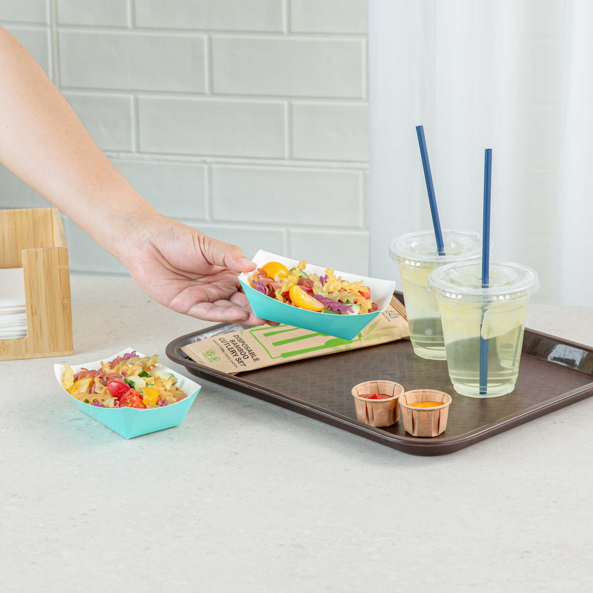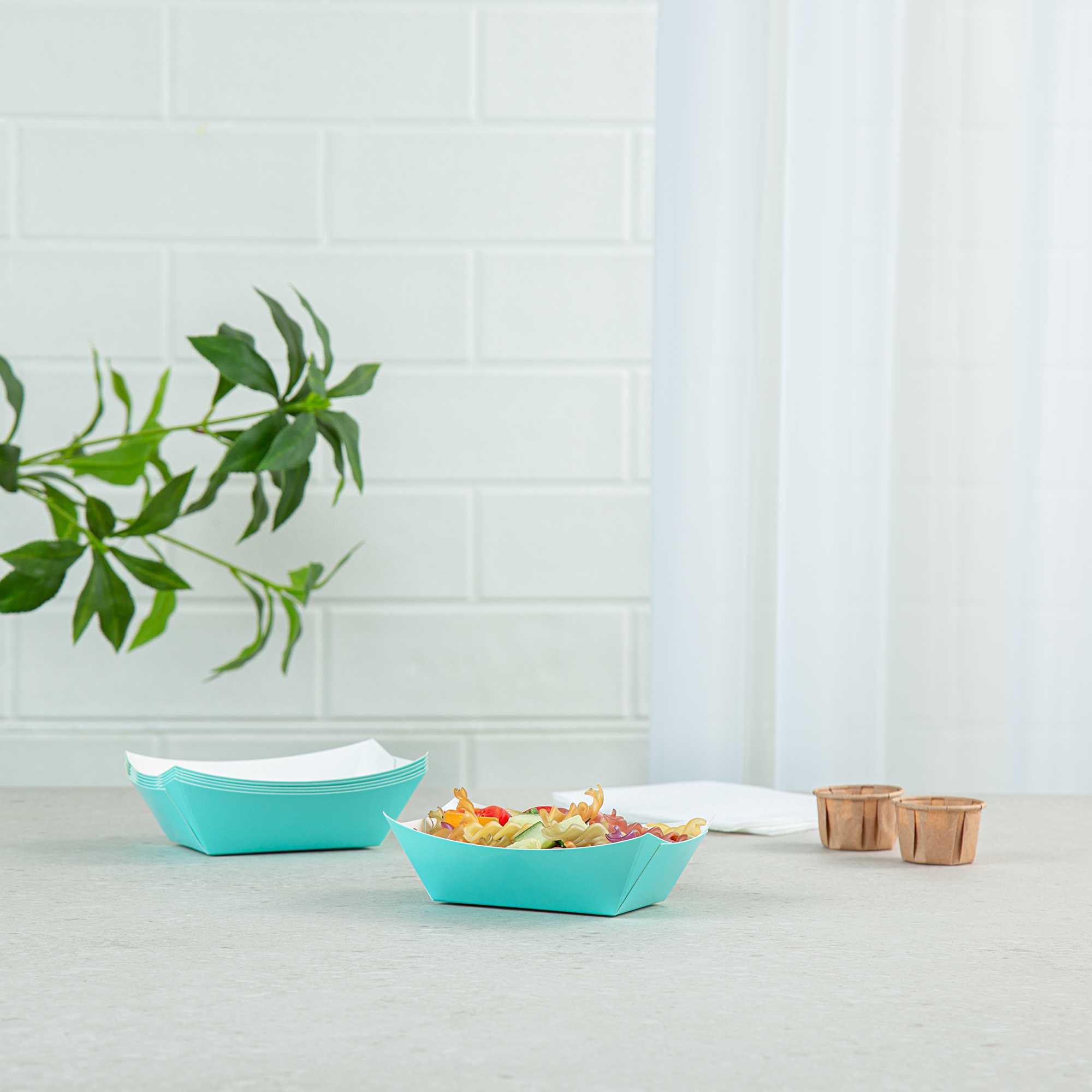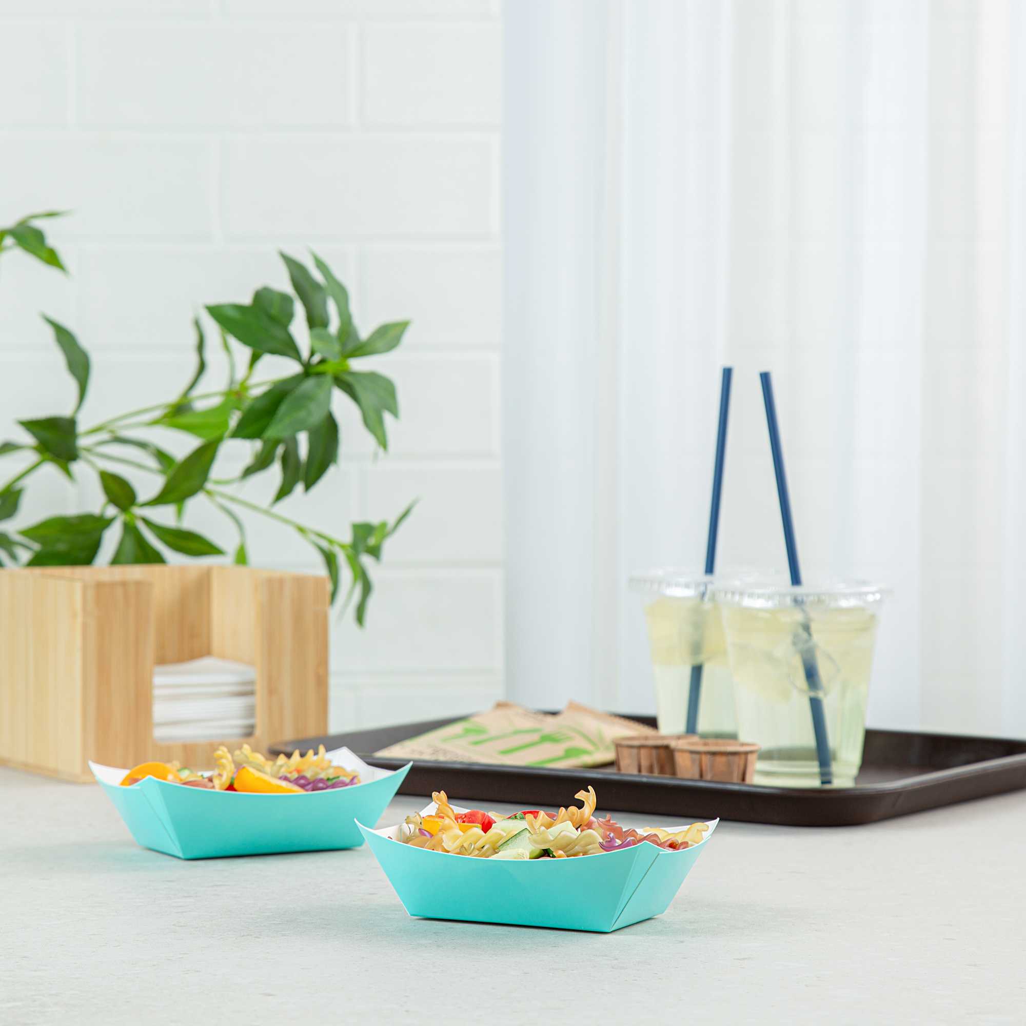 Elevate your catering experience with our Bio Tek 6-ounce Turquoise Paper #40 Food Tray / Boats. Crafted from premium greaseproof paper, these cardboard snack trays feature sturdy bases and robust walls, ensuring a mess-free solution for enjoying side dishes, finger foods, and appetizers on the move. Utilize these small paper food trays to serve up sweet potato fries at your food truck or to present elegant portions of your signature appetizers. These disposable food boats are tailored for easy event cleanup. The attractive turquoise finish adds an enchanting touch, making them a superb choice for weddings, corporate luncheons, cocktail gatherings, and various catered occasions. These small food boats measure 3.25 inches long by 2 inches wide by 1.5 inches tall, and these #40 paper food trays hold up to 6 ounces. Sold in a 50 count box.