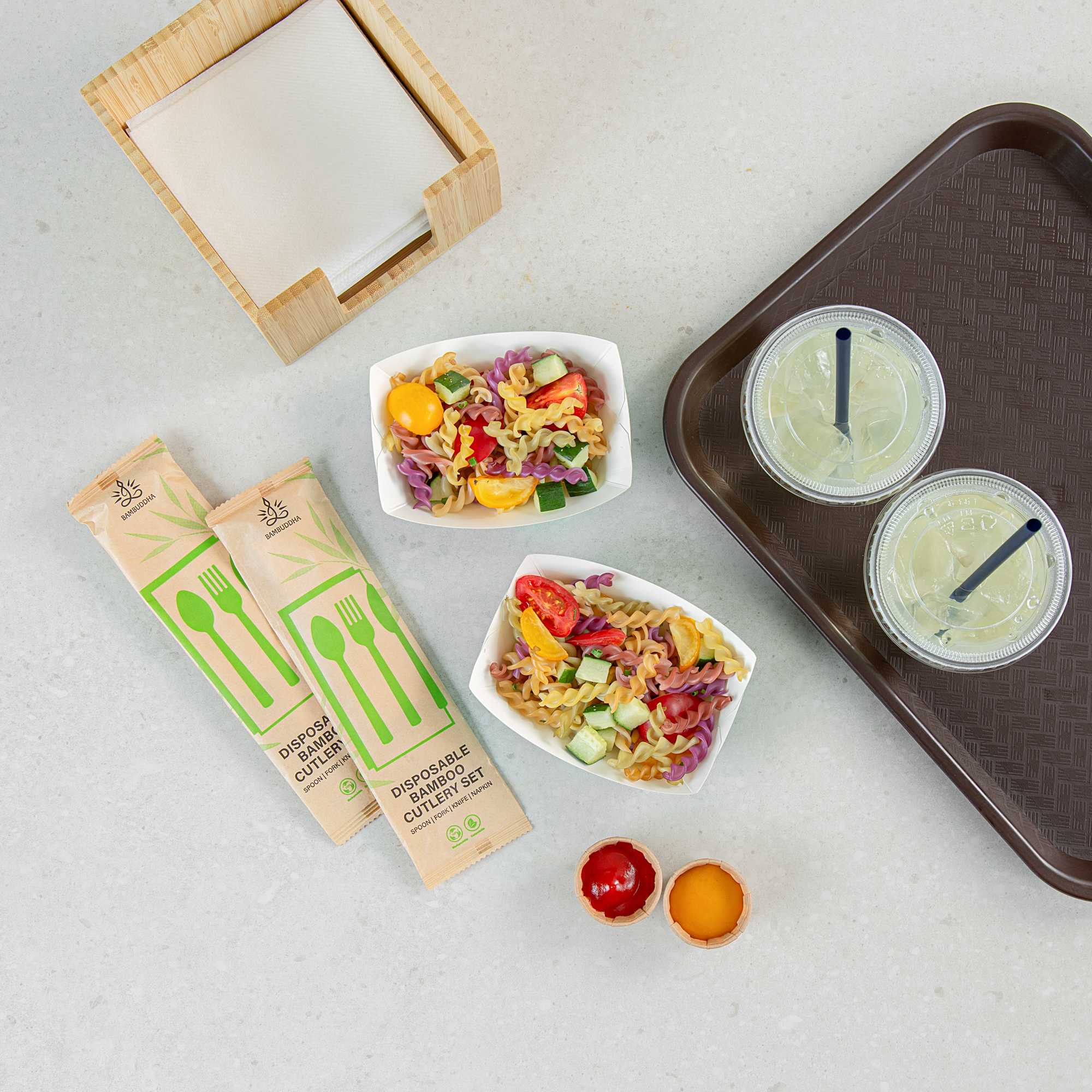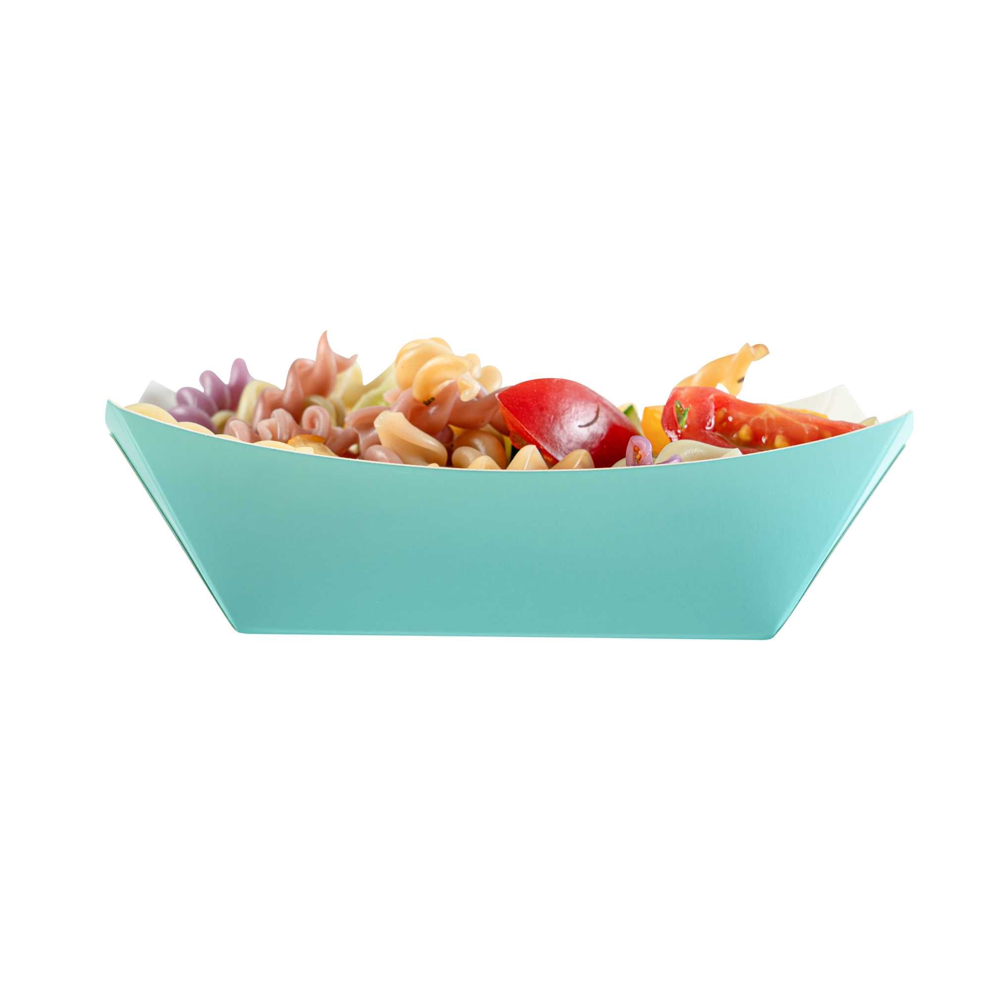 Elevate your catering experience with our Bio Tek 6-ounce Turquoise Paper #40 Food Tray / Boats. Crafted from premium greaseproof paper, these cardboard snack trays feature sturdy bases and robust walls, ensuring a mess-free solution for enjoying side dishes, finger foods, and appetizers on the move. Utilize these small paper food trays to serve up sweet potato fries at your food truck or to present elegant portions of your signature appetizers. These disposable food boats are tailored for easy event cleanup. The attractive turquoise finish adds an enchanting touch, making them a superb choice for weddings, corporate luncheons, cocktail gatherings, and various catered occasions. These small food boats measure 3.25 inches long by 2 inches wide by 1.5 inches tall, and these #40 paper food trays hold up to 6 ounces. Sold in a 50 count box.
