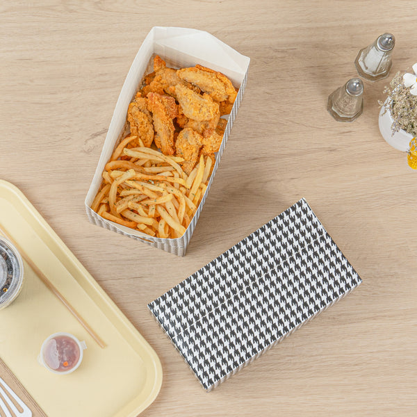 Ensure seamless meal transport with leakproof packaging. The Bio Tek Spill-Resistant Paper Takeout Box boasts a fast top closure that ensures a secure seal, allowing foodservice establishments to streamline packaging processes and safeguard meals during delivery. With a generous 71-ounce capacity, this greaseproof takeout container accommodates large meals or combo offerings, while its greaseproof lining prevents oil leakages, maintaining food freshness and quality. The stylish black houndstooth pattern enhances brand presentation, making it an attractive choice for upscale takeout services. Constructed from recyclable paper, this freezer-safe takeout box minimizes waste and supports eco-friendly initiatives, appealing to environmentally-conscious consumers. Measuring 8.9 inches in length, 4.9 inches in width, and 3.1 inches in height, this box provides reliable support for various food items, reducing the risk of leaks or spills. Elevate your foodservice operation's packaging solutions by choosing this versatile paper takeout box. Each order includes 400 Bio Tek Spill-Resistant Paper Takeout Box.