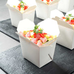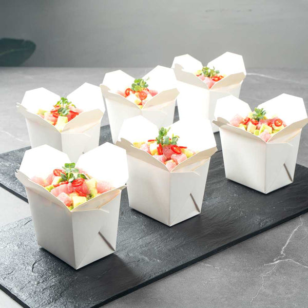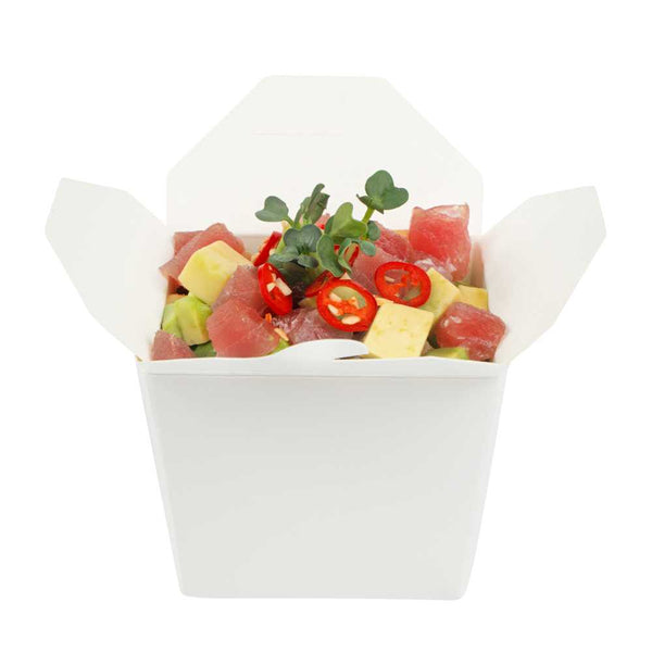 These takeaway boxes are made from thick paper and can easily hold hot and cold foods. Ideal for packing lunches for work!