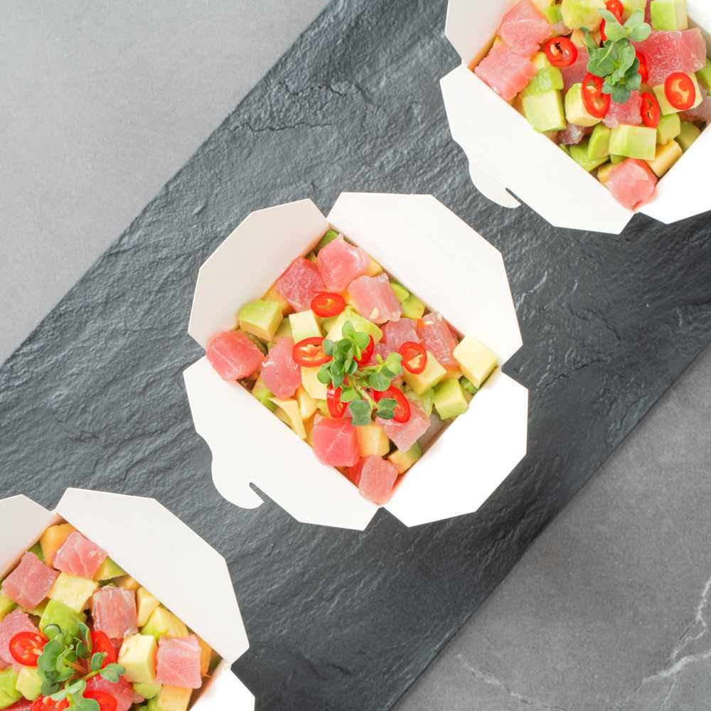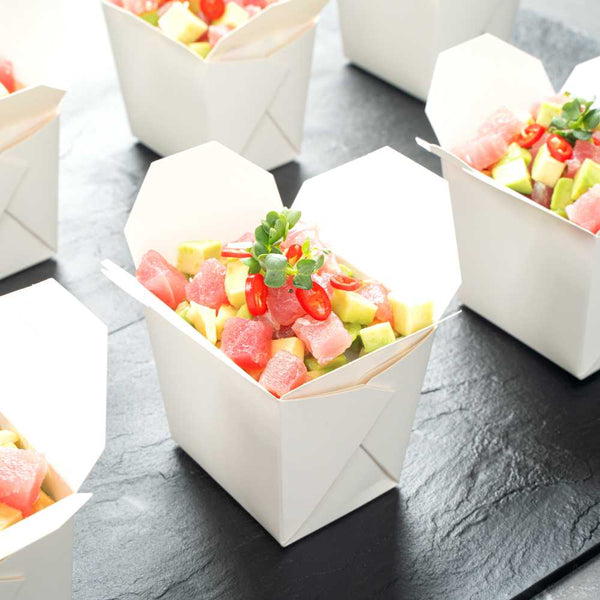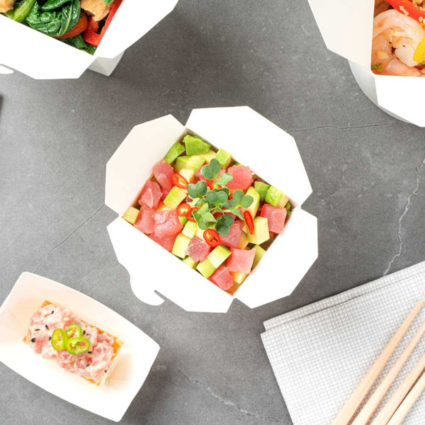 These takeaway boxes are made from thick paper and can easily hold hot and cold foods. Ideal for packing lunches for work!