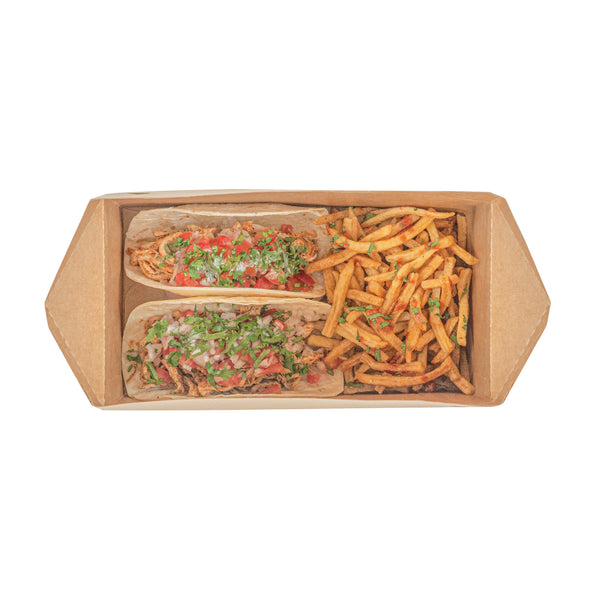 Ensure hassle-free meal deliveries with our Bio Tek Kraft Paper Takeout Container. This takeout container features a fast top closure that guarantees spill-resistant food transportation, ideal for restaurant operations looking to maintain the integrity of dishes. Made from premium kraft paperboard, this kraft paper box provides a reliable and sturdy solution for packaging a variety of foods, from hot entrees to cold salads. Its greaseproof lining preserves the freshness of both hot and cold foods, ensuring customer satisfaction upon delivery. With a generous 80-ounce capacity and practical dimensions of 9 inches by 5 inches by 5 inches, it accommodates family-sized meals or bulk orders with ease. Crafted from recyclable paper, this biodegradable lunch container supports eco-friendly practices by minimizing waste, making it a conscious choice for sustainable foodservice operations. Elevate your packaging with a container that combines functionality and sustainability. Each order includes 100 Bio Tek Kraft Paper Takeout Containers.