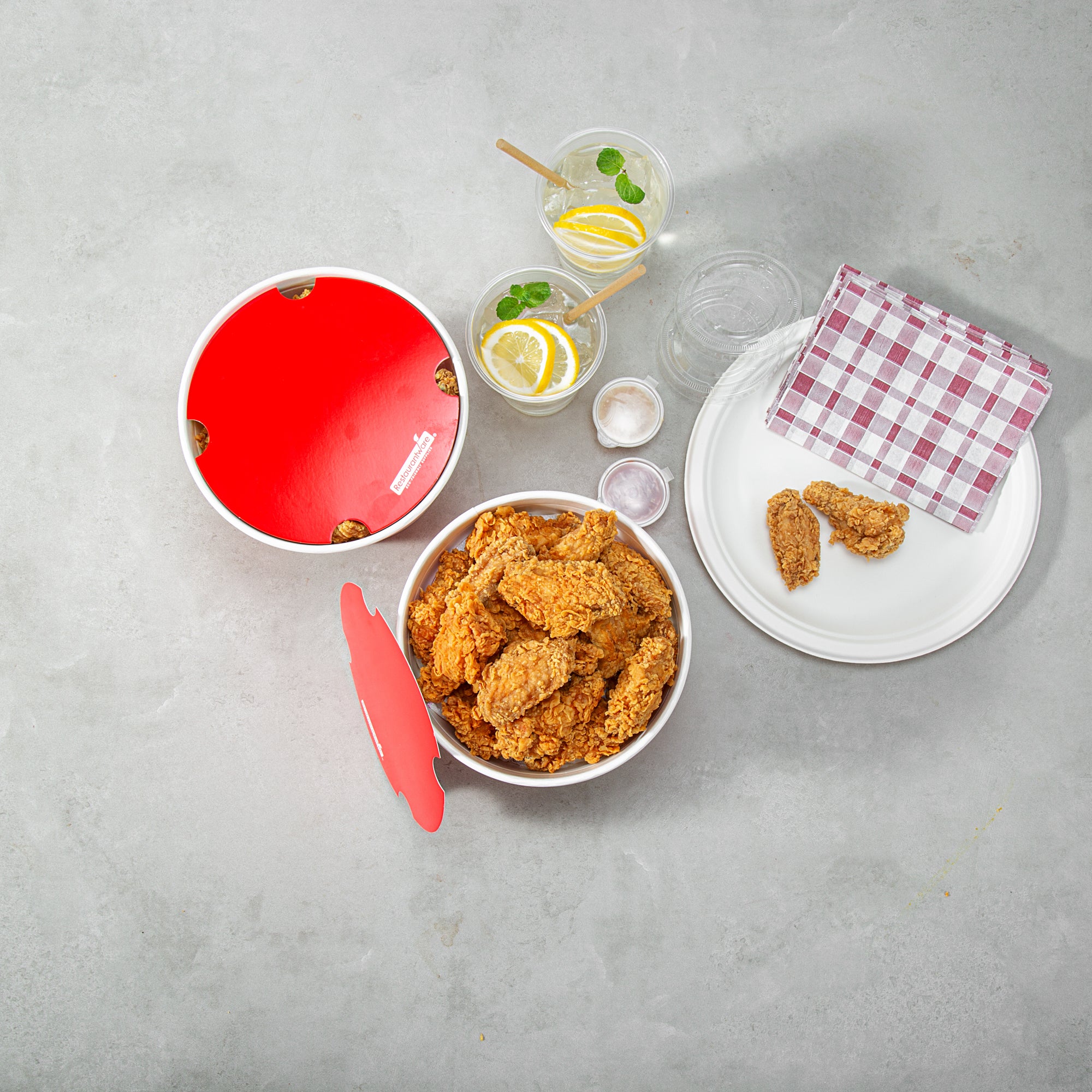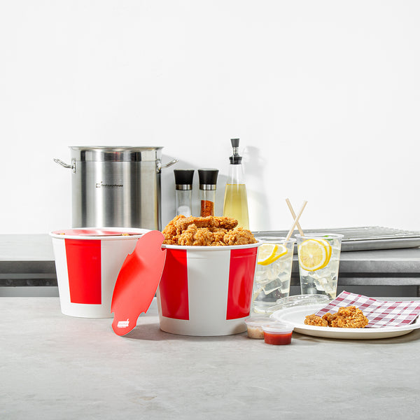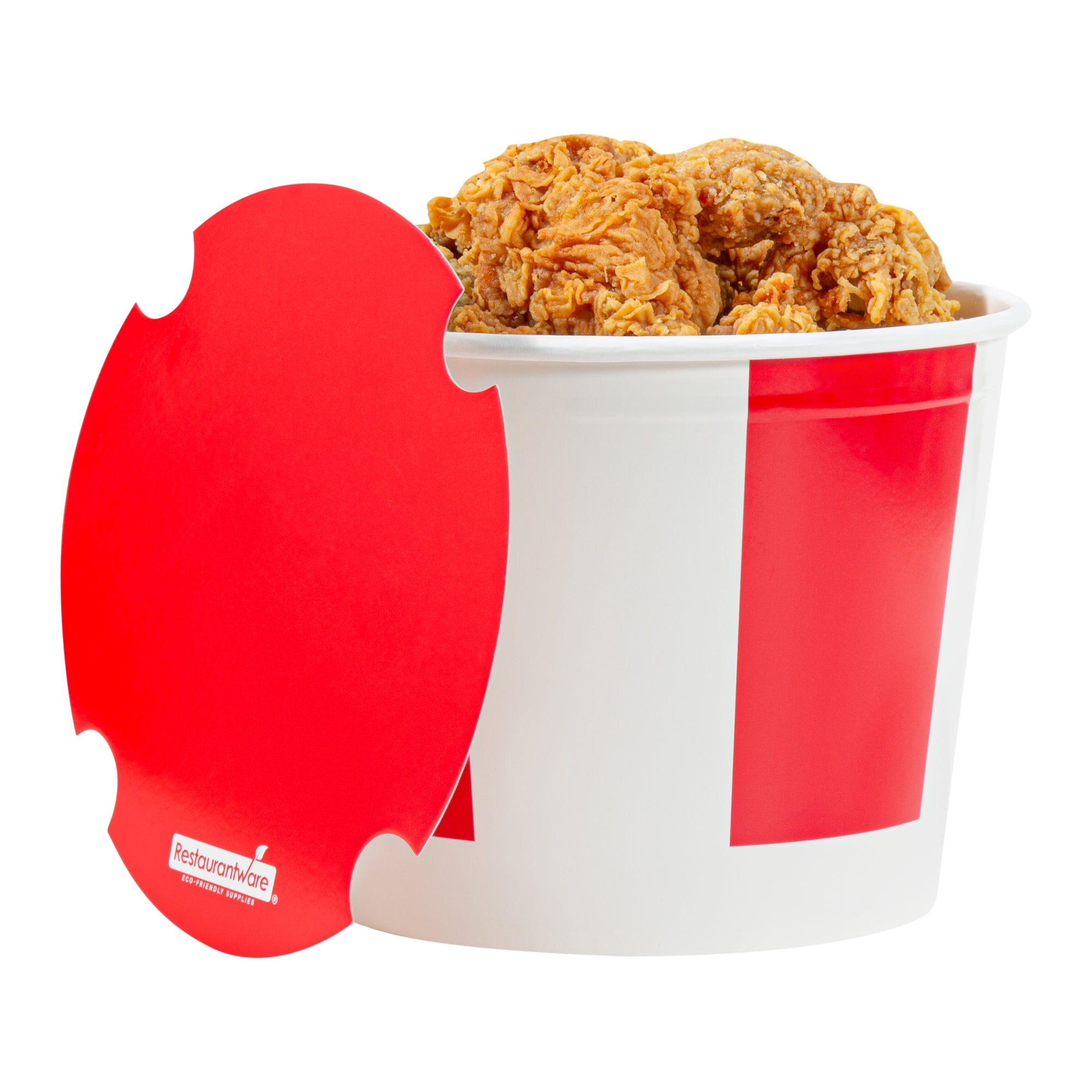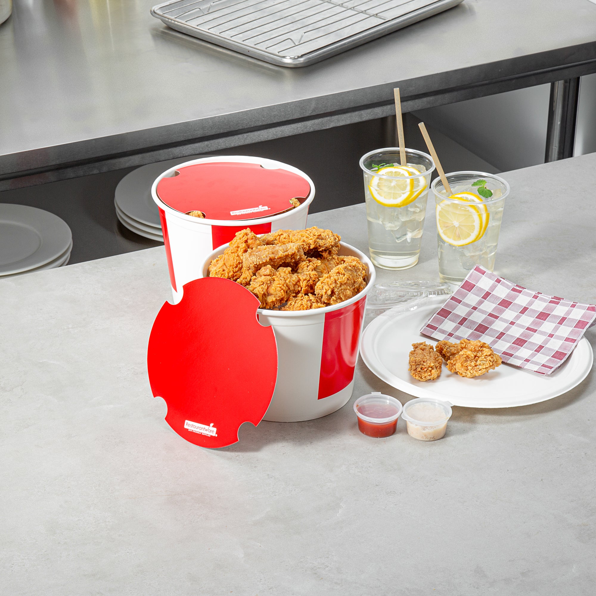 Securely transport meals with our greaseproof takeout bucket with lid. The Bio Tek Red Paper Takeout Bucket With Lid offers an 85-ounce capacity, perfect for serving family-sized chicken bucket portions or bulk orders, ensuring your foodservice operations run smoothly. Equipped with a vented lid, this fried chicken container provides improved insulation and convenience, keeping meals hot and ready-to-serve. Made from durable paper with a polyethylene coating, it is cold food friendly and freezer-safe, allowing for easy storage of prepped meals. Its greaseproof design keeps surfaces tidy, reducing cleanup efforts in bustling kitchens. The classic red and white design enhances visual appeal, making it an ideal choice for catering events and food trucks. Simplify your packaging needs with this recyclable solution, supporting eco-friendly practices. Each order includes 100 Bio Tek Red Paper Takeout Buckets with Lids.