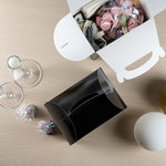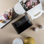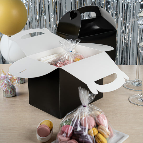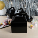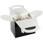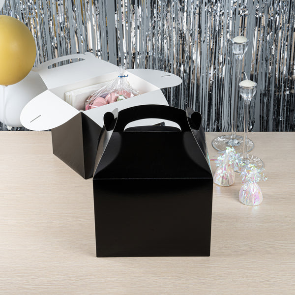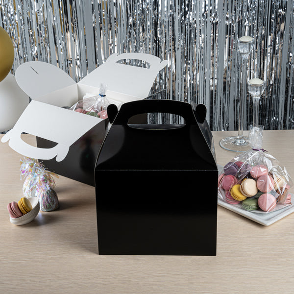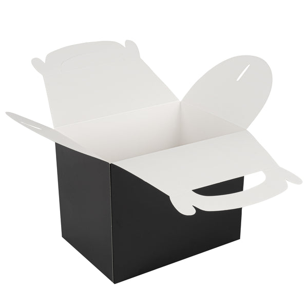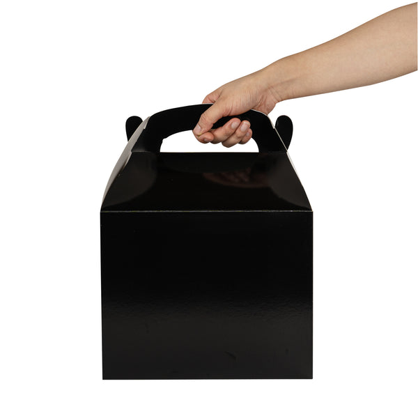Transport meals confidently with greaseproof black kraft gable boxes. The Bio Tek Greaseproof Black Paper Gable Boxes feature a greaseproof lining that prevents oils from seeping through, ensuring your food remains fresh and your packaging clean. Designed with an ergonomic handle, these kraft paper gift boxes enable comfortable carrying of orders, making them ideal for busy catering events or take out operations. Measuring 10 inches long, 7 inches wide, and 8 inches high, these black boxes have a freezer-safe construction, allowing you to store frozen treats without worry. Constructed from recyclable paper, they offer an eco-friendly solution to your packaging needs. Enhance the presentation and functionality of your take out service with these versatile boxes. Each order includes 100 Bio Tek Greaseproof Black Paper Gable Boxes.