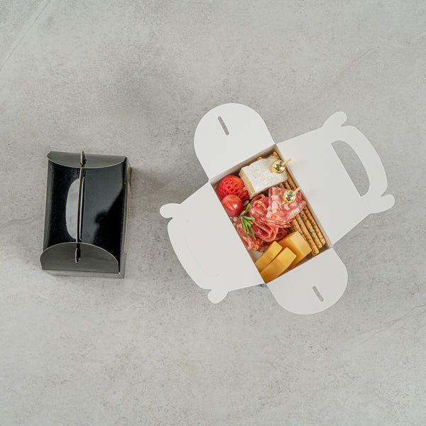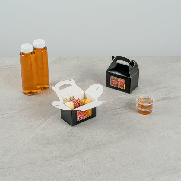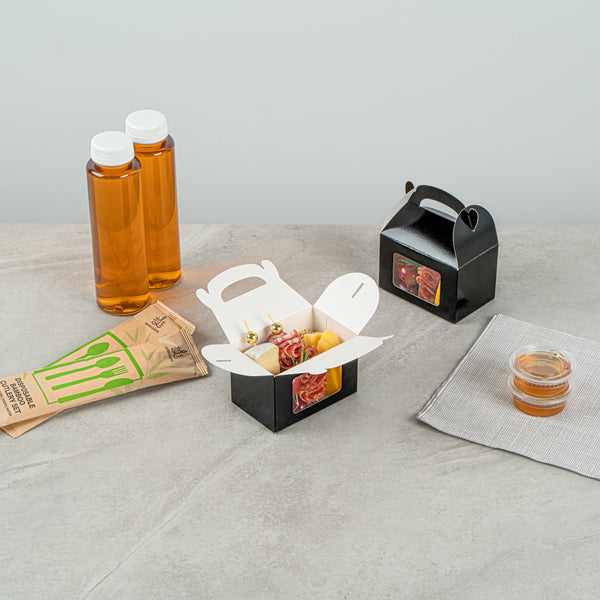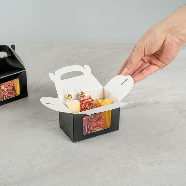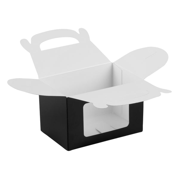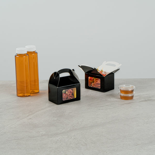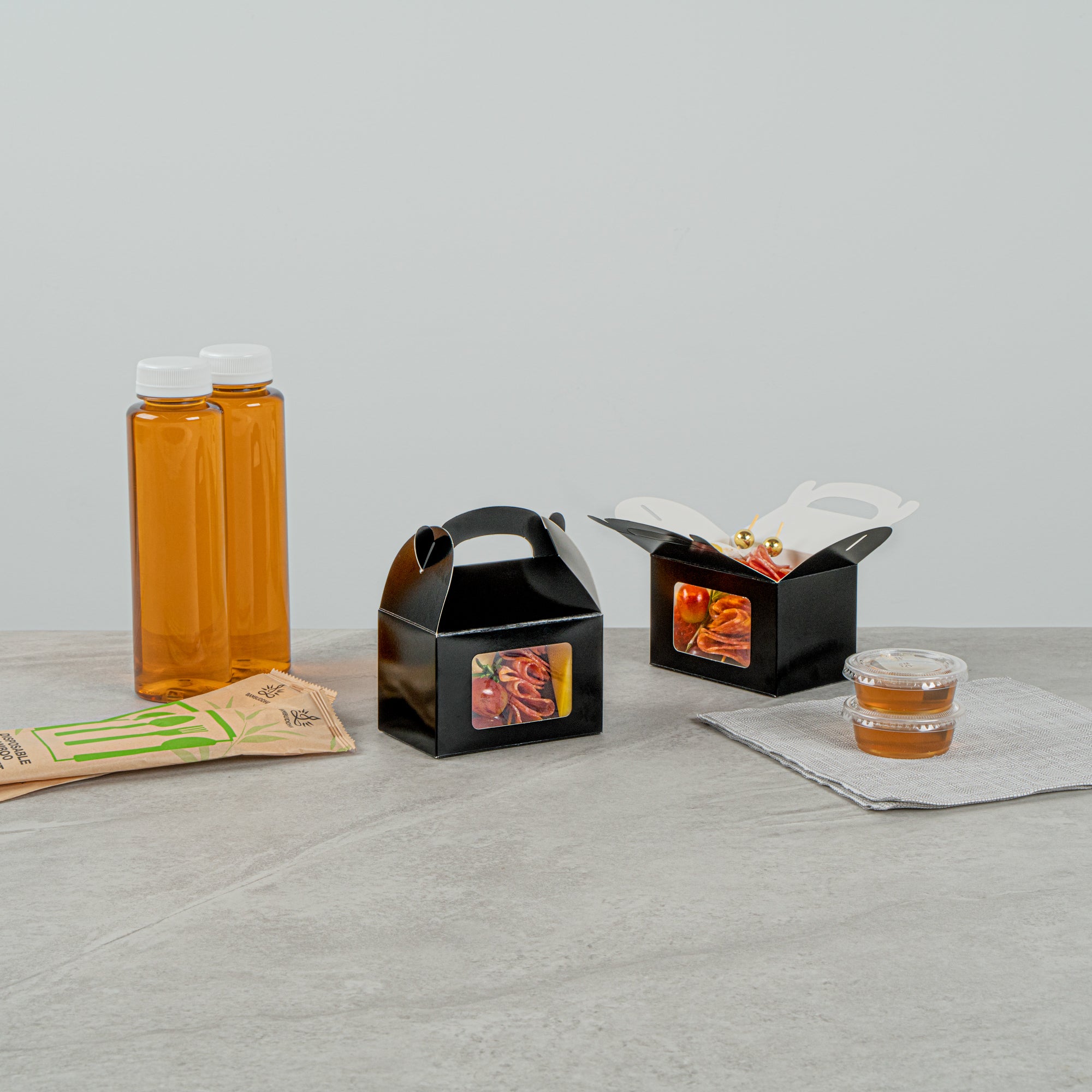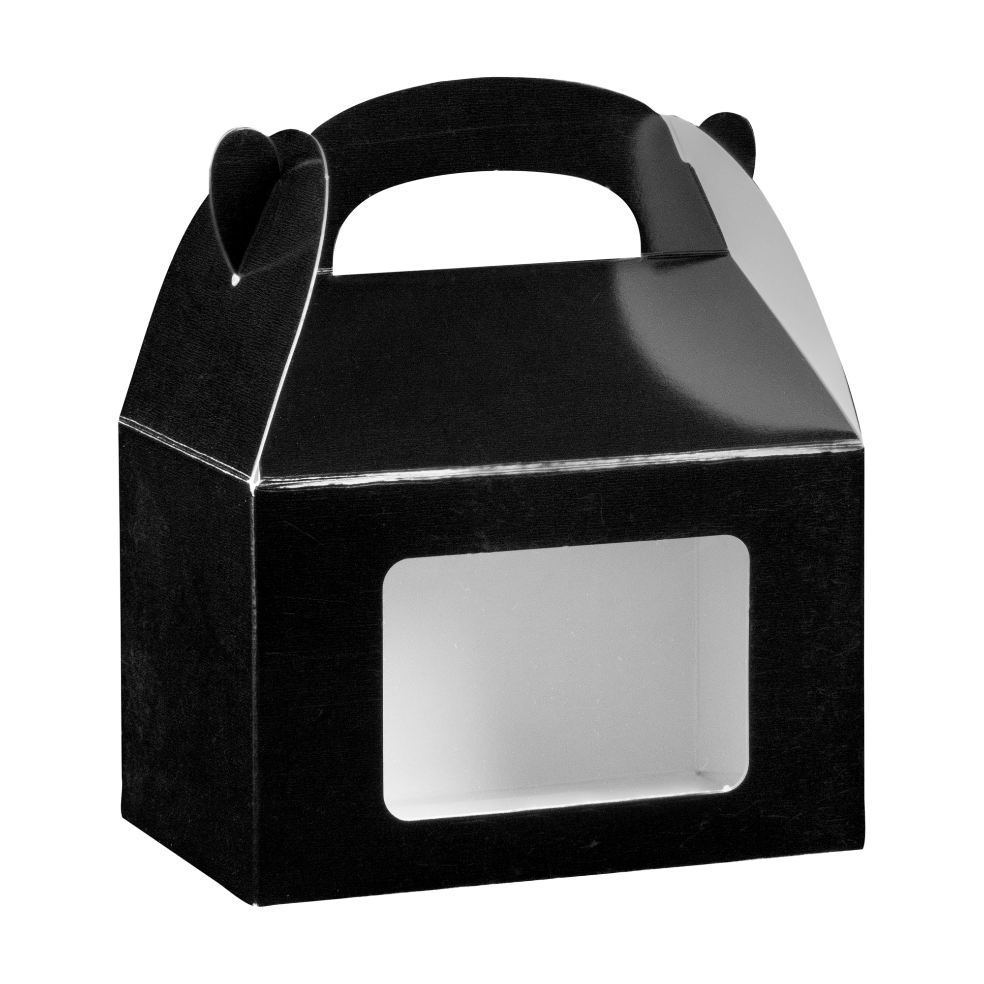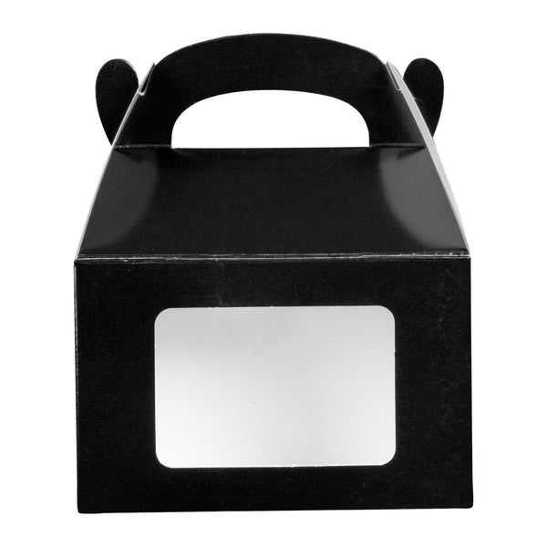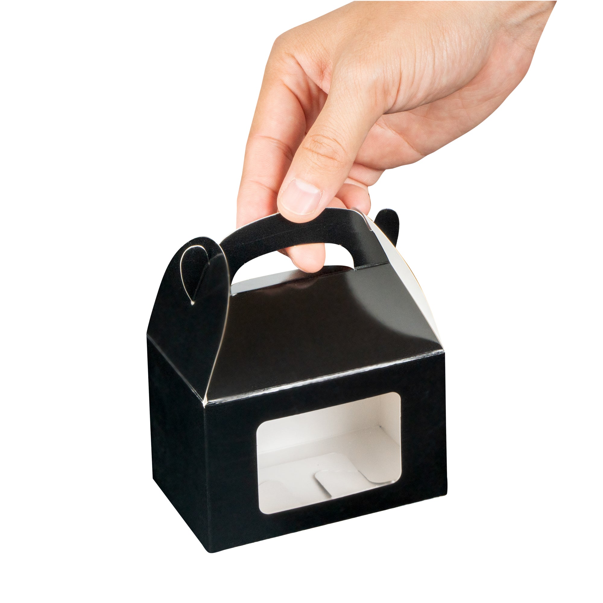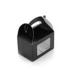 Keep your pastries pristine with greaseproof packaging. Bio Tek Black Greaseproof Gable Gift Boxes feature a greaseproof lining that prevents oil stains, keeping surfaces clean and presentable. These gable gift boxes also have an integrated plastic window that provides an enticing sneak peek of the contents, ideal for showcasing your delectable treats. With a built-in handle, these wedding favor boxes ensure easy and comfortable transport, making them perfect for catering events or bakery orders. Measuring 4 inches in length, 2.5 inches in width, and 2.5 inches in height, these kraft paper boxes are crafted from sturdy paper, offering both durability and elegance to complement your food presentation needs. Enhance the allure of your offerings and streamline your service with these versatile boxes. Each order includes 25 Bio Tek Black Greaseproof Gable Gift Boxes.