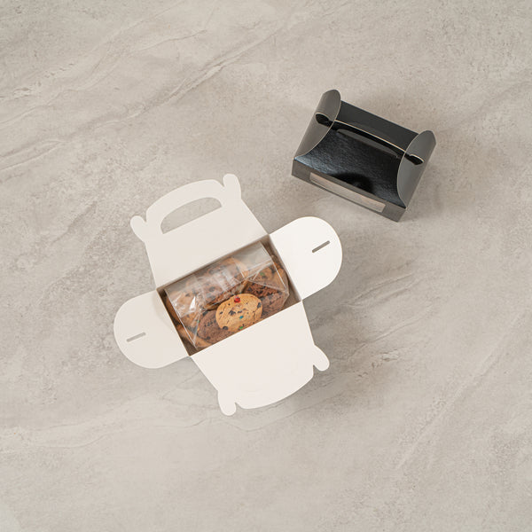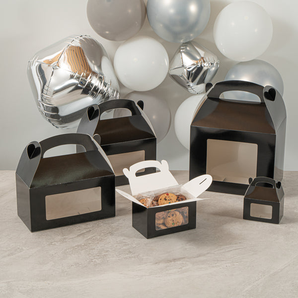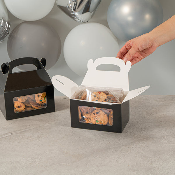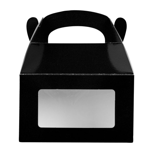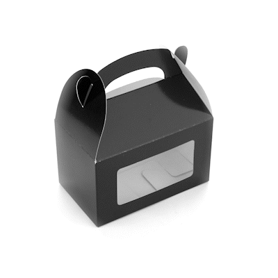 Present food with sophistication using Bio Tek Black Paper Gable Boxes / Take Out Containers, featuring a built-in window that provides a clear view of the items inside. Crafted from sturdy black paper, these containers are recyclable and bring a sleek, modern touch to packaging. Their greaseproof lining prevents leaks from oily or saucy foods, while the freezer-safe construction helps maintain freshness. A built-in handle ensures comfortable portability, making them convenient for customers and staff. Measuring 6 inches in length, 3.5 inches in width, and 3.5 inches in height, these versatile boxes are well-suited for desserts, snacks, or small meals. Shipped in a 100 count box, they balance durability with elevated presentation.