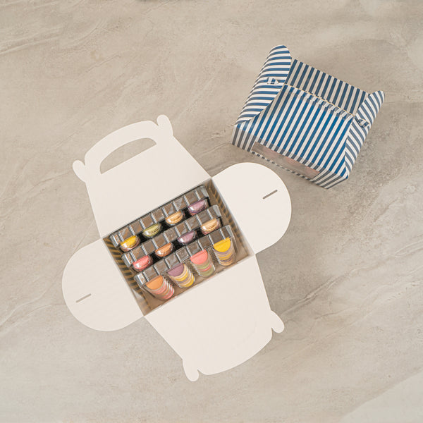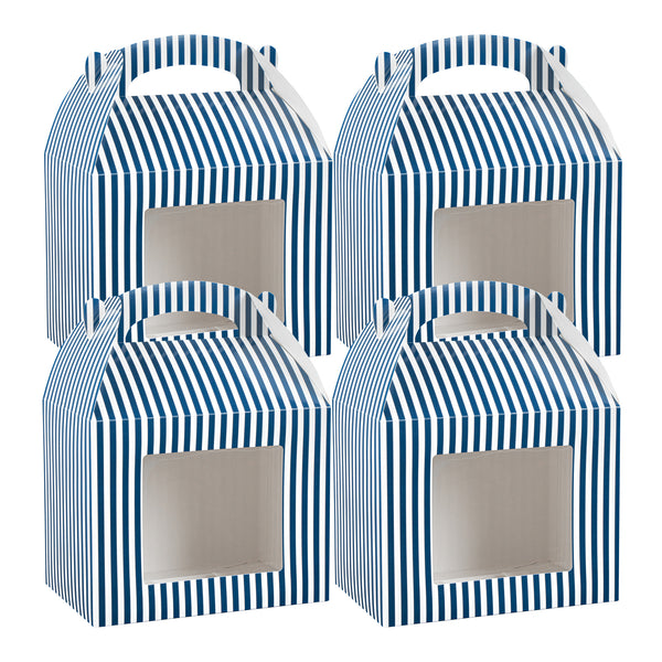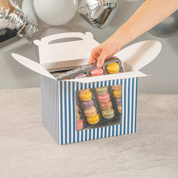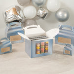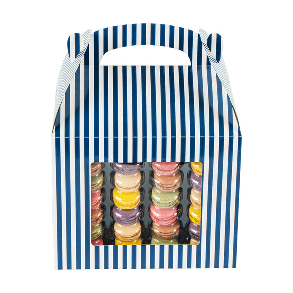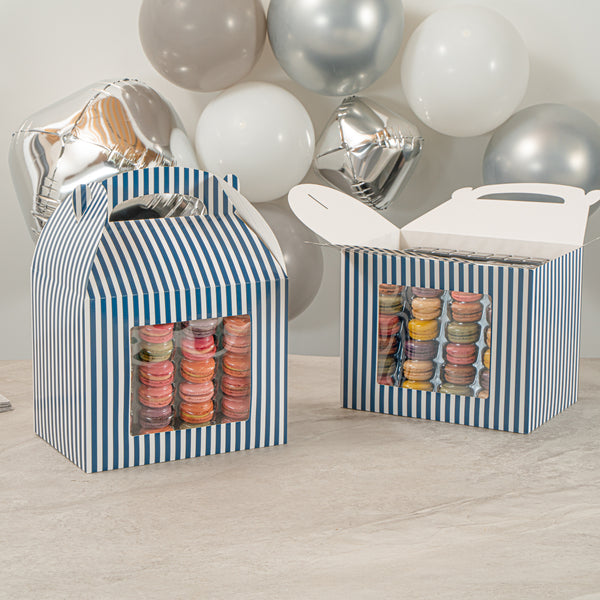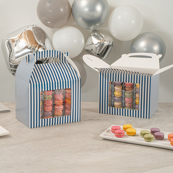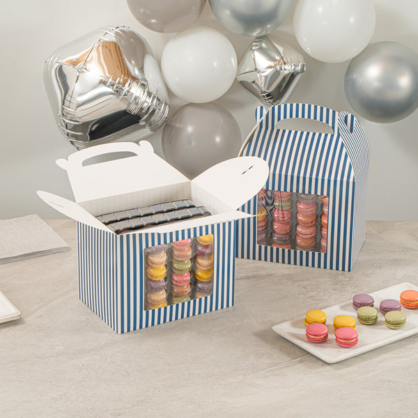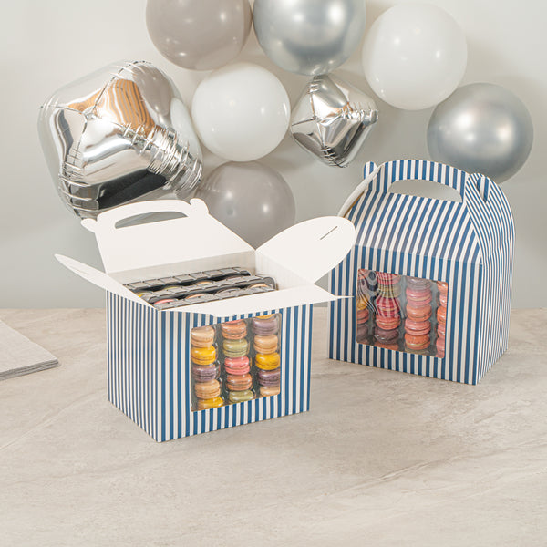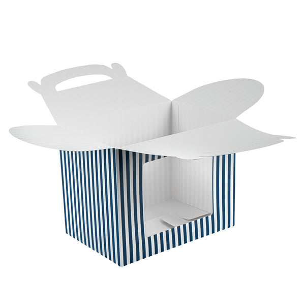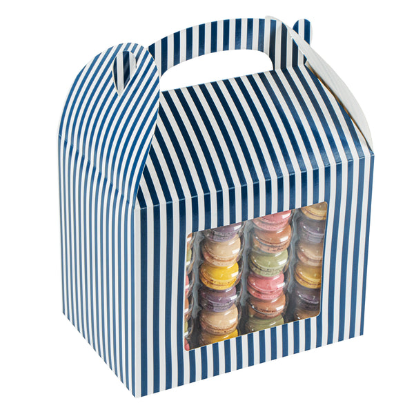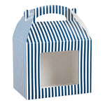 Add a stylish touch to your food packaging with these blue and white striped gable boxes designed for seamless presentation. The Bio Tek Blue and White Stripe Paper Gable Boxes / Take Out Containers include a clear window that showcases baked goods, sandwiches, or confections to customers at a glance. A sturdy built-in handle provides convenience, making it simple for guests to carry their items comfortably. These versatile take out boxes are freezer-safe, offering dependable storage for pastries and desserts without affecting freshness. Measuring 10 inches by 7 inches by 8 inches, they’re the perfect choice for bakeries, catering services, and cafes. Made from recyclable paper, these favor boxes support sustainable practices while maintaining an eye-catching design. Select these striped gable boxes to package foods with both functionality and charm. Sold in a 100 count box.