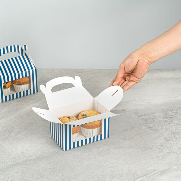 Package your offerings with charm using Bio Tek Blue & White Stripe Paper Gable Boxes / Take Out Containers. A clear window highlights the contents inside, creating an eye-catching display for baked goods, candies, or favors. The bold striped pattern adds a fun, modern look to packaging, while the recyclable paper material makes them a sustainable option for businesses. Designed to be freezer-safe, they keep items fresh until serving, offering both style and practicality. Each box is equipped with a convenient handle for effortless carrying. With dimensions of 6 inches in length, 3.5 inches in width, and 3.5 inches in height, these versatile containers are great for small meals and desserts. Shipped in a 25 count box.
