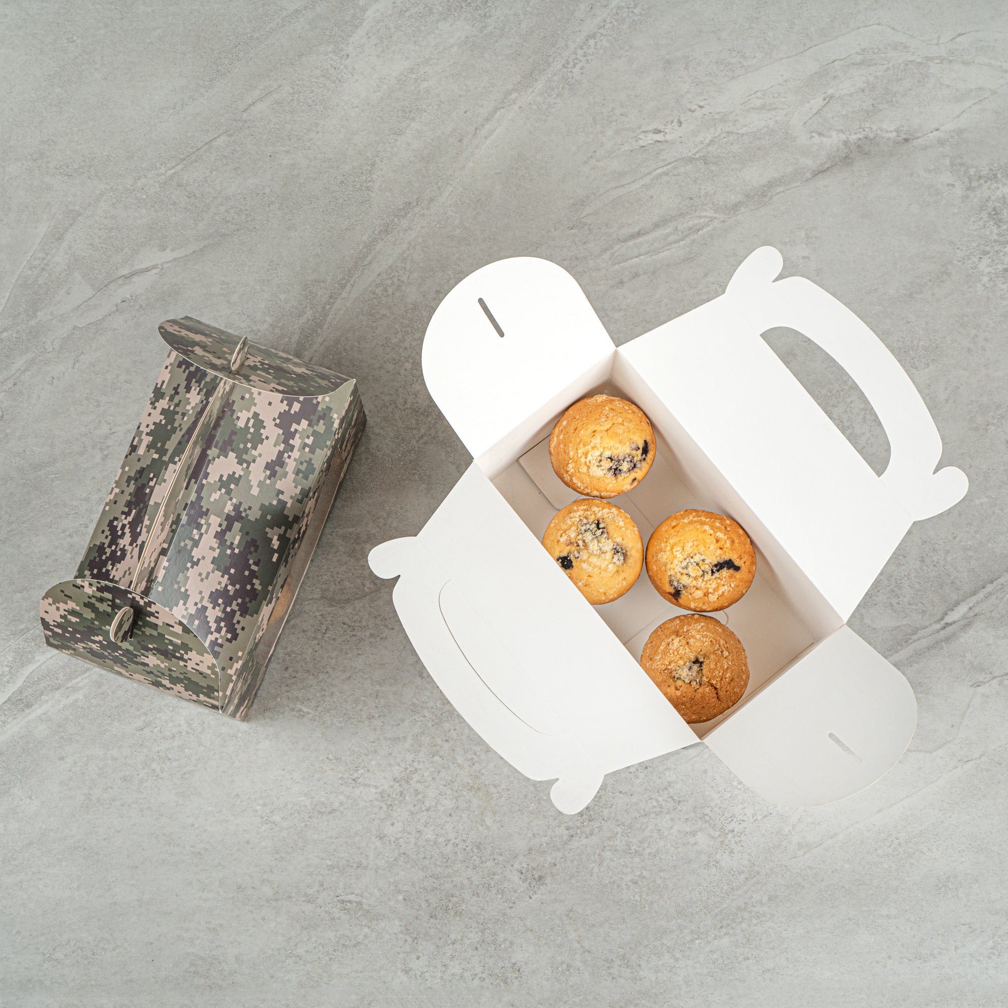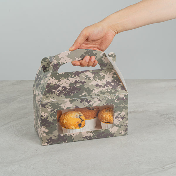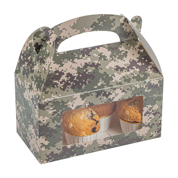 Showcase your creations with style and ease. Bio Tek Camouflage Paper Gable Boxes / Take Out Containers feature an integrated plastic window that offers enticing sneak peeks, ensuring your bakery delights or gourmet treats attract attention. Crafted from sturdy paper, these green gift boxes are not only visually appealing but also provide reliable protection for your goods. Their built-in handle ensures comfortable carrying of orders, making them ideal cardboard gable boxes for busy caterers and bakers. The freezer-safe design of these treat boxes with handles allows you to store desserts and pastries, preserving their freshness for future events. Measuring 9.5 inches in length, 5 inches in width, and 5 inches in height, these boxes are crafted from sturdy paper, making them cold food friendly, freezer-safe, hot food friendly, and recyclable. Sold in a 25 count box.
