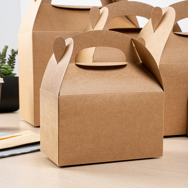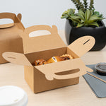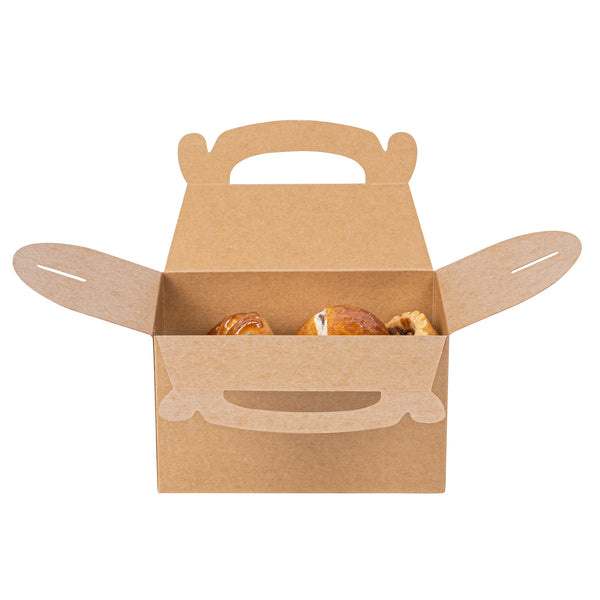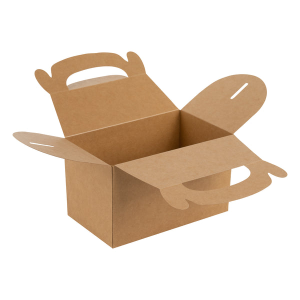 Secure your food orders with versatile kraft gable boxes. Bio Tek Greaseproof Kraft Gable Boxes provide a greaseproof lining that prevents messy oil seepage, ensuring your fried foods stay fresh and clean. The built-in handle ensures easy order transport, allowing staff and customers alike to carry meals comfortably and effortlessly, making these kraft gift boxes a practical choice for catering events or takeout services. Designed with a freezer-safe feature, these boxes are perfect for storing frozen treats without compromising the integrity of your delicious offerings, ideal for bakeries and dessert shops utilizing cardboard favor boxes for their frozen goods. Constructed from recyclable kraft paper, these 6-inch by 3.5-inch by 3.5-inch boxes minimize environmental impact while maximizing operational efficiency for foodservice professionals. Enhance your food packaging solutions today by choosing these reliable kraft gable boxes. Each order includes 100 Bio Tek Greaseproof Kraft Gable Boxes.