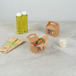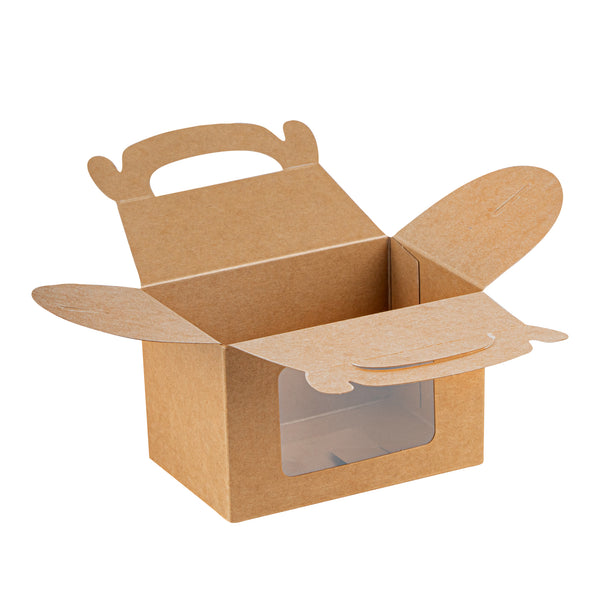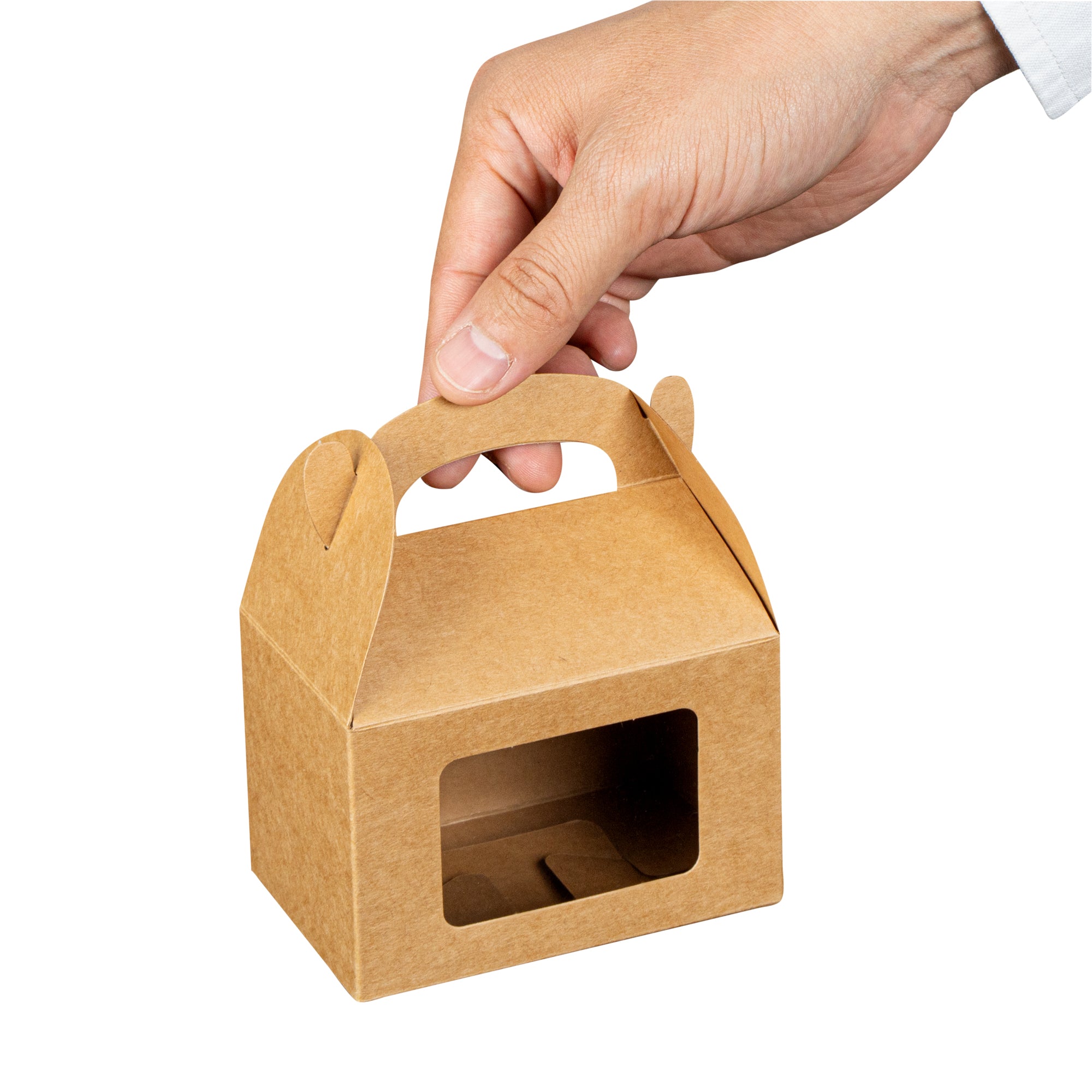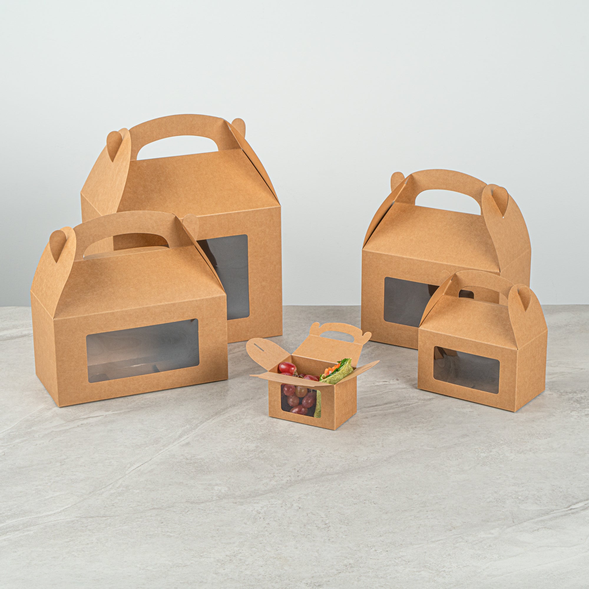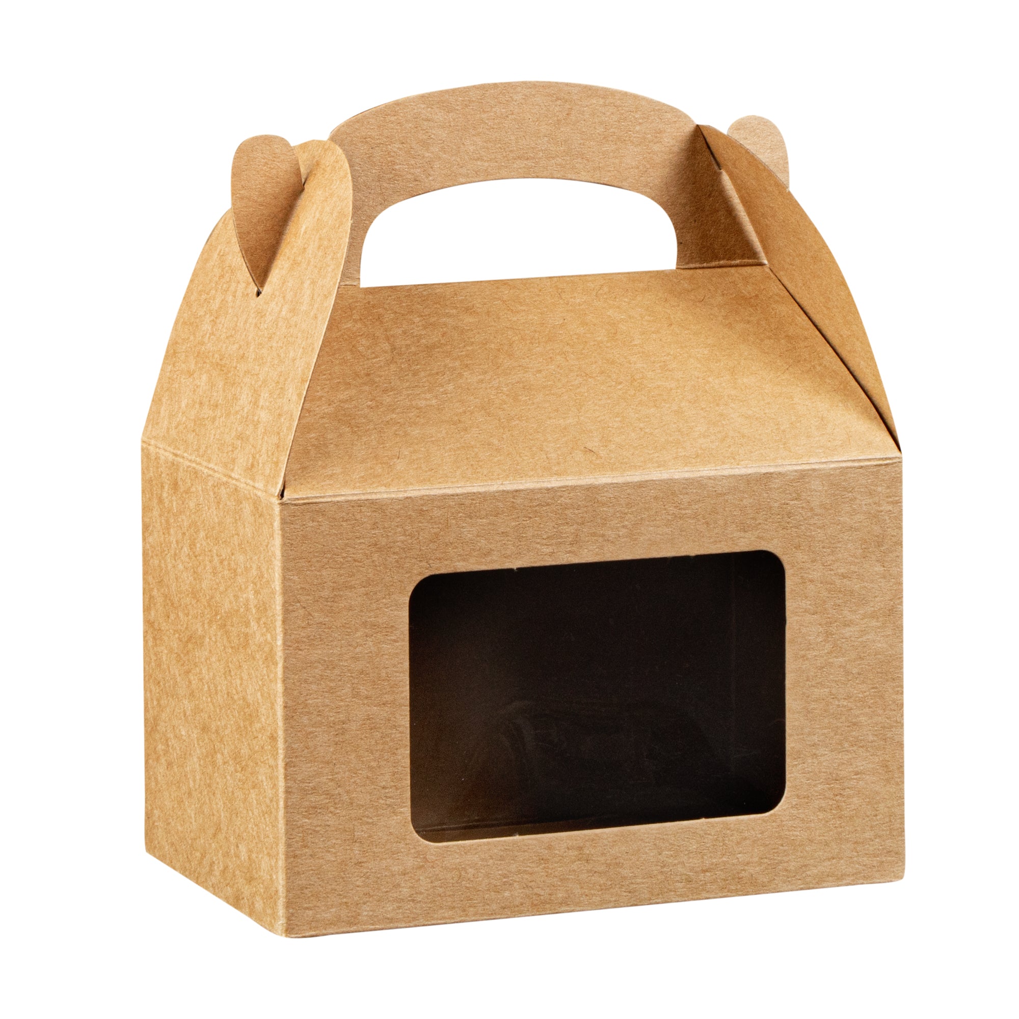 Highlight your treats with Bio Tek Kraft Paper Gable Boxes / Take Out Containers, designed with a built-in clear window that showcases the contents inside. Made from strong kraft paper, these boxes are recyclable, offering a durable yet eco-conscious packaging option. Their greaseproof lining keeps oils and sauces from seeping through, while the freezer-safe design helps preserve freshness during storage. Equipped with a sturdy handle, these containers make transport effortless for both staff and guests. Compact in size at 4 inches long, 2.5 inches wide, and 2.5 inches tall, they are ideal for candies, cookies, or small bakery items. Sold in a 100 count box, these kraft gable boxes combine reliability with presentation.