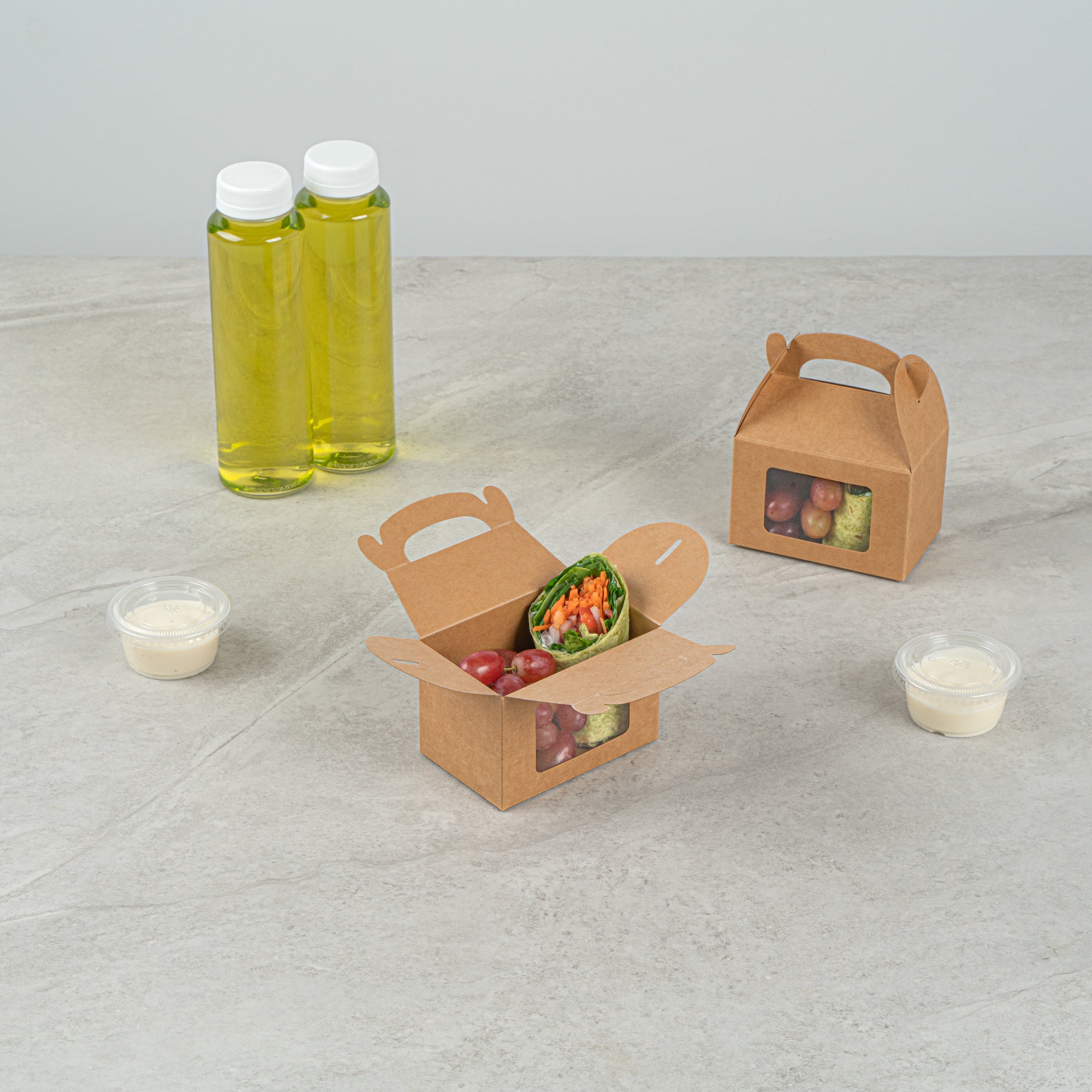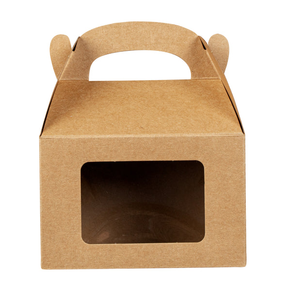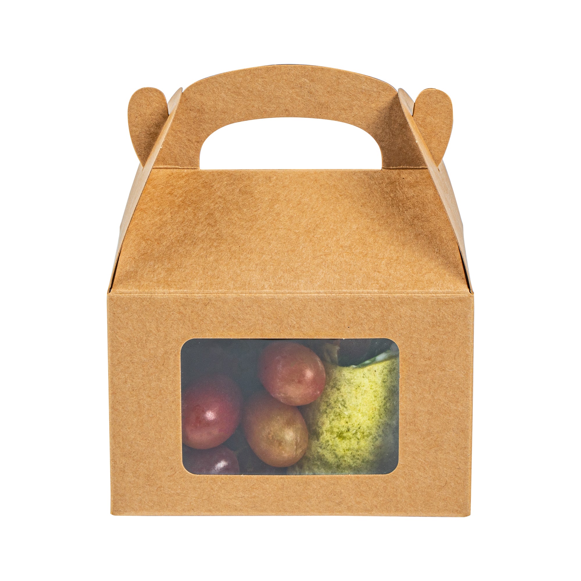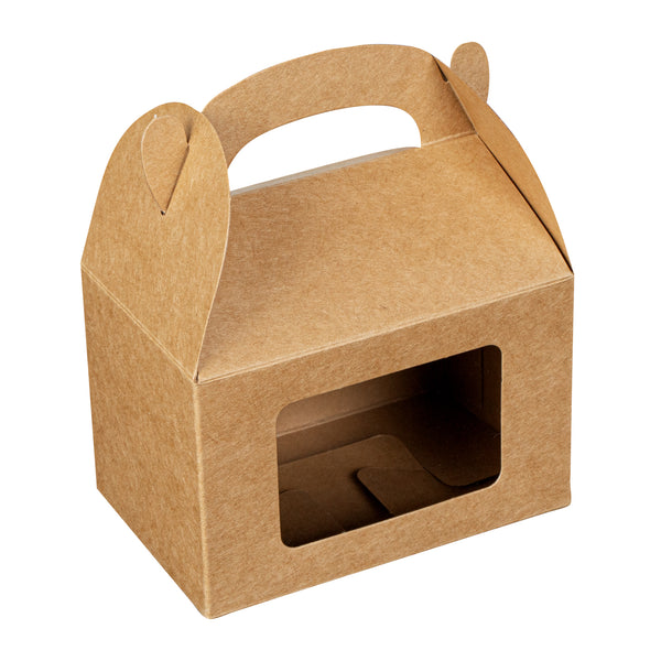 Highlight your treats with Bio Tek Kraft Paper Gable Boxes / Take Out Containers, designed with a built-in clear window that showcases the contents inside. Made from strong kraft paper, these boxes are recyclable, offering a durable yet eco-conscious packaging option. Their greaseproof lining keeps oils and sauces from seeping through, while the freezer-safe design helps preserve freshness during storage. Equipped with a sturdy handle, these containers make transport effortless for both staff and guests. Compact in size at 4 inches long, 2.5 inches wide, and 2.5 inches tall, they are ideal for candies, cookies, or small bakery items. Sold in a 25 count box, these kraft gable boxes combine reliability with presentation.