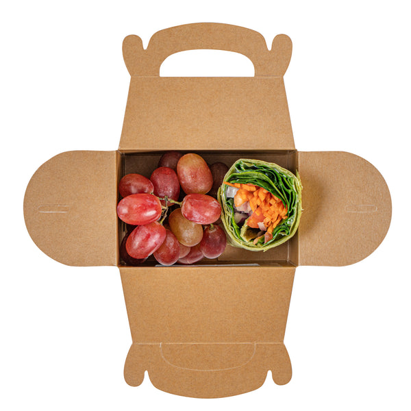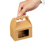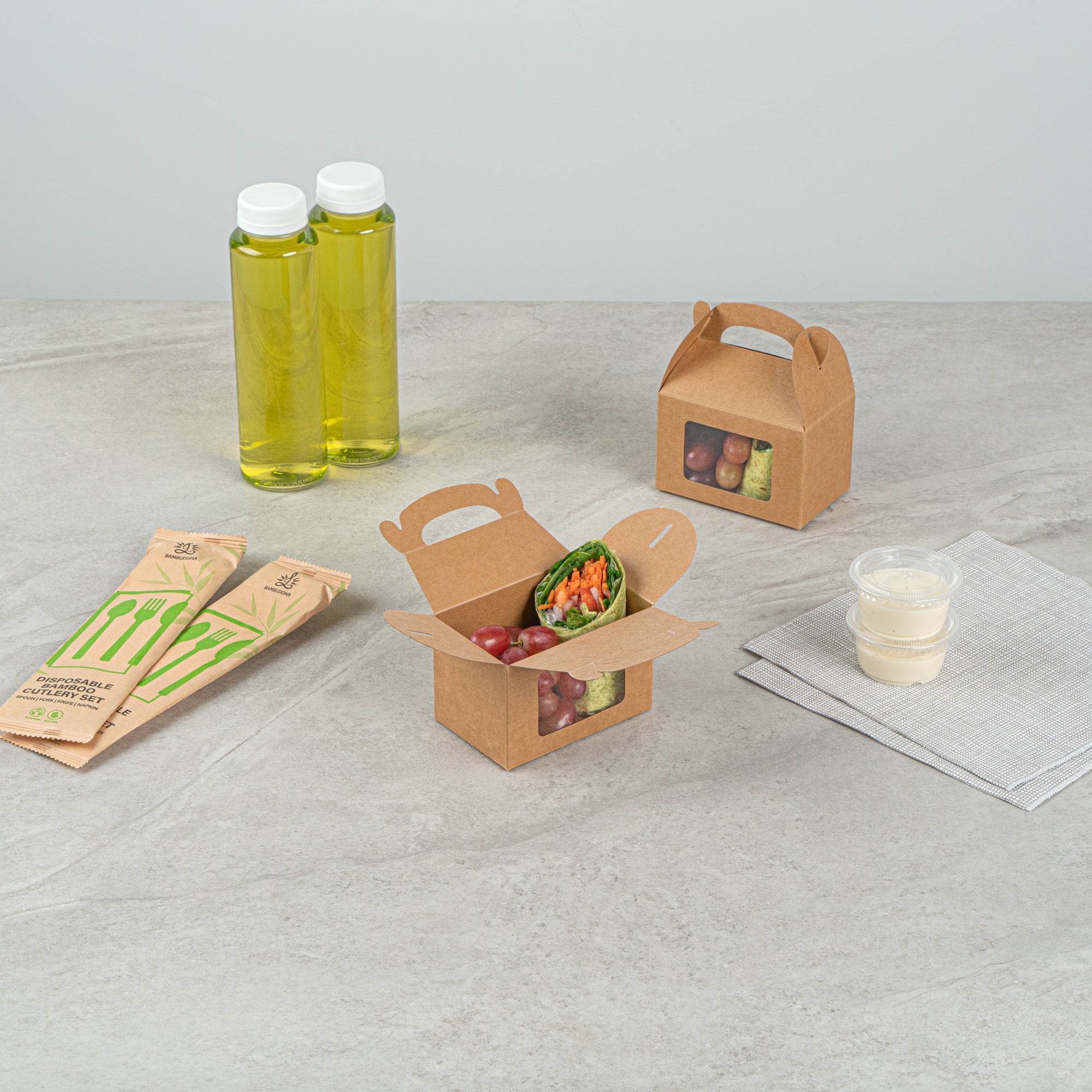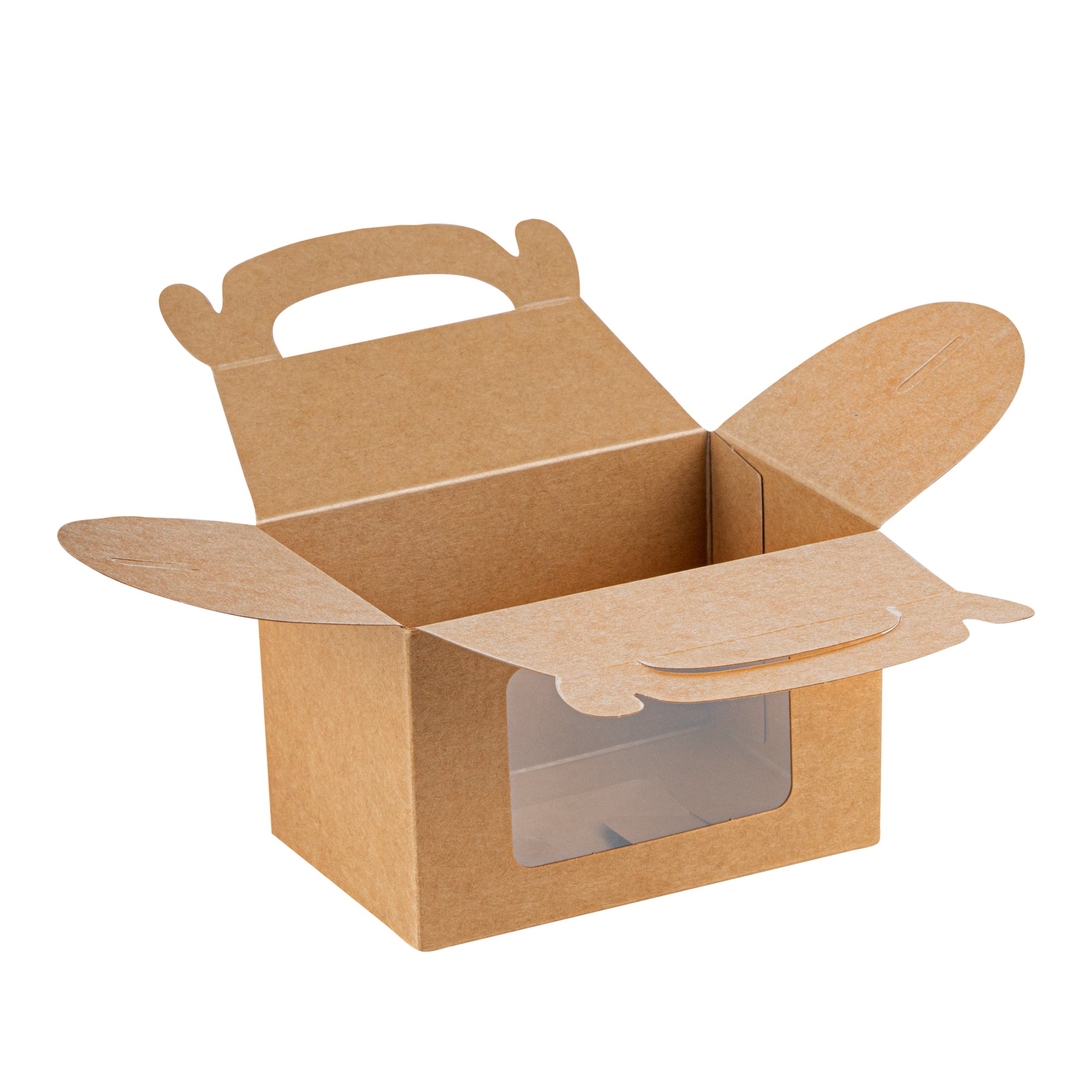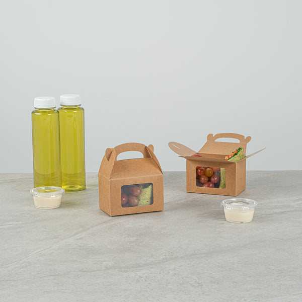Highlight your treats with Bio Tek Kraft Paper Gable Boxes / Take Out Containers, designed with a built-in clear window that showcases the contents inside. Made from strong kraft paper, these boxes are recyclable, offering a durable yet eco-conscious packaging option. Their greaseproof lining keeps oils and sauces from seeping through, while the freezer-safe design helps preserve freshness during storage. Equipped with a sturdy handle, these containers make transport effortless for both staff and guests. Compact in size at 4 inches long, 2.5 inches wide, and 2.5 inches tall, they are ideal for candies, cookies, or small bakery items. Sold in a 25 count box, these kraft gable boxes combine reliability with presentation.