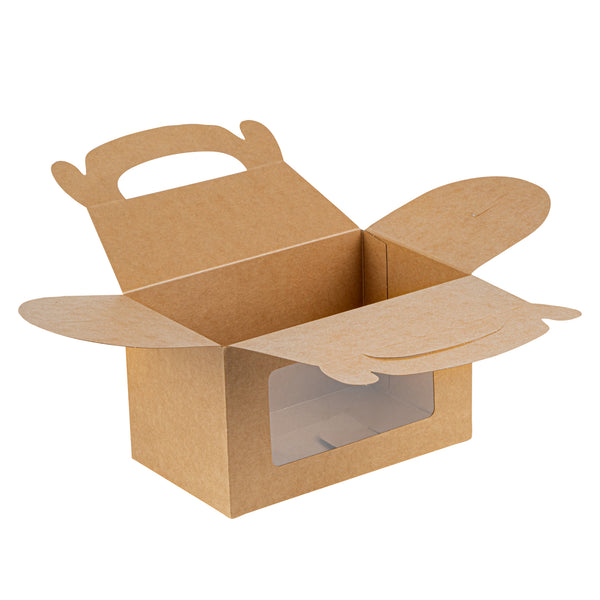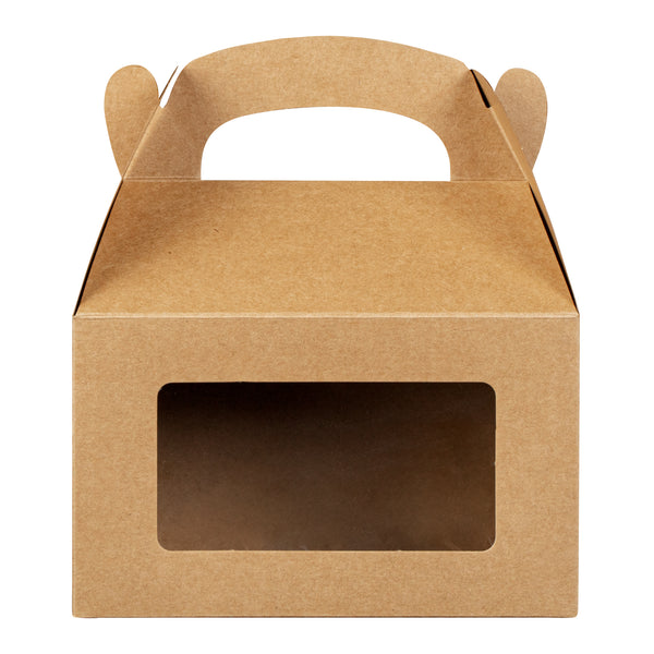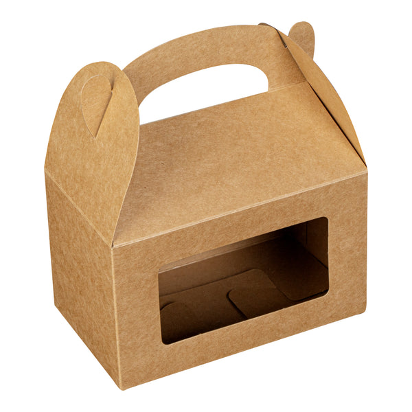Prevent messy leaks with greaseproof gable gift boxes. Bio Tek Kraft Paper Gable Box / Take Out Containers feature a greaseproof lining that effectively prevents oils from seeping through, keeping surfaces immaculate and ensuring a tidy presentation. These kraft paper boxes are crafted from sturdy paper and include an integrated plastic window, providing customers an enticing sneak peek of the contents without opening the package. Ideal for bakeries and delis, their freezer-safe design allows you to store treats for future use, maintaining freshness and extending the shelf life of your delicacies. With dimensions measuring 6 inches in length, 3.5 inches in width, and 3.5 inches in height, these cardboard treat boxes accommodate a variety of pastries and confectioneries. Make your packaging as appealing as your treats by incorporating these versatile gift boxes into your service. Sold in a 100 count box.