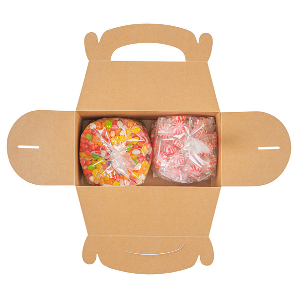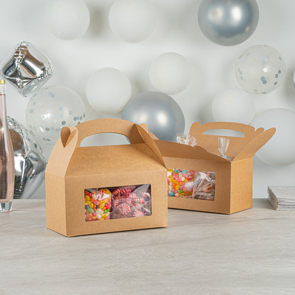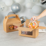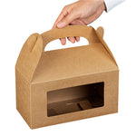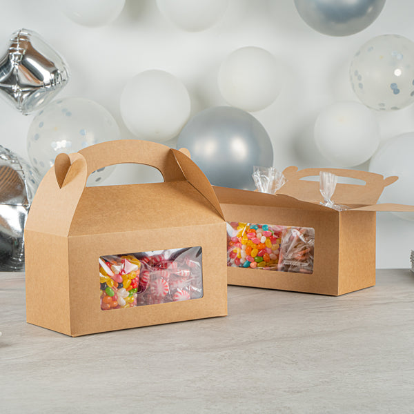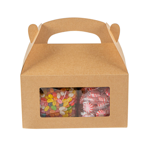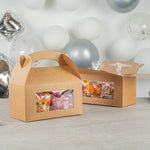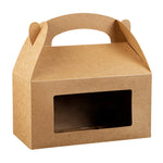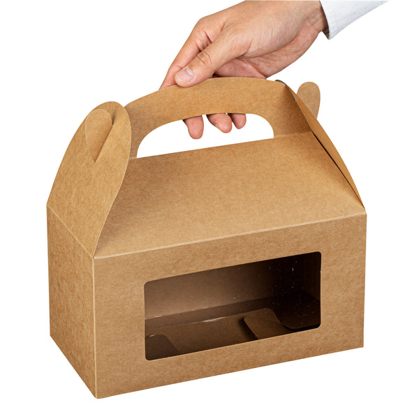 Showcase your delicious creations with ease. Bio Tek Kraft Paper Gable Boxes / Take Out Containers feature a greaseproof lining to effectively prevent oils from seeping through, maintaining a clean presentation on any surface. These kraft paper gift boxes integrate a clear plastic window, providing a tempting sneak peek of the contents, perfect for enticing customers and enhancing the visual appeal of your offerings. With dimensions of 9.5 inches length, 5 inches width, and 5 inches height, these party favor boxes are ideal for a variety of baked goods and takeaway items. The built-in handle ensures comfortable transport, making it easier for your staff to carry orders and improve service efficiency. Crafted from recyclable paper, these boxes are an eco-friendly choice for businesses committed to sustainability. Sold in a 100 count box.