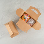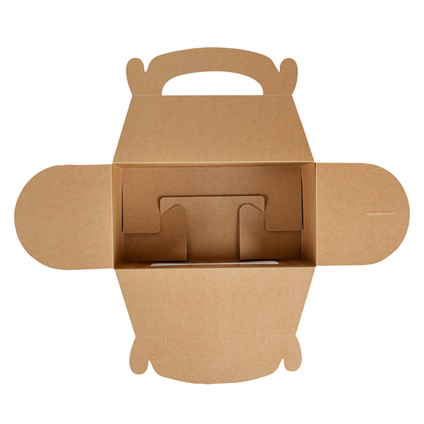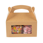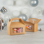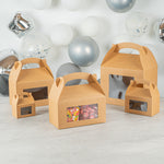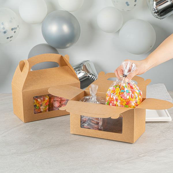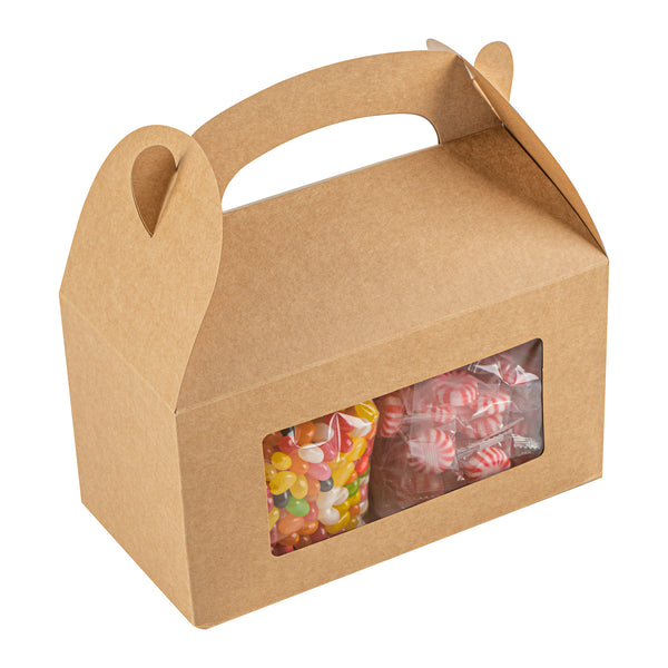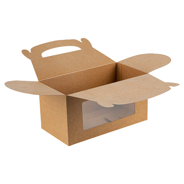 Showcase your delicious creations with ease. Bio Tek Kraft Paper Gable Boxes / Take Out Containers feature a greaseproof lining to effectively prevent oils from seeping through, maintaining a clean presentation on any surface. These kraft paper gift boxes integrate a clear plastic window, providing a tempting sneak peek of the contents, perfect for enticing customers and enhancing the visual appeal of your offerings. With dimensions of 9.5 inches length, 5 inches width, and 5 inches height, these party favor boxes are ideal for a variety of baked goods and takeaway items. The built-in handle ensures comfortable transport, making it easier for your staff to carry orders and improve service efficiency. Crafted from recyclable paper, these boxes are an eco-friendly choice for businesses committed to sustainability. Sold in a 25 count box.