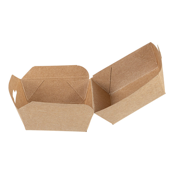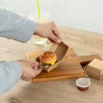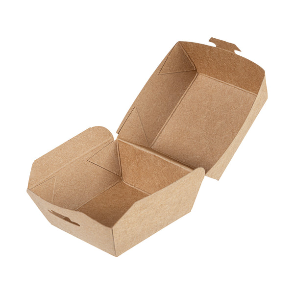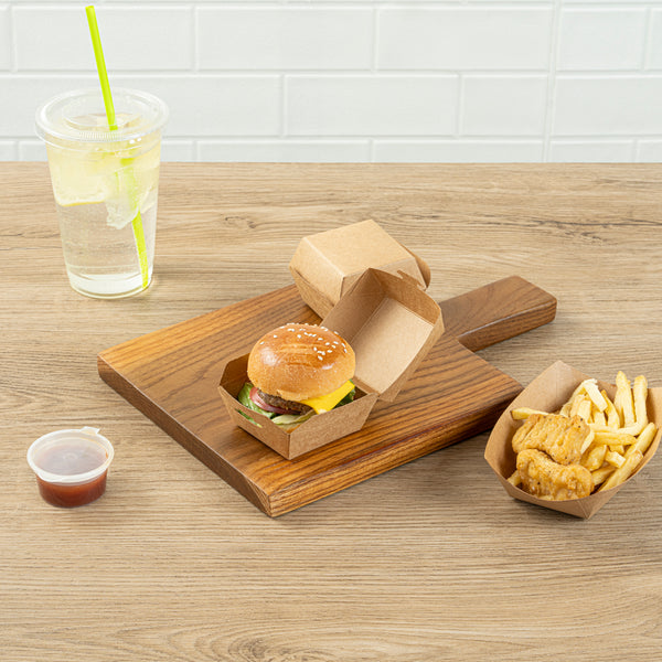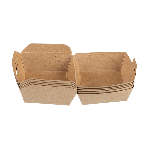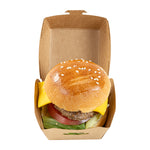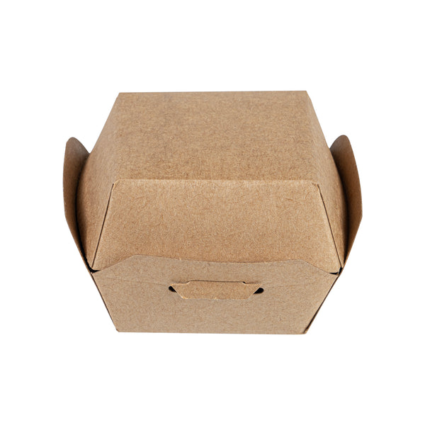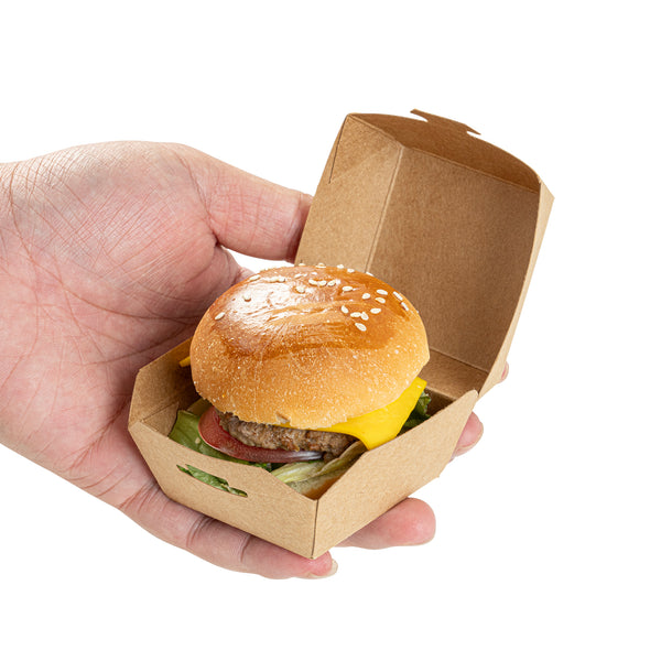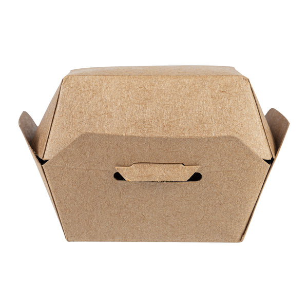 Provide a unique serving solution for miniature burgers, sandwiches, and sweets with our Bio Tek Kraft Paper Slider Boxes. Constructed from premium kraft paper, these burger boxes are durable and sturdy. The tab closure of these clamshell food containers keeps their content secure during delivery. Featuring a kraft brown finish, these takeout boxes create an upscale impression while serving food. For a breezy cleanup, these paper slider containers are disposable. These slider packaging boxes measure 2.5 inches in length by 2.5 inches in width by 2 inches in height, perfectly sized for miniature portions. Sold in a 100 count box.