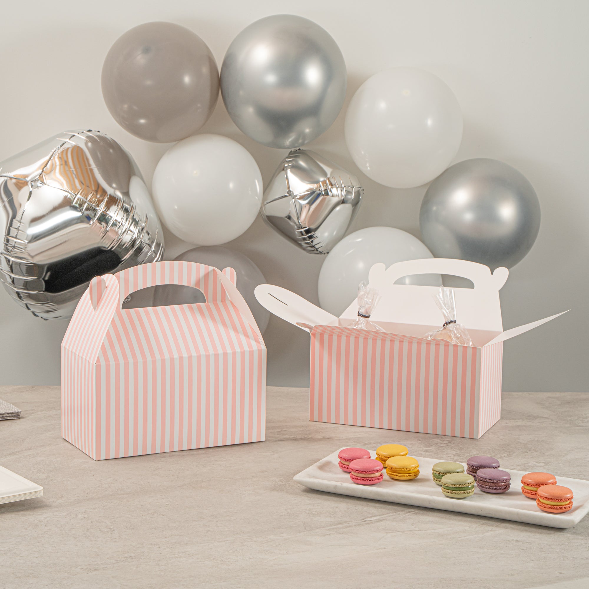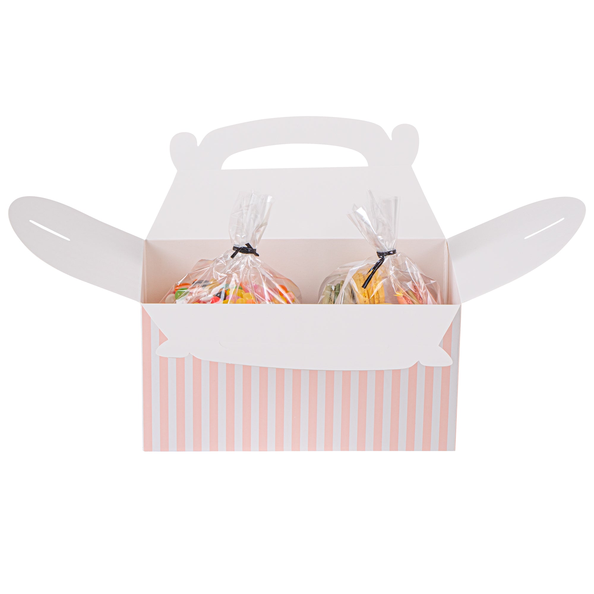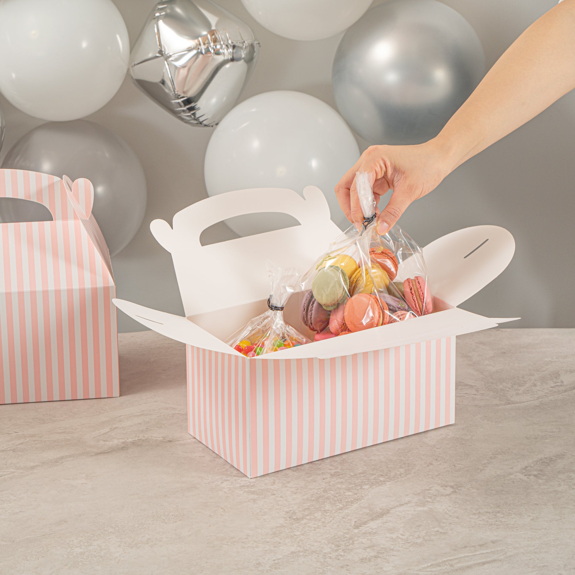 Enhance your foodservice presentation with charming, portable packaging. Bio Tek Freezer-Safe Gable Gift Boxes combine the elegance of pink and white stripes with the practicality of a freezer-safe design, allowing you to store frozen treats without compromising style. These gable gift boxes feature built-in handles for comfortable transport, making it easy to carry orders securely and conveniently. Crafted from paper, these party favor boxes support sustainability initiatives while providing a cold food-friendly and hot food-friendly option for various culinary creations. With dimensions of 9.5 inches in length, 5 inches in width, and 5 inches in height, these kraft boxes offer ample space for an array of items, ensuring versatility in presentation. Elevate your packaging game and impress your guests with these sustainably conscious solutions. Each order includes 25 Bio Tek Freezer-Safe Gable Gift Boxes.