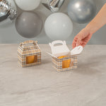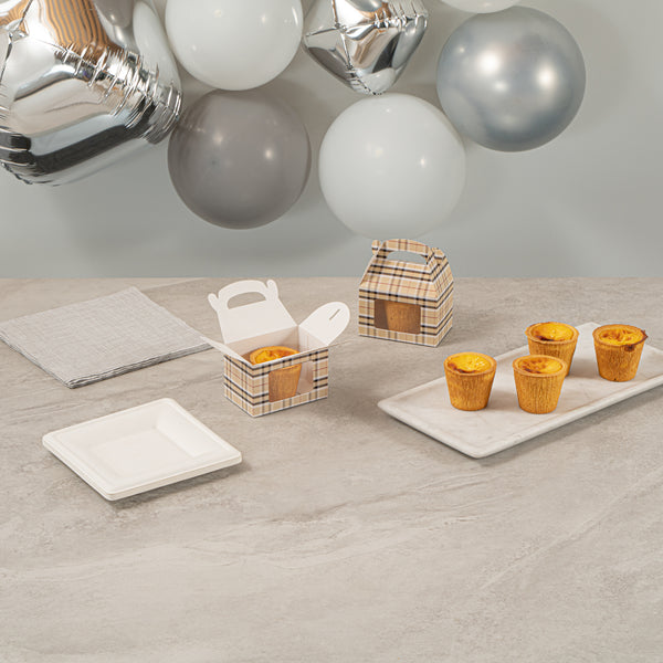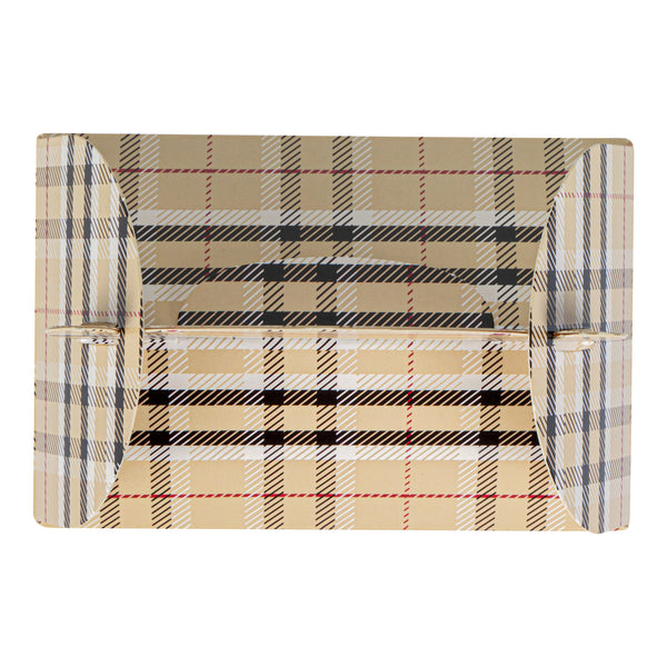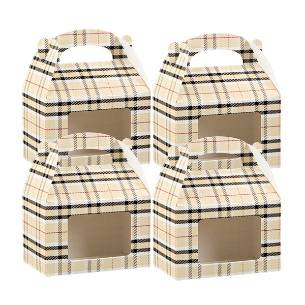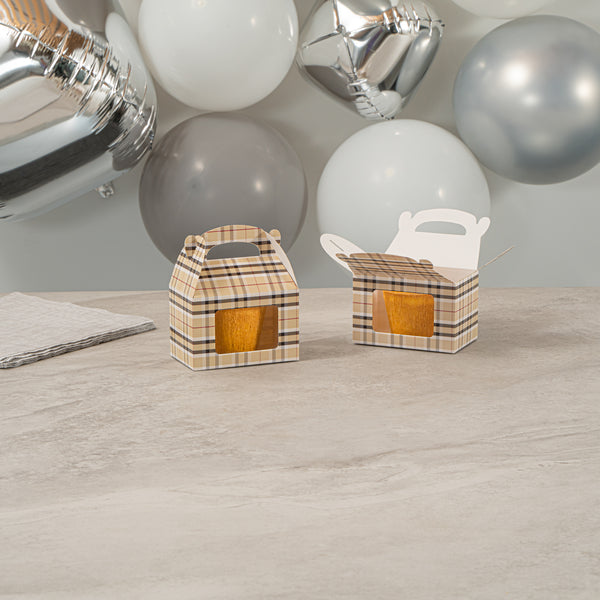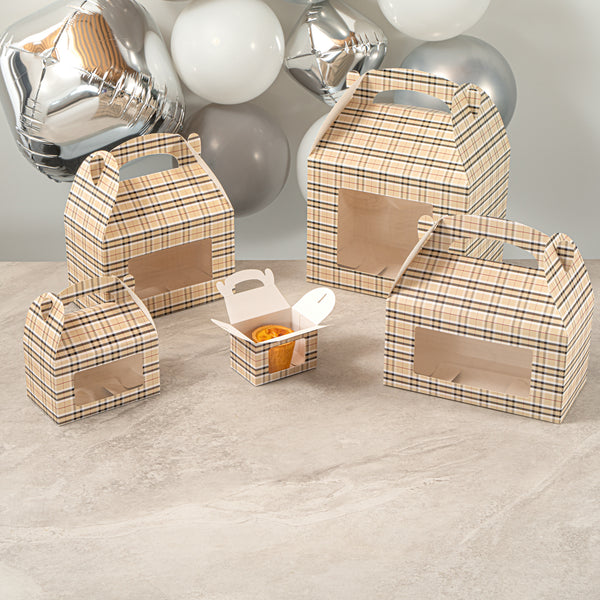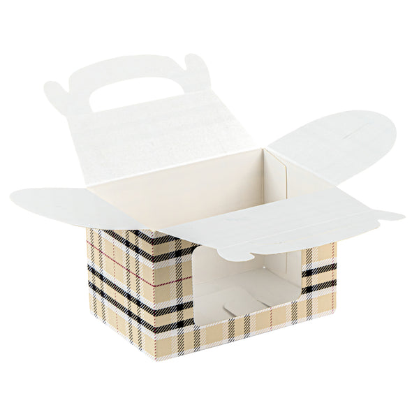 Bring rustic charm to your presentation with Bio Tek Plaid Paper Gable Boxes / Take Out Containers. The classic plaid print adds a cozy, nostalgic touch that pairs perfectly with baked goods or seasonal treats. Made from strong paper, these containers are recyclable, providing both durability and a sustainable solution. A built-in window showcases the contents inside, helping attract attention to baked goods, candies, or keepsakes. Designed with freezer-safe reliability, they preserve freshness whether used for storage or display. Each box includes a sturdy handle for convenient portability, making them a smart option for bakeries, cafes, or catered events. Measuring 4 inches in length, 2.5 inches in width, and 2.5 inches in height, they’re ideally sized for small portions and favors. Delivered in a 25 count box, these plaid gable boxes pair style with function.