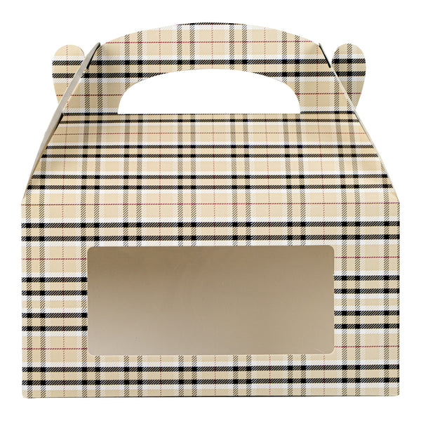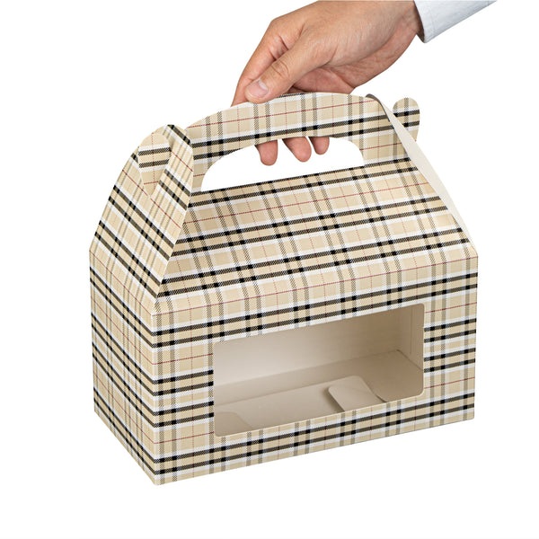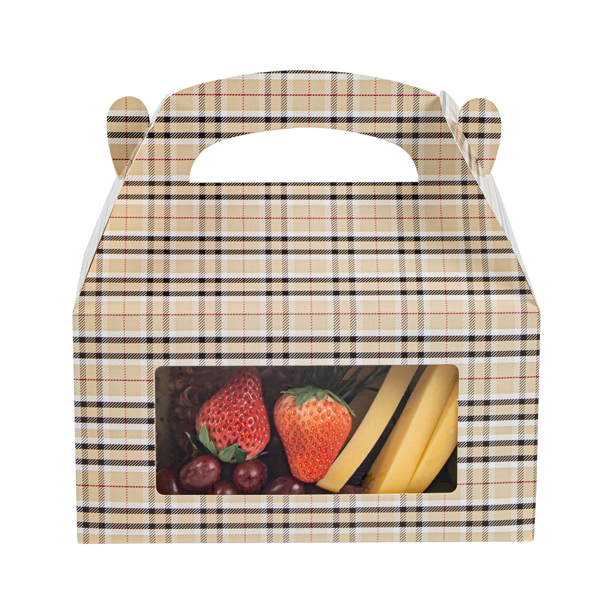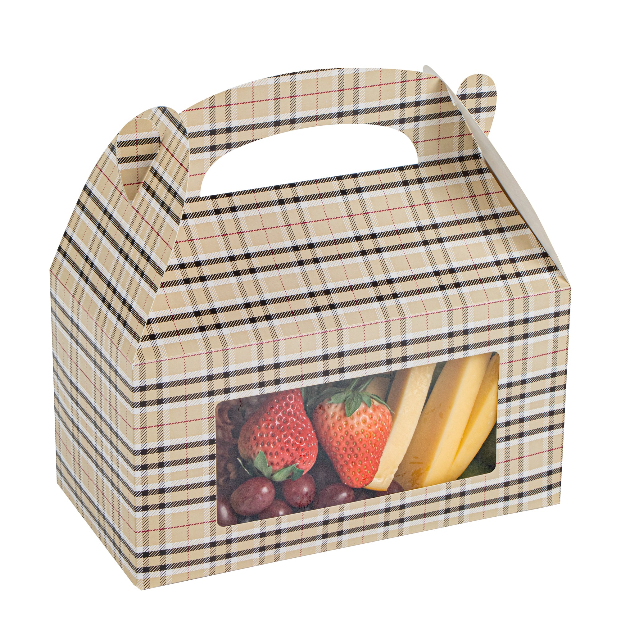 Enhance your presentation with appealing product visibility. Bio Tek Plaid Paper Gable Boxes / Take Out Containers, measuring 9.5 inches in length and crafted from sturdy paper, feature an integrated plastic window that provides an enticing sneak peek of your offerings to attract customers. The built-in handle of these gable gift boxes ensures comfortable transportation, making them ideal for catering events or bakery deliveries. Additionally, their freezer-safe design allows you to efficiently store treats, maintaining their freshness until they are ready to be served. These kraft paper favor boxes are not only stylish but also recyclable, supporting your commitment to sustainability. The versatile 9.5 inches by 5 inches by 5 inches dimensions make them ideal as tan cardboard gable boxes, suitable for a variety of goodies, from baked goods to gourmet snack. Sold in a 25 count box.